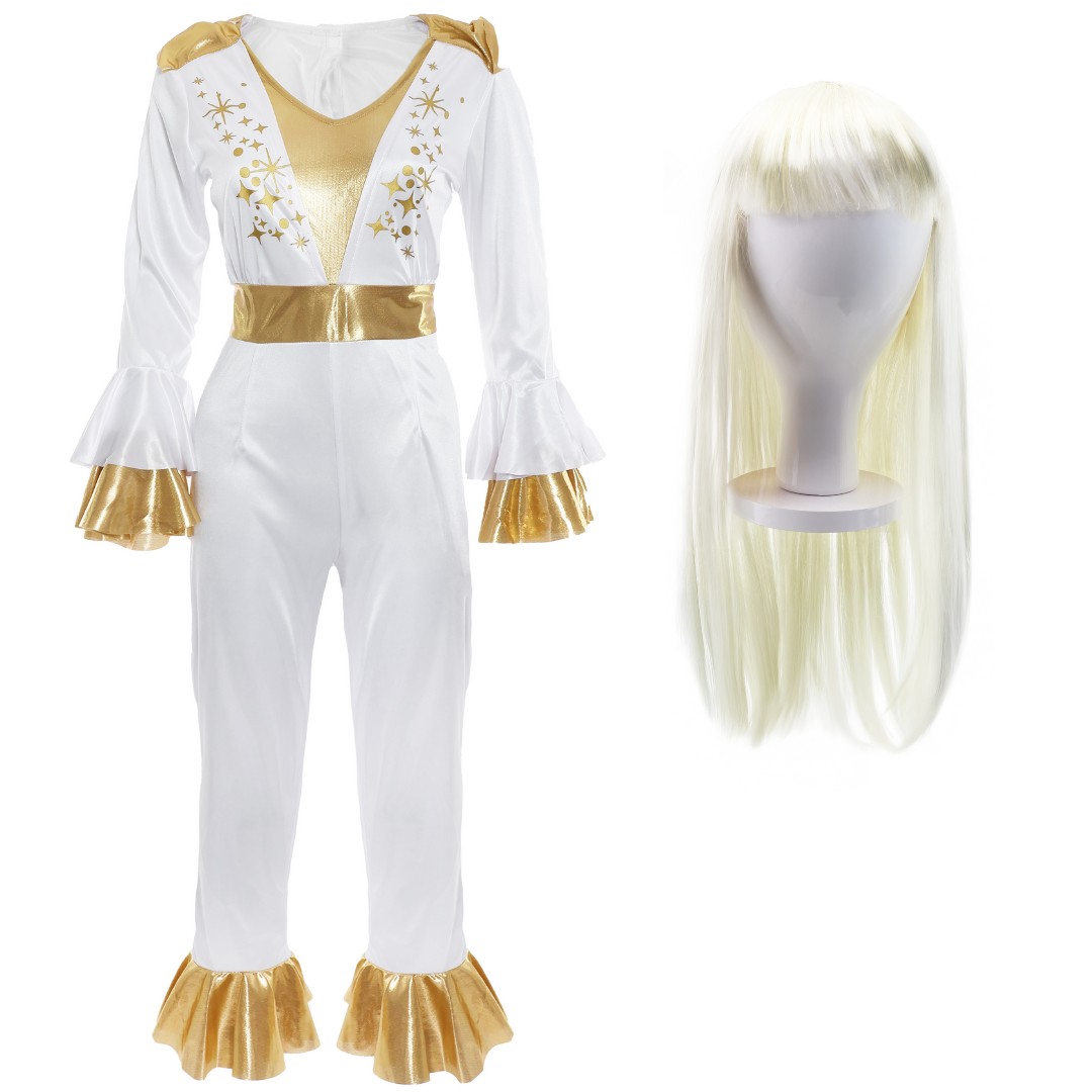 This glamorous Ladies 70’s Pop Queen Costume includes a long blonde wig with a fringe, a long-sleeved white outfit with gold flared cuffs, matching gold flares, and a simple gold waist tie belt, making it the perfect outfit for any 70’s themed event or music icon party!