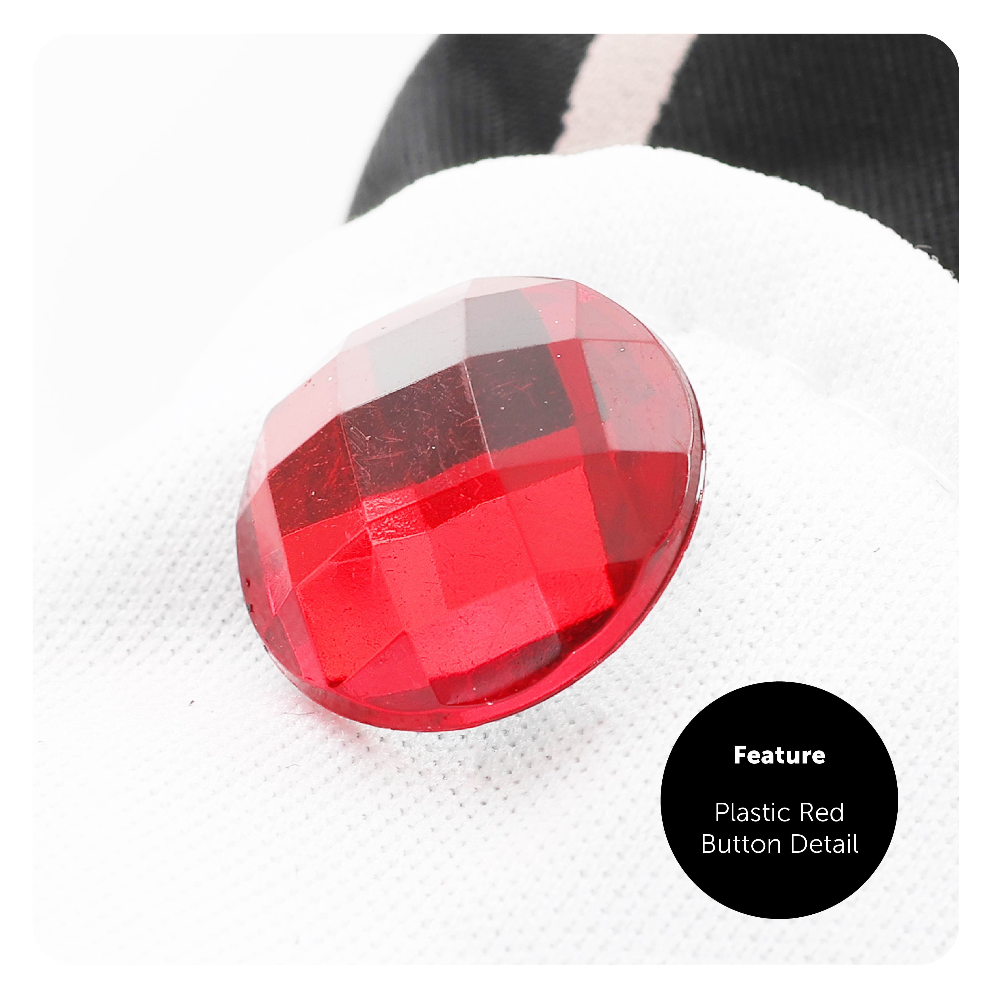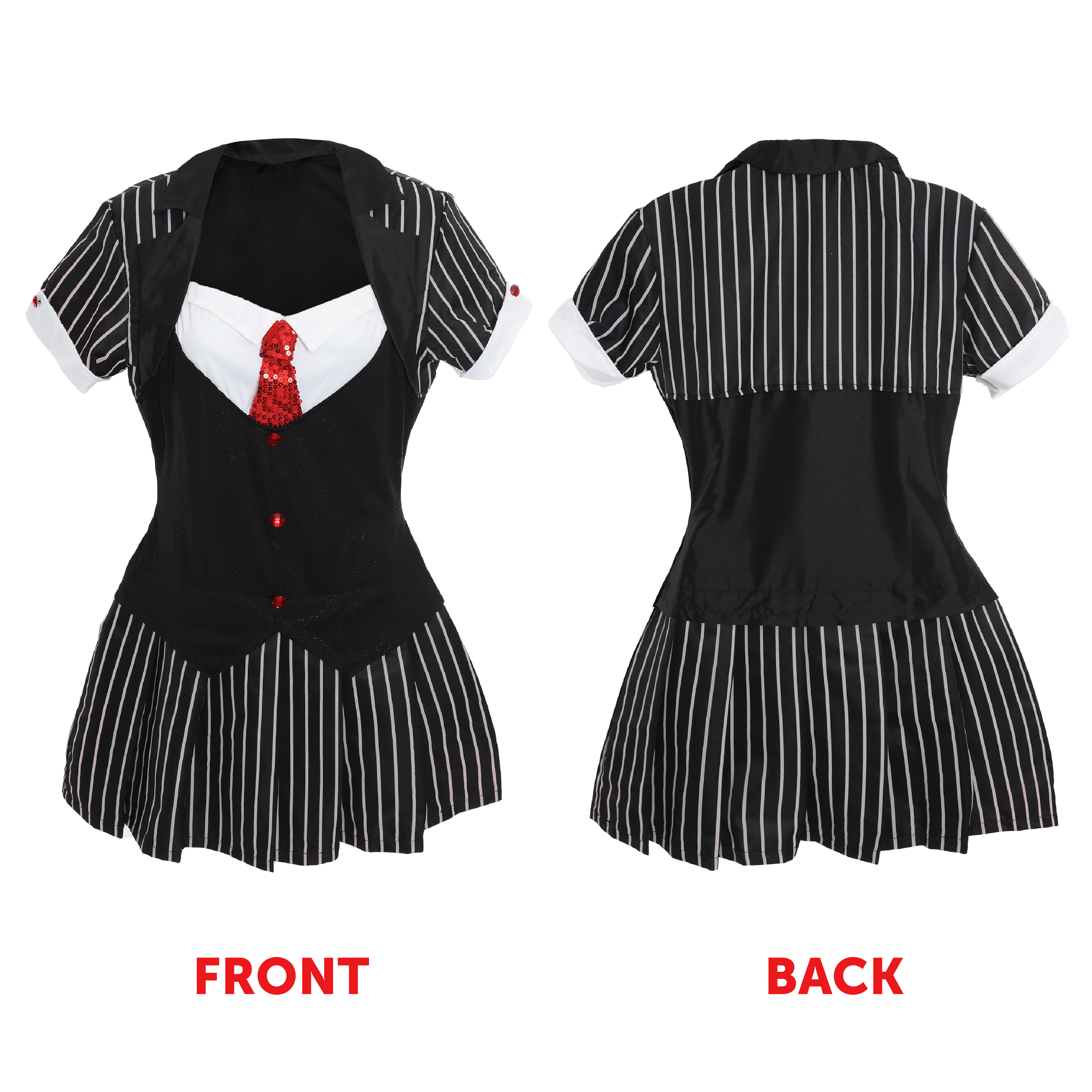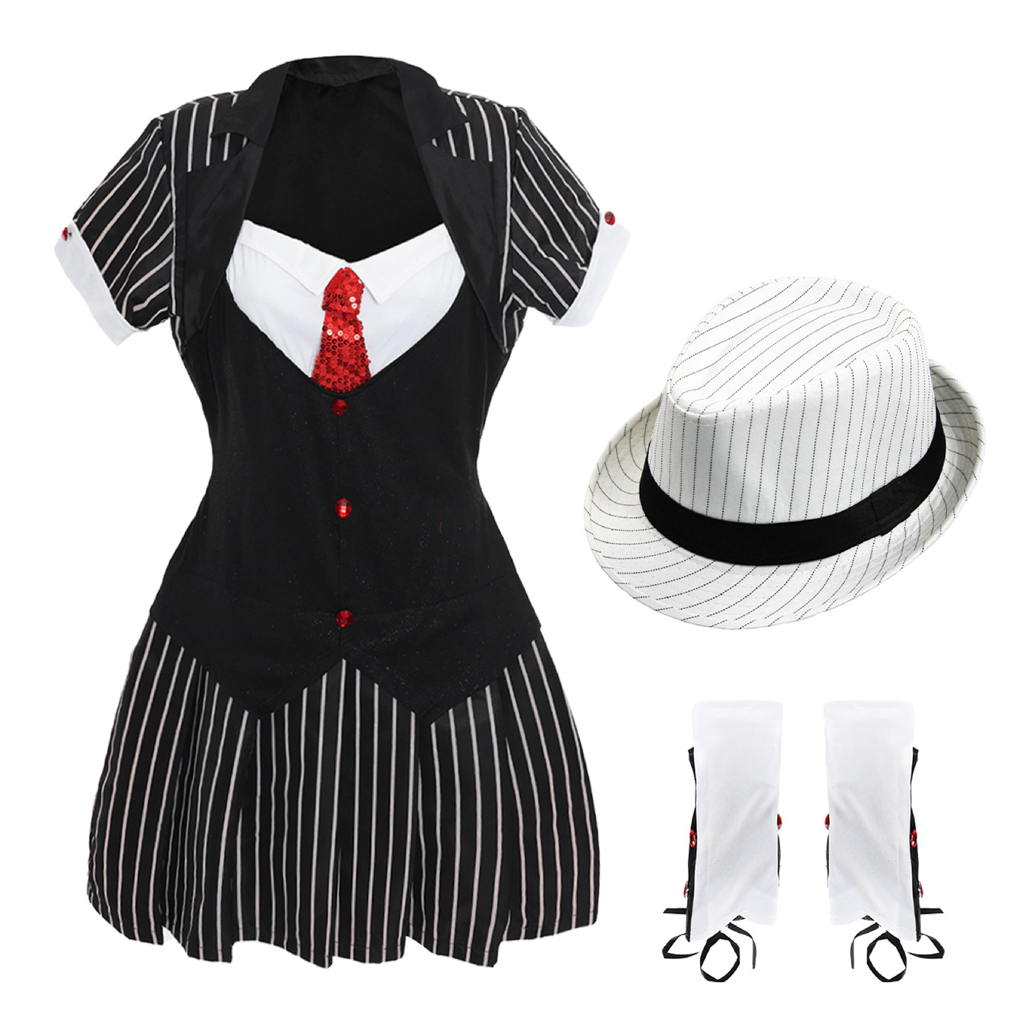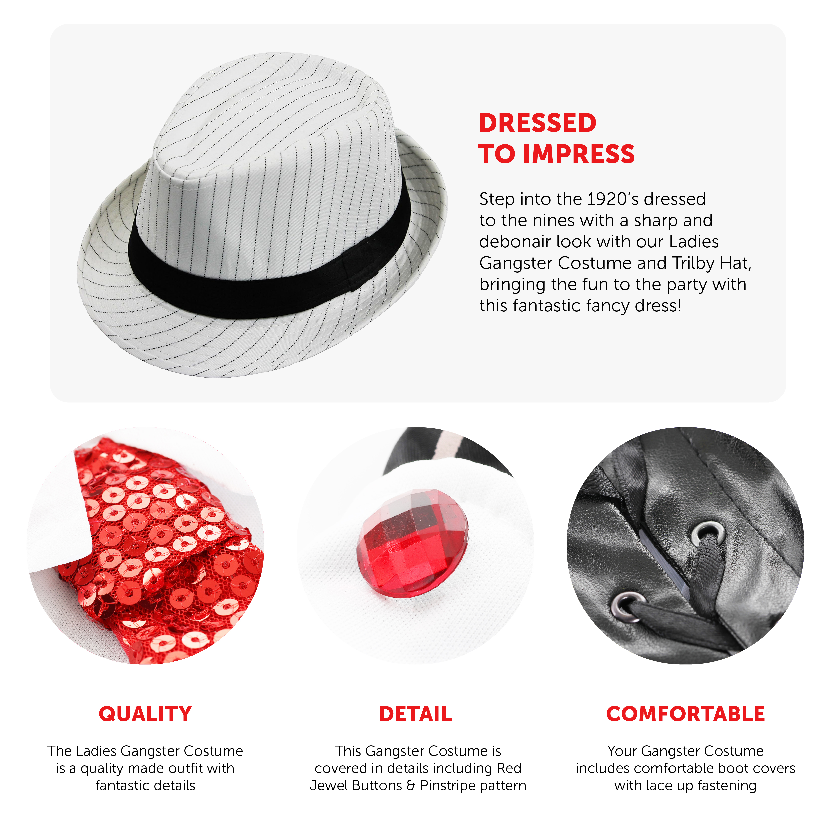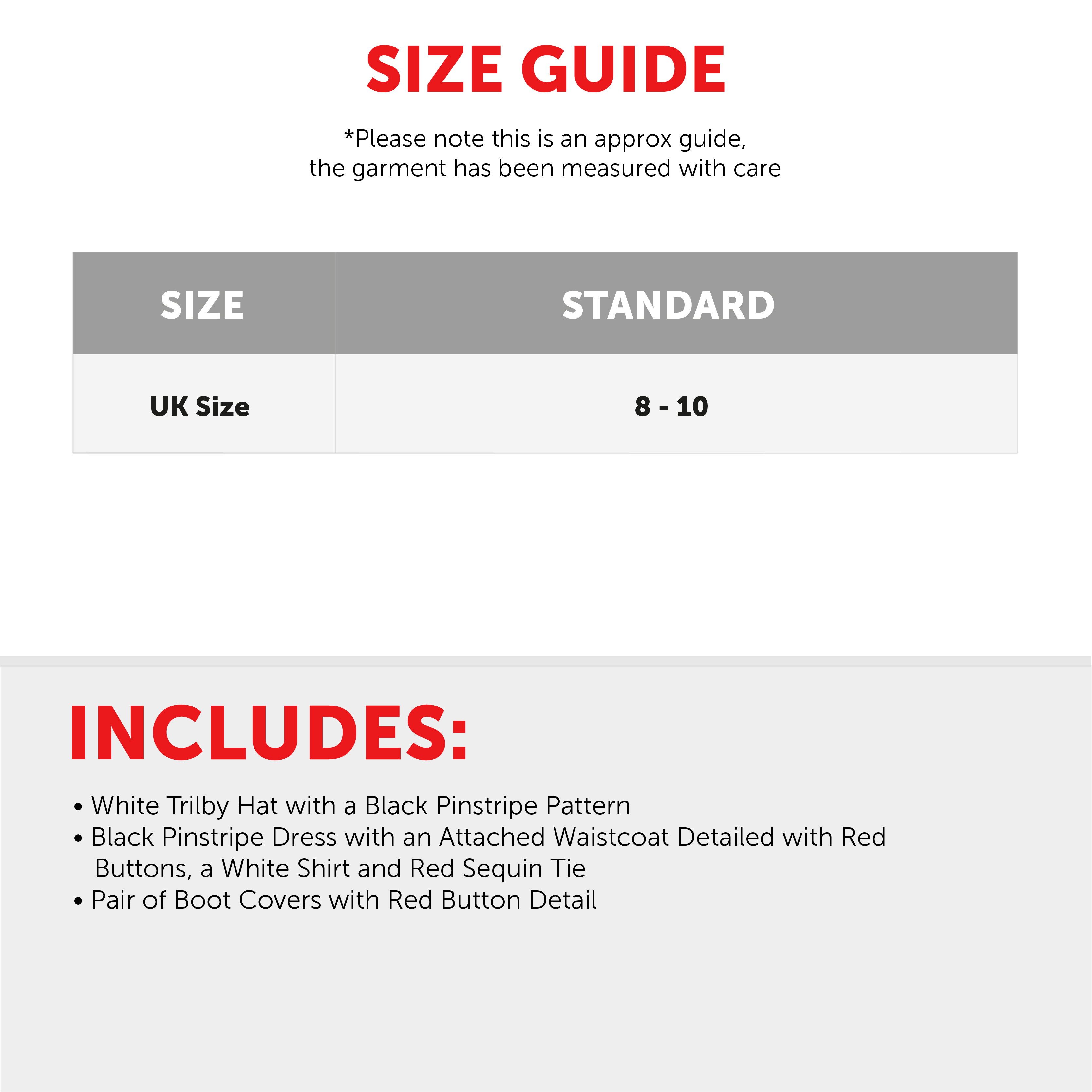 COSTUME INCLUDES: Your Ladies Gangster Costume includes a White Trilby Hat with a Black Pinstripe pattern, a Black Pinstripe Dress with an attached Waistcoat detailed with Red Buttons, White Shirt and Red Sequin Tie, and a pair of Boot Covers with a lace up design and Red Buttons down the side, a great look for any event!