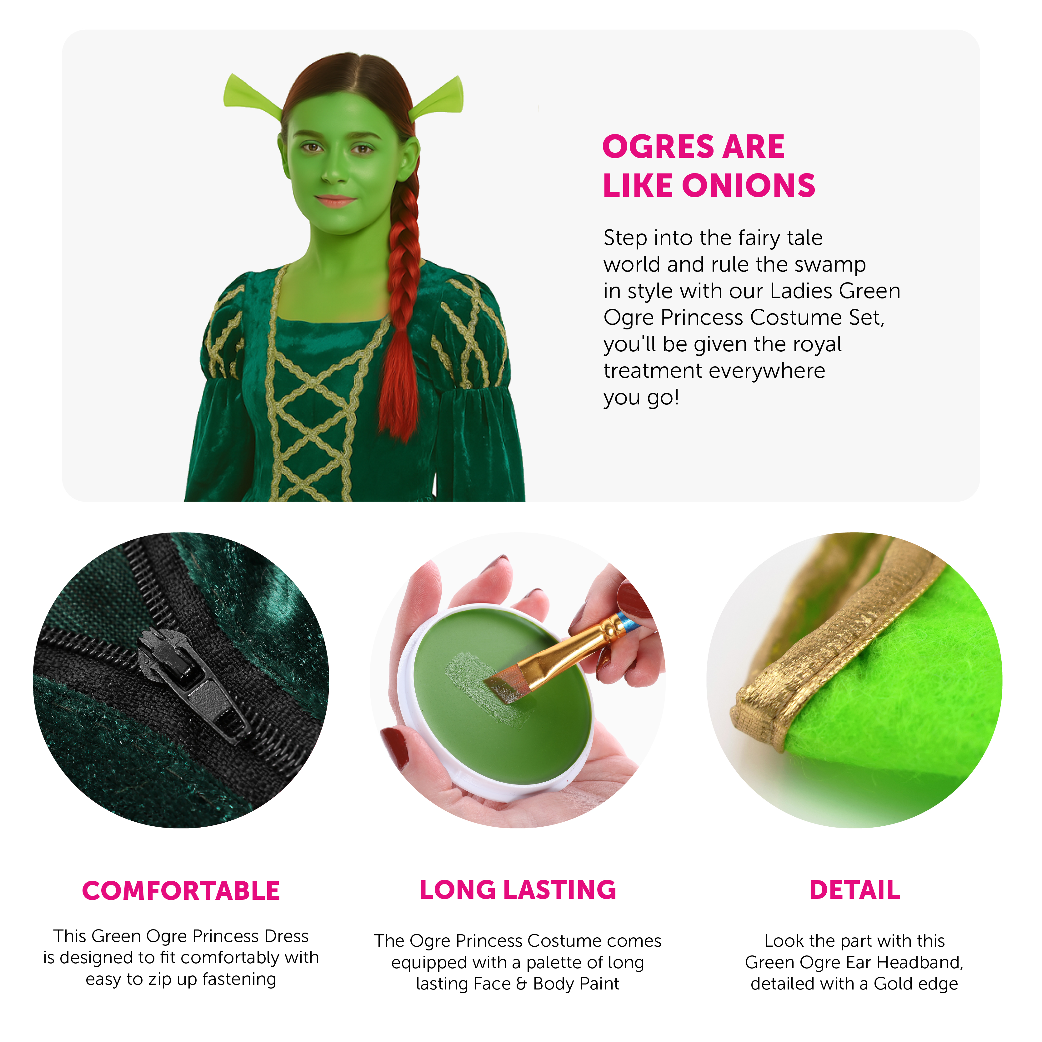 SET INCLUDES: This Ladies Green Ogre Princess Costume Set includes Green Ogre Ear Headband, a Red Plait Wig, a Long Green Velour Dress with easy zip fastening, a pair of Plain Green Tights, and a palette of Green face paint, to help you finish off your desired look!