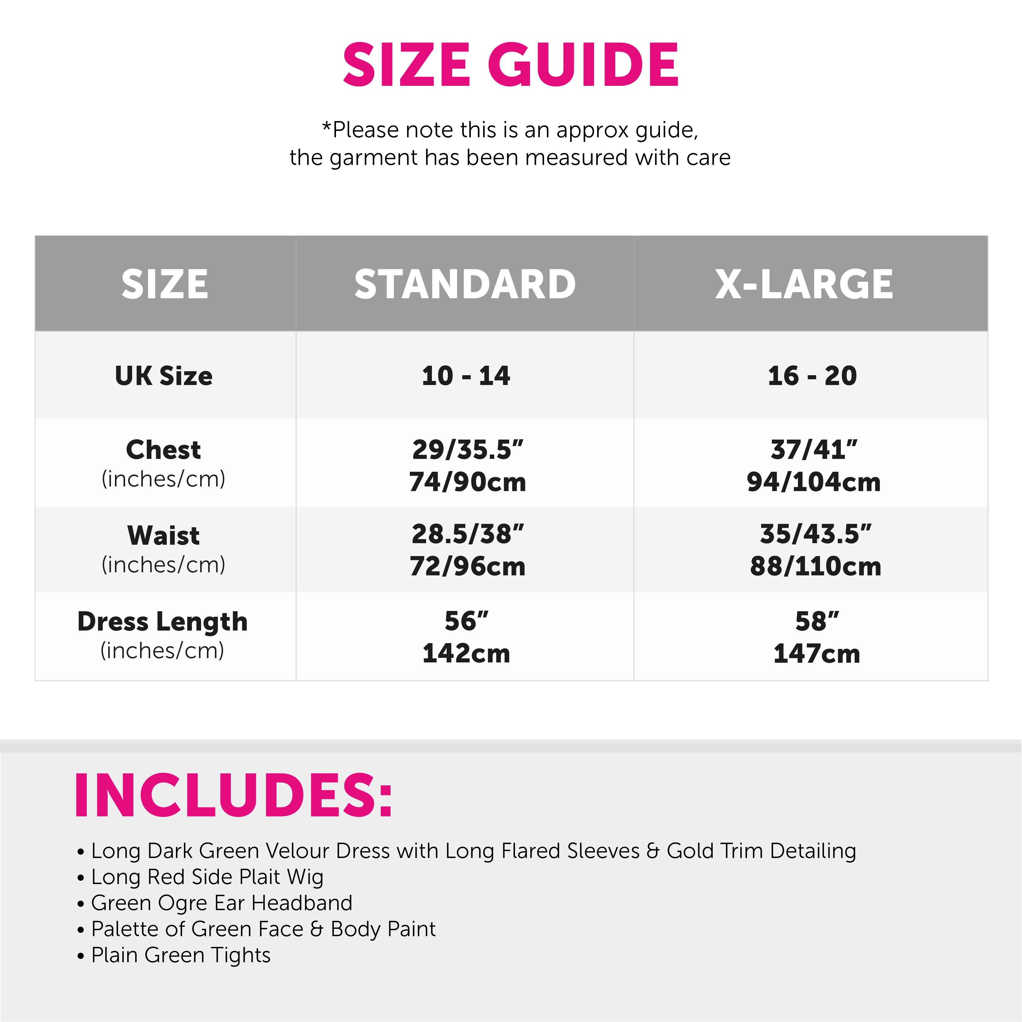 AVAILABLE IN TWO SIZES: This Ladies Green Ogre Princess Costume is available in two sizes, Standard & X-Large, perfect for you to find the right fit; Standard - Chest 29/35.5" (74/90cm), Waist 28.5/38" (72/96cm), Dress Length 56" (142cm) | X-Large - Chest 37/41" (94/104cm), Waist 35/43.5" (88/110cm), Dress Length 58" (147cm)