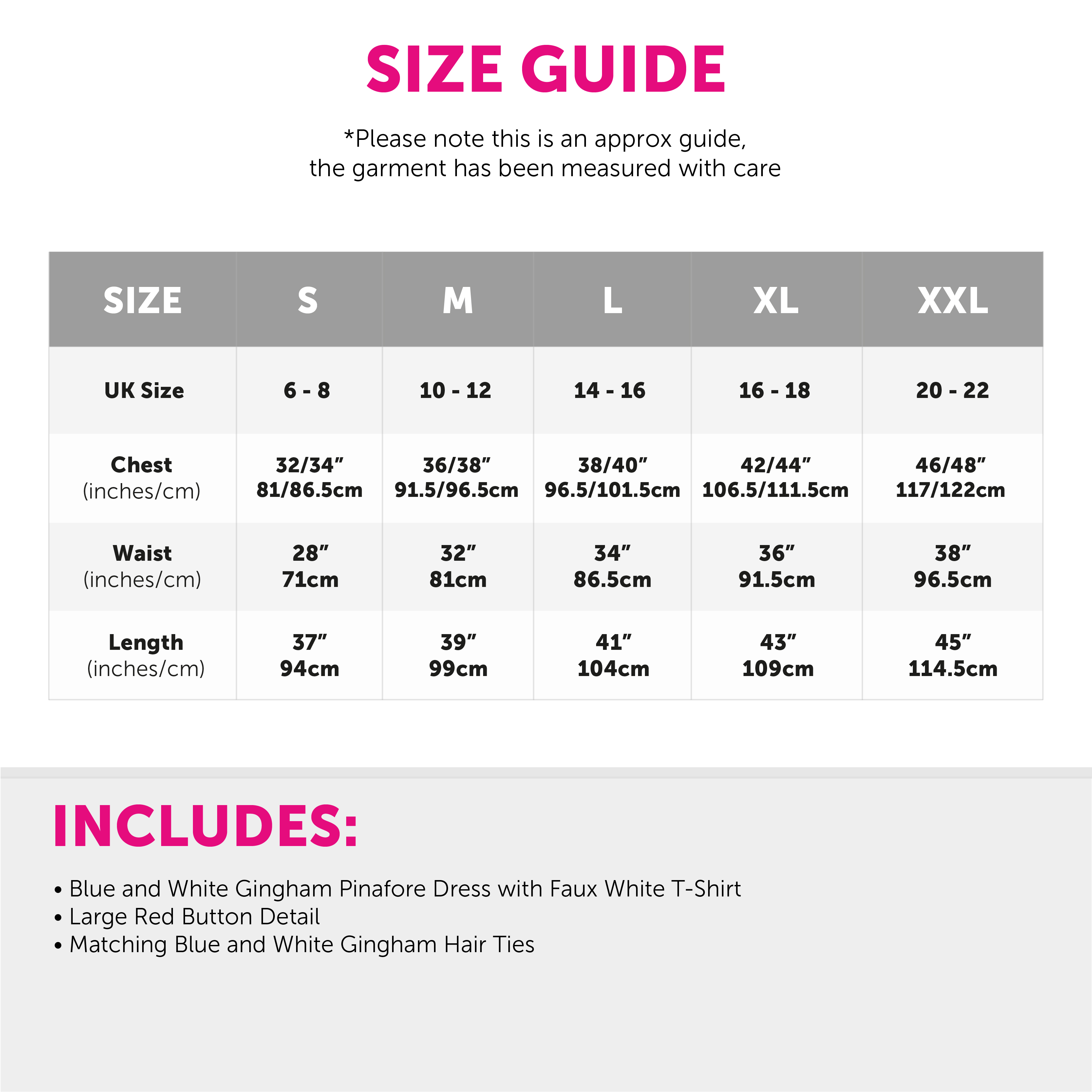 AVAILABLE IN MULTIPLE SIZES: This Ladies Kansas Girl Costume is available in multiple sizes from Small – X-Large: Small: Chest: 32-34"/81-86.5cm - Waist: 28"/71cm - Length: 37"/94cm - Dress Size: UK 6/8