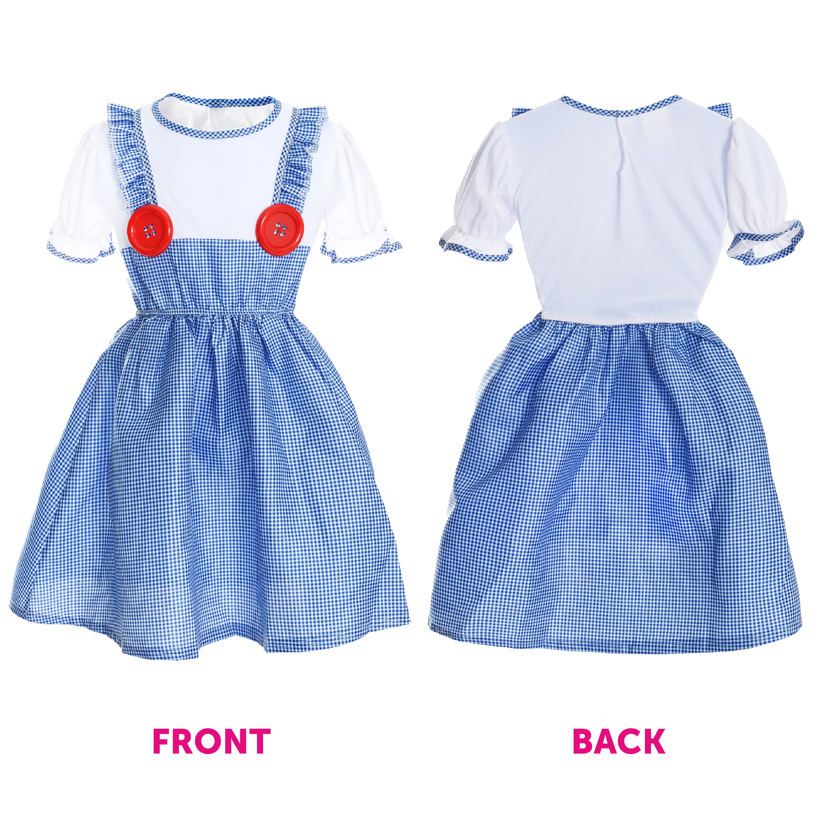 COSTUME INCLUDES: Our Kansas Girl Costume includes A Blue and White Gingham Pinafore Dress with Faux White T-Shirt Design, with Large Red Plastic Buttons Detailing on the straps and Matching Gingham Hair Ties!