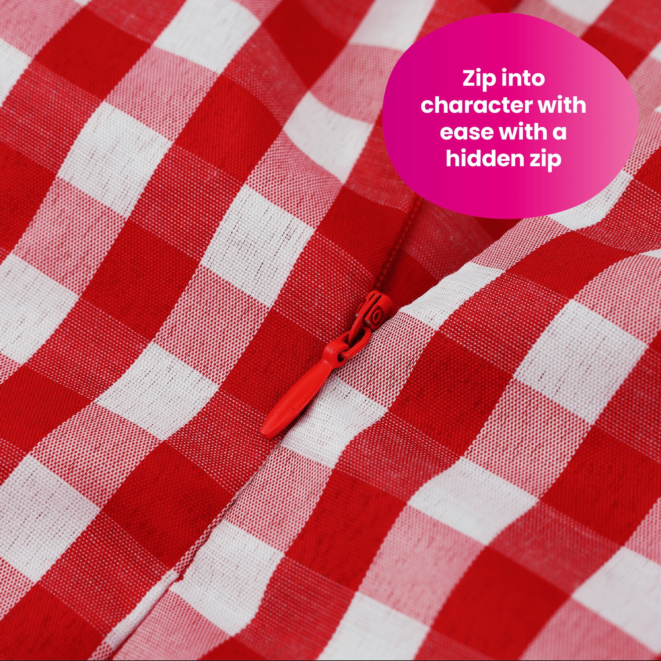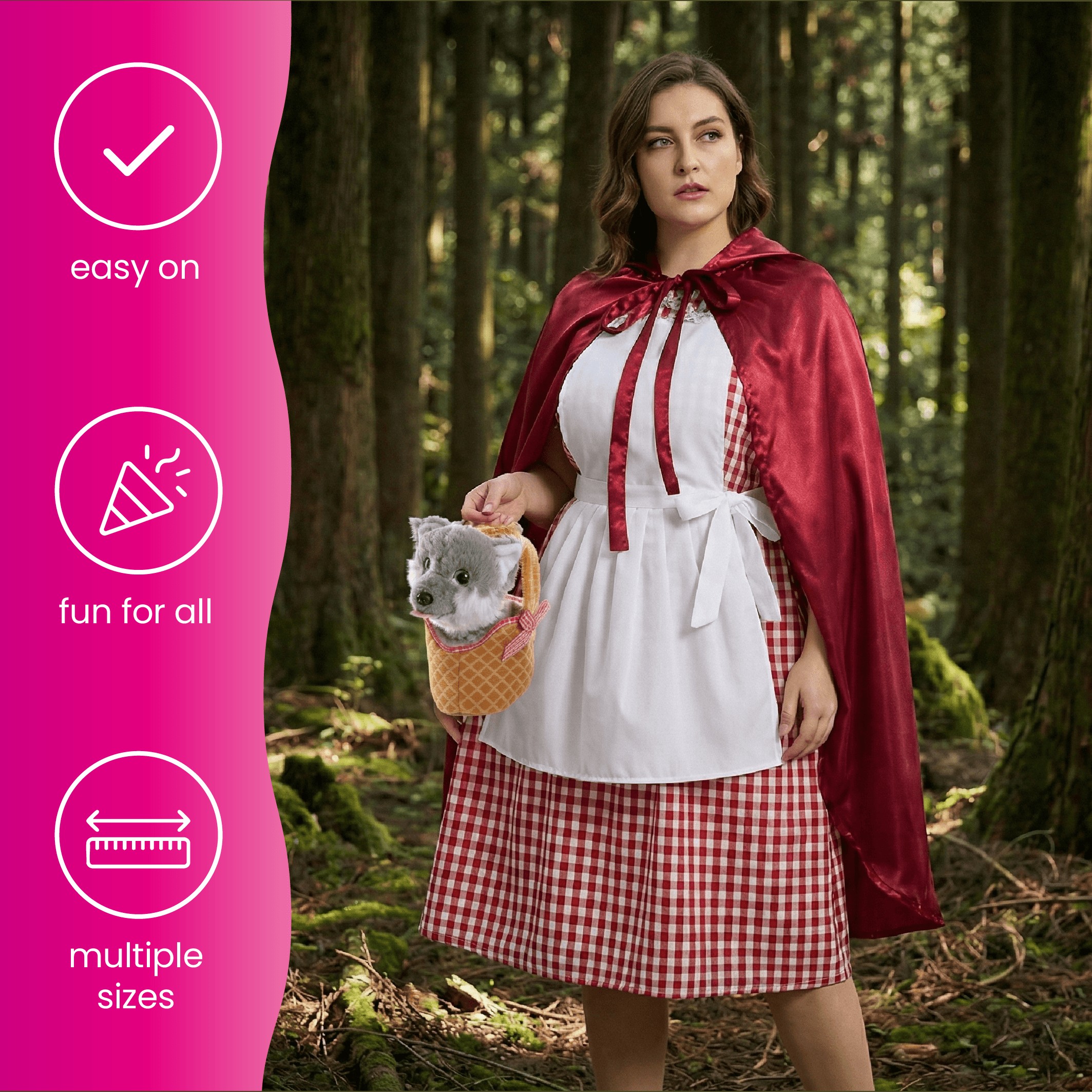 Complete your fairy-tale adventure with the included Soft Gingham Basket and Plush Wolf. The soft brown basket features a red gingham lining inside and a decorative bow on the side, designed to perfectly complement your Little Red Riding Hood look. Inside sits a removable Grey Plush Wolf — a cute, lightweight companion you can carry along or display as part of your costume.