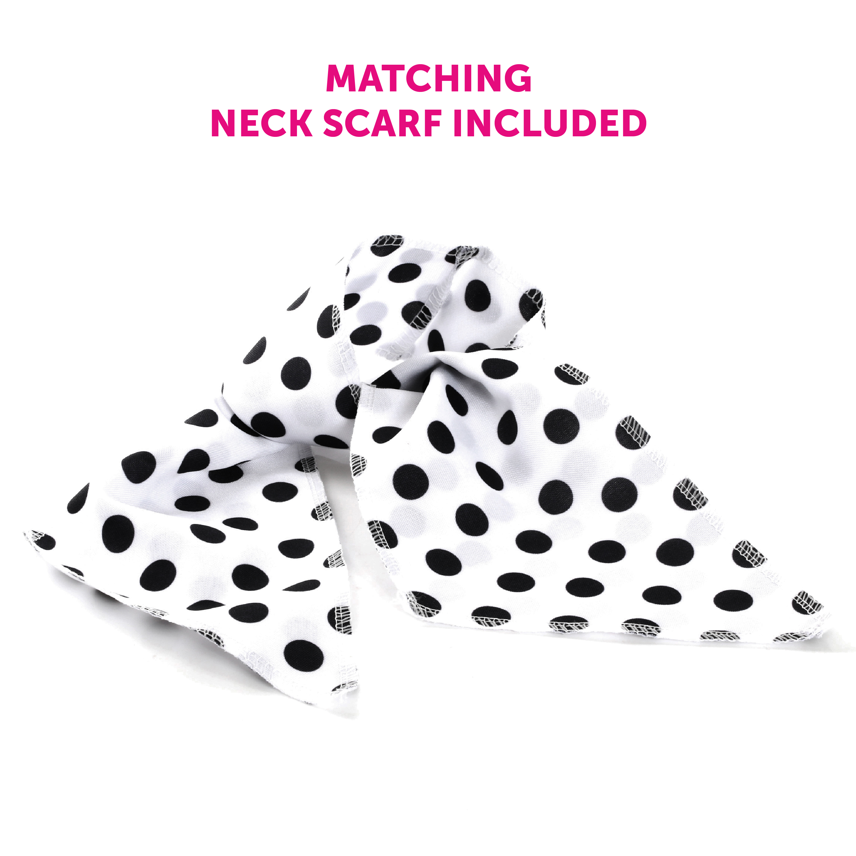 OUTFIT DETAILS: Your Ladies Polka Dot Skirt includes a Short White Skirt covered in a Black Polka Dot pattern and a matching Polka Dot Scarf to complete your look!