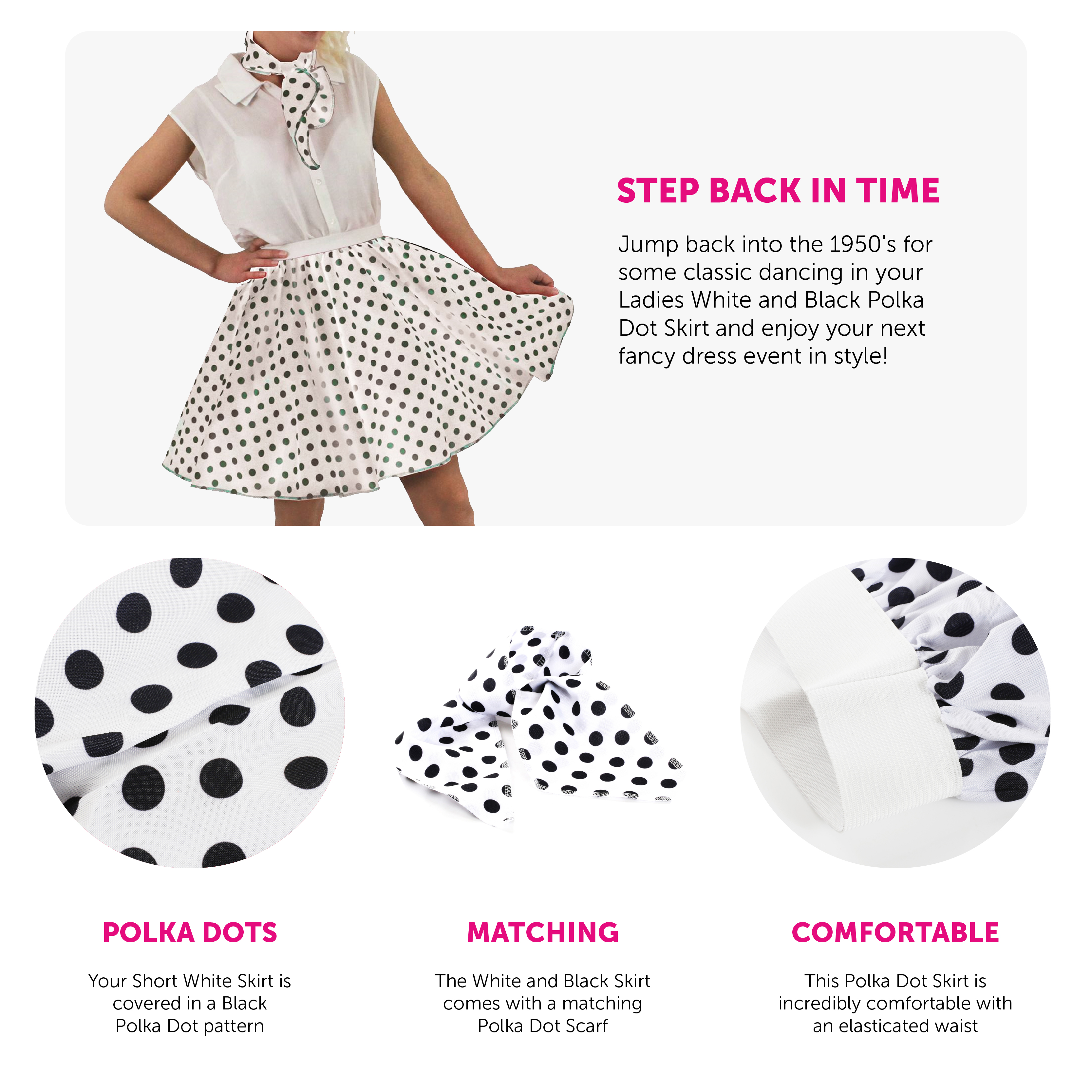LADIES WHITE & BLACK POLKA DOT SKIRT: Jump back into the 1950's for some classic dancing in your Ladies White and Black Polka Dot Skirt and enjoy your next fancy dress event in style!