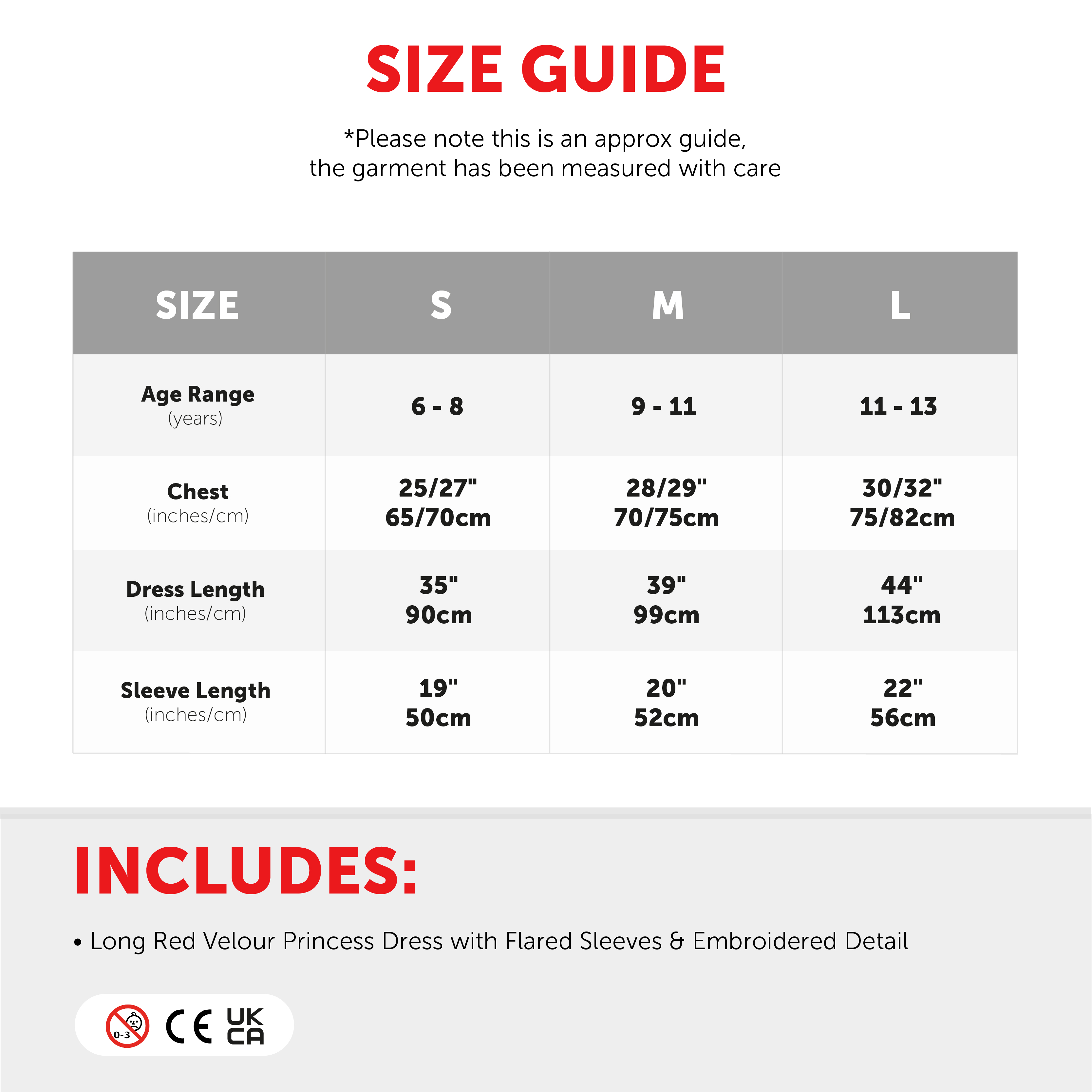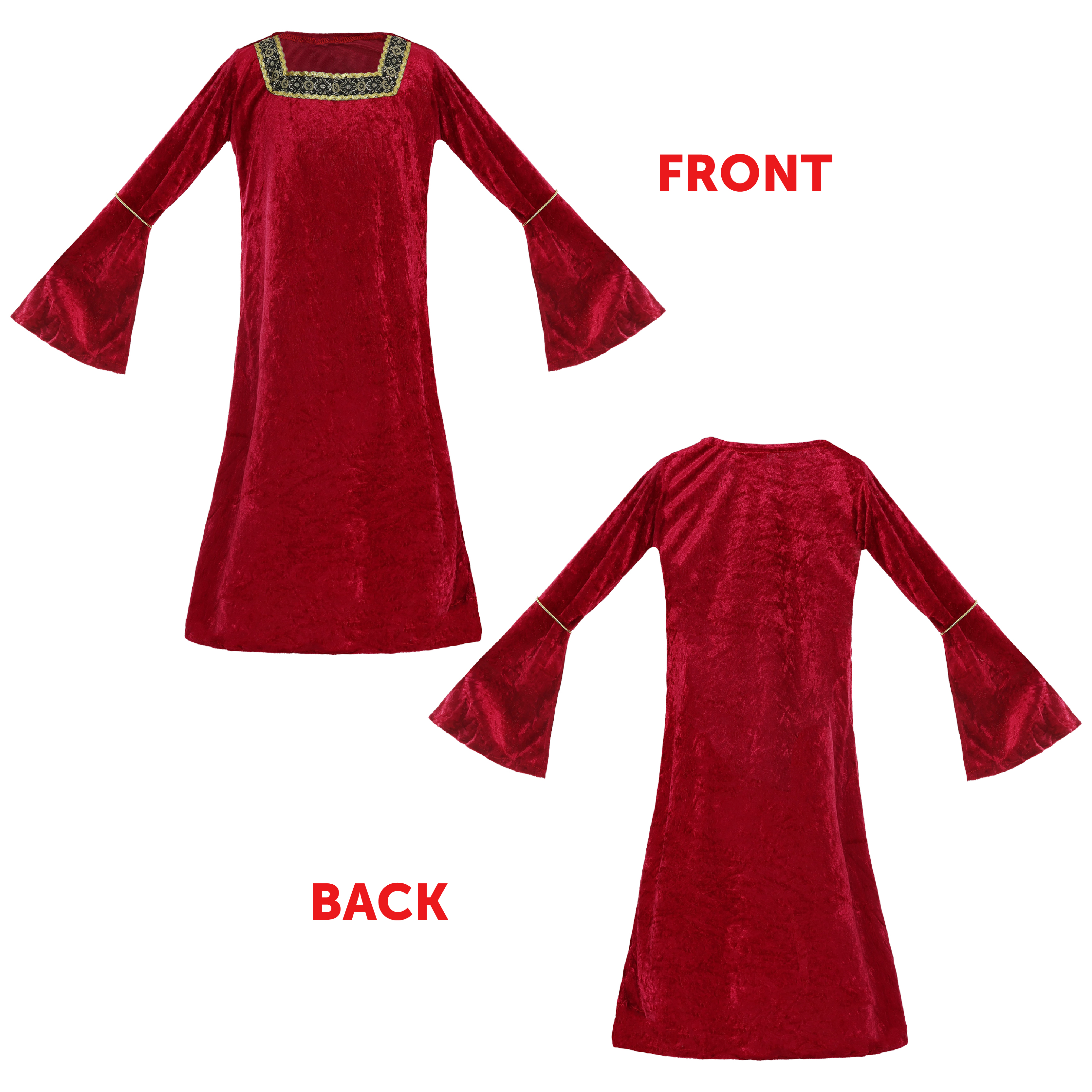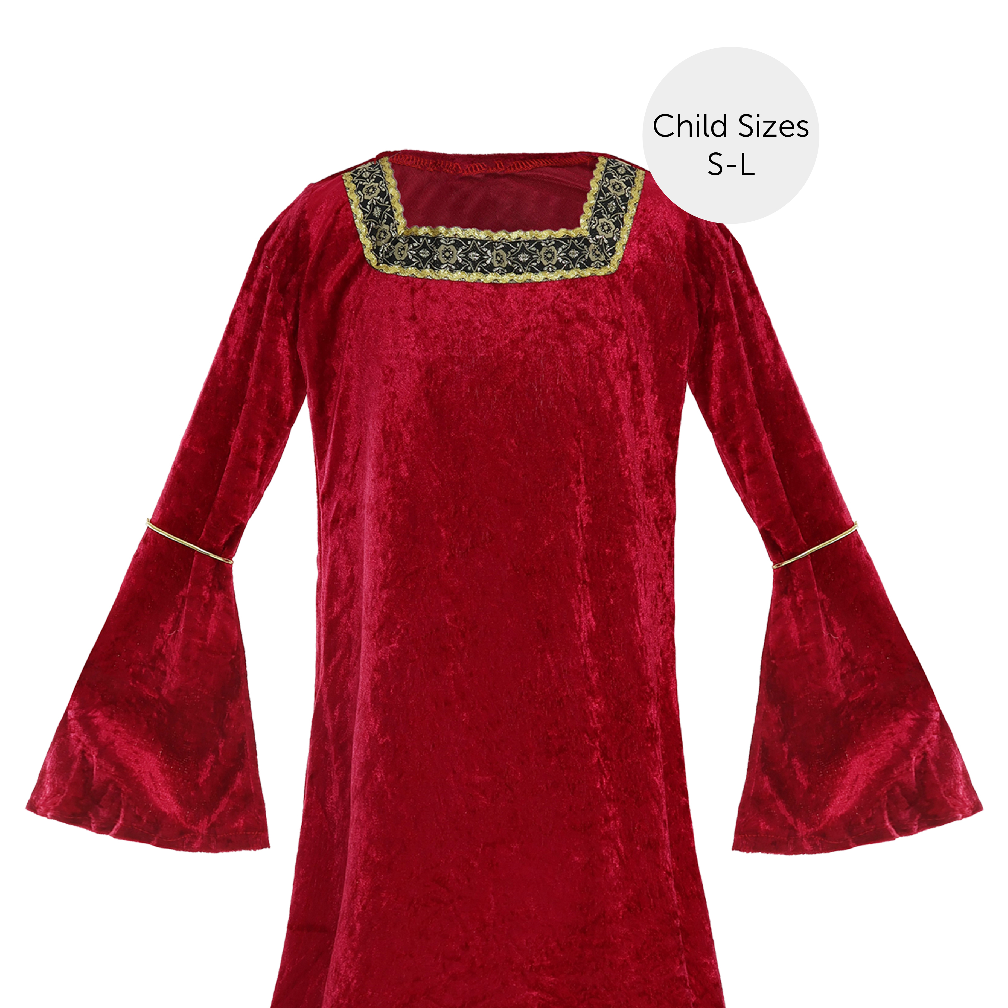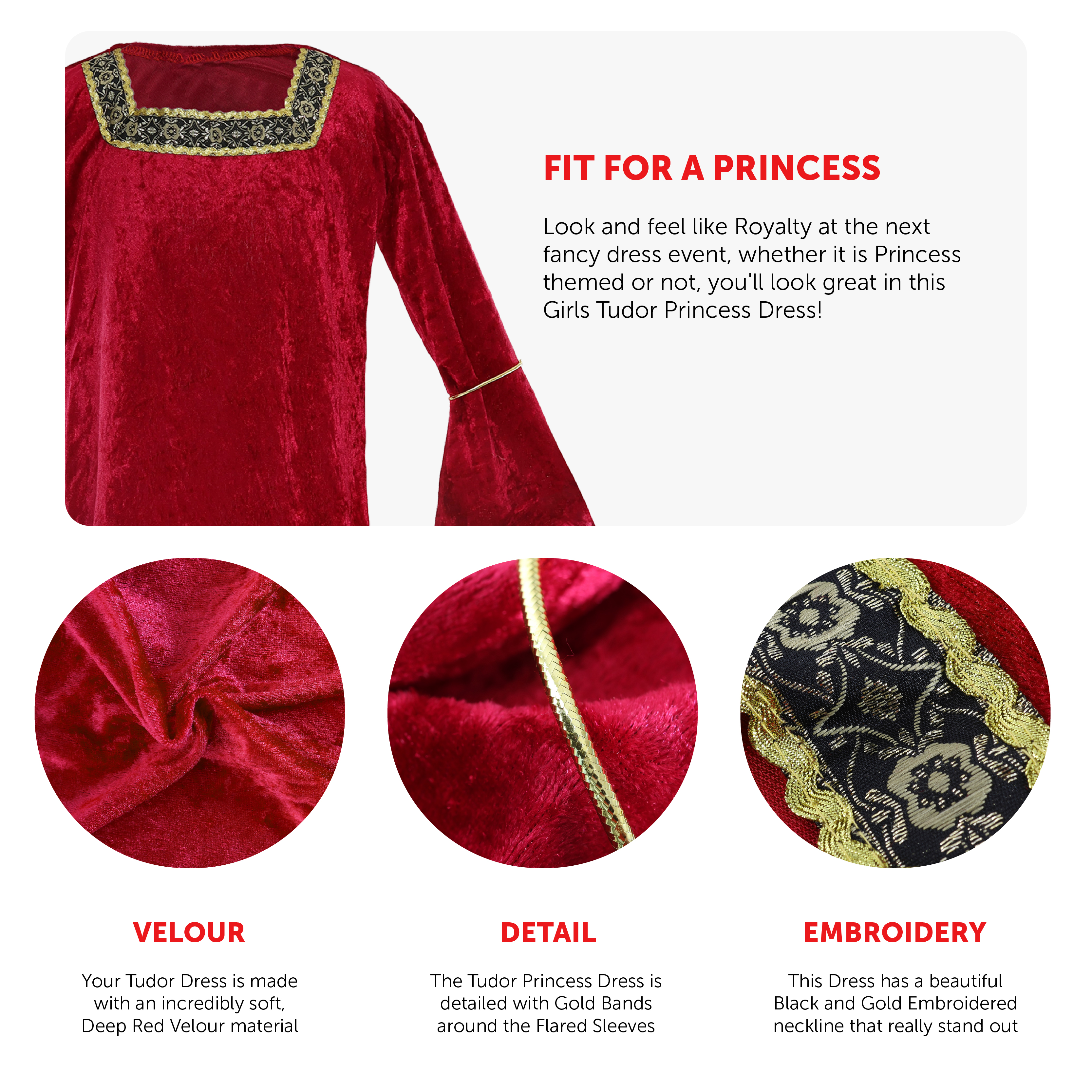 TUDOR DRESS DETAILS: Your Girls Tudor Princess Dress is a Long, Deep Red Velour Dress with Long Flared Sleeves, Gold Band detail around the Sleeves and a detailed Black and Gold embroidered Neckline, the perfect Princess Dress!