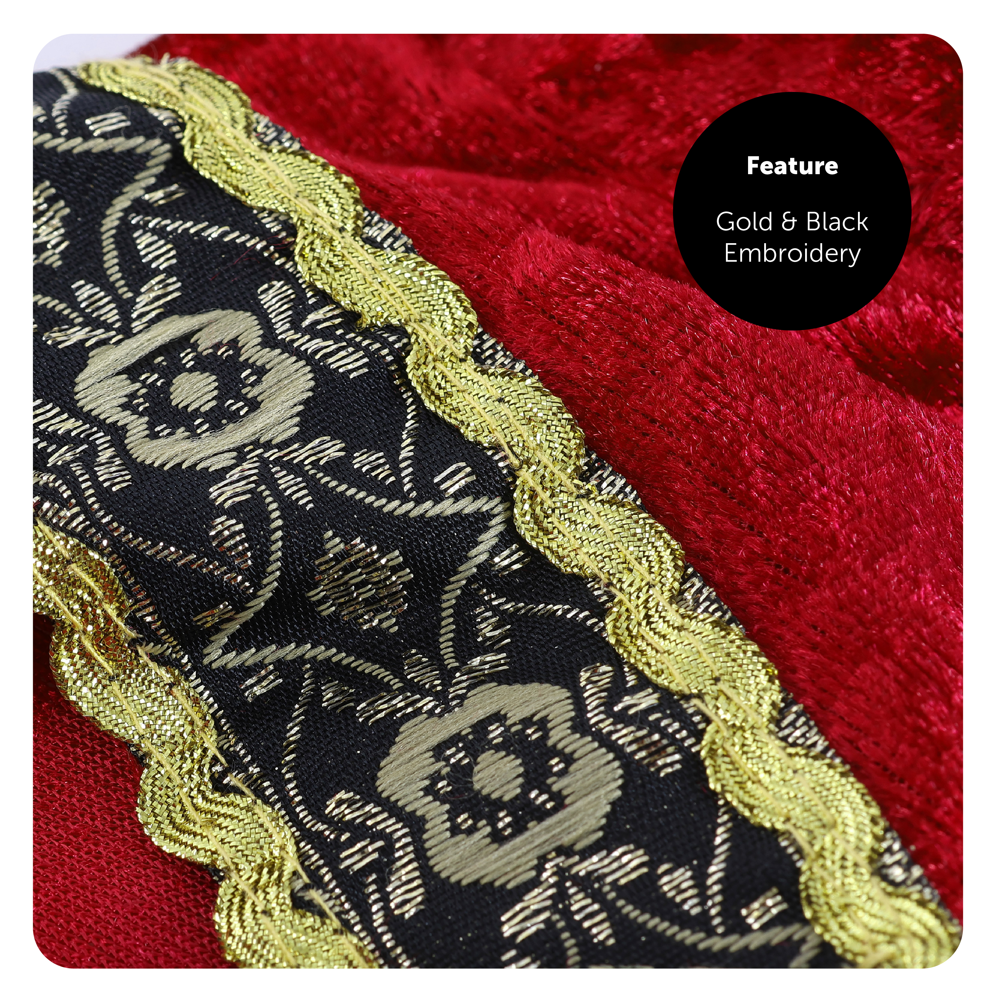 QUALITY DESIGN: This Tudor Princess Dress is a quality made costume piece, made with a Deep Red Velour material, detailed with Black and Gold Embroidery and Gold Bands around the Sleeves!