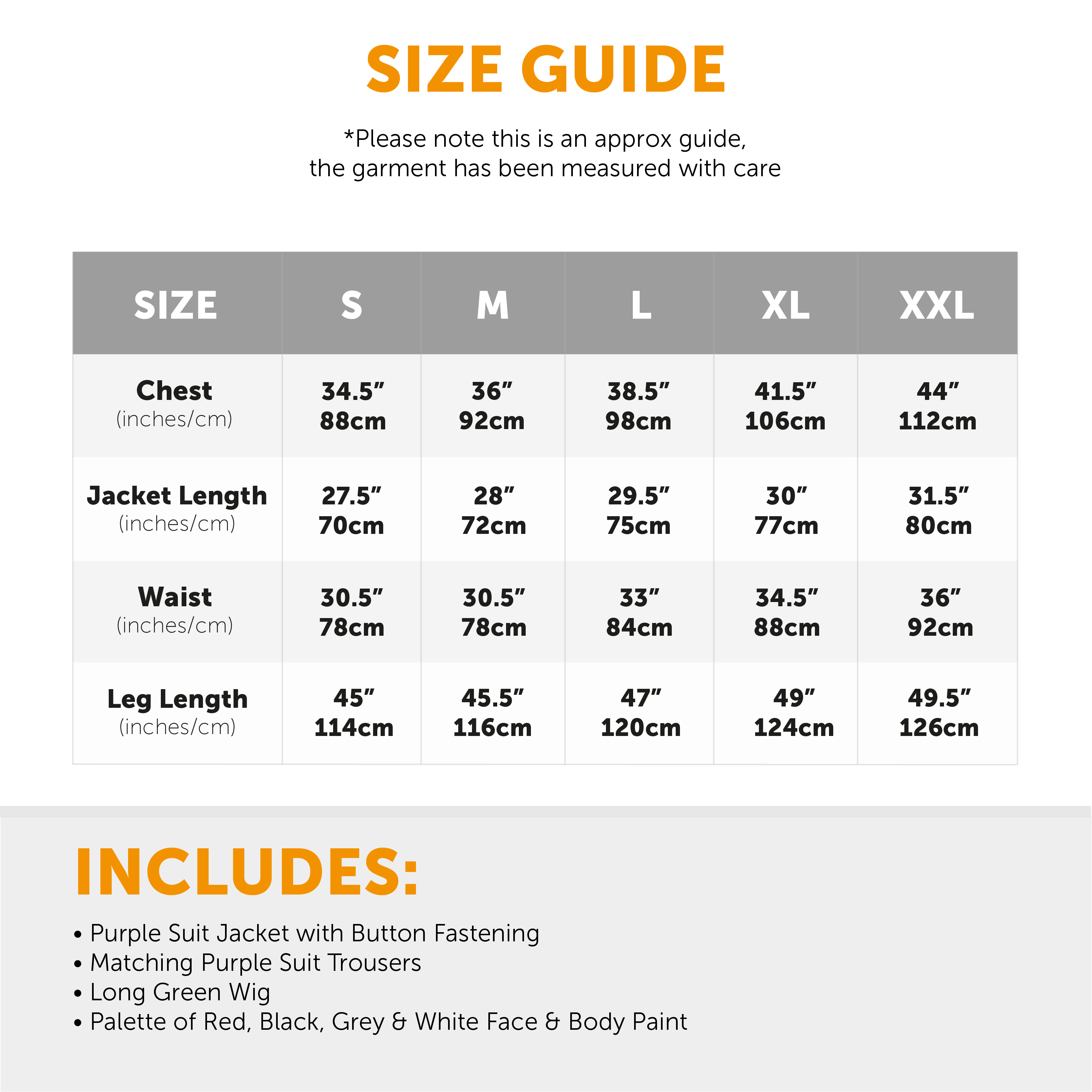 COSTUME INCLUDES: This Adults Clown Villain Costume includes a long, slicked-back Green Wig, a palette of Face and Body Paint, and a Purple Suit Jacket with matching Trousers, the perfect Costume for Halloween and other fancy dress themed events!