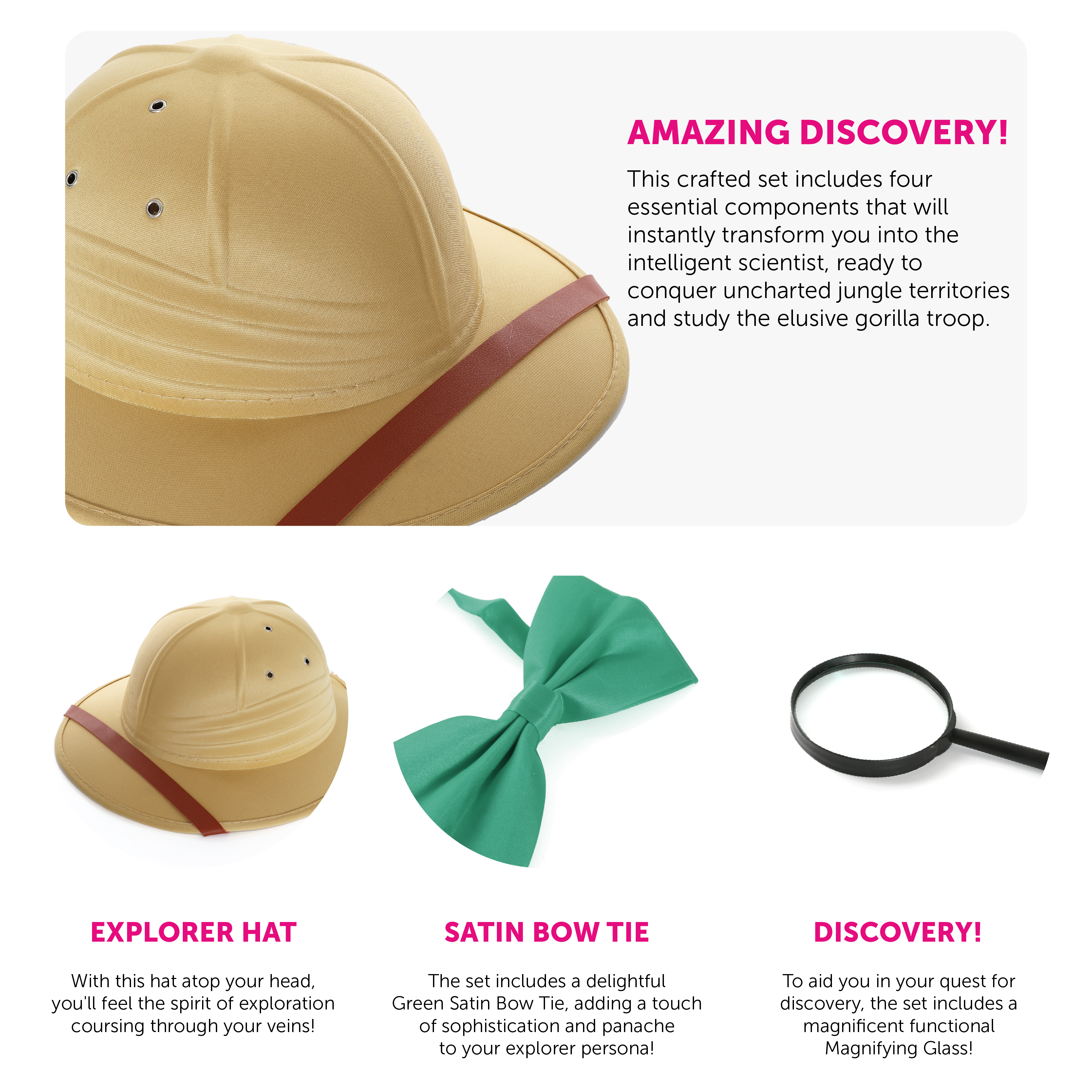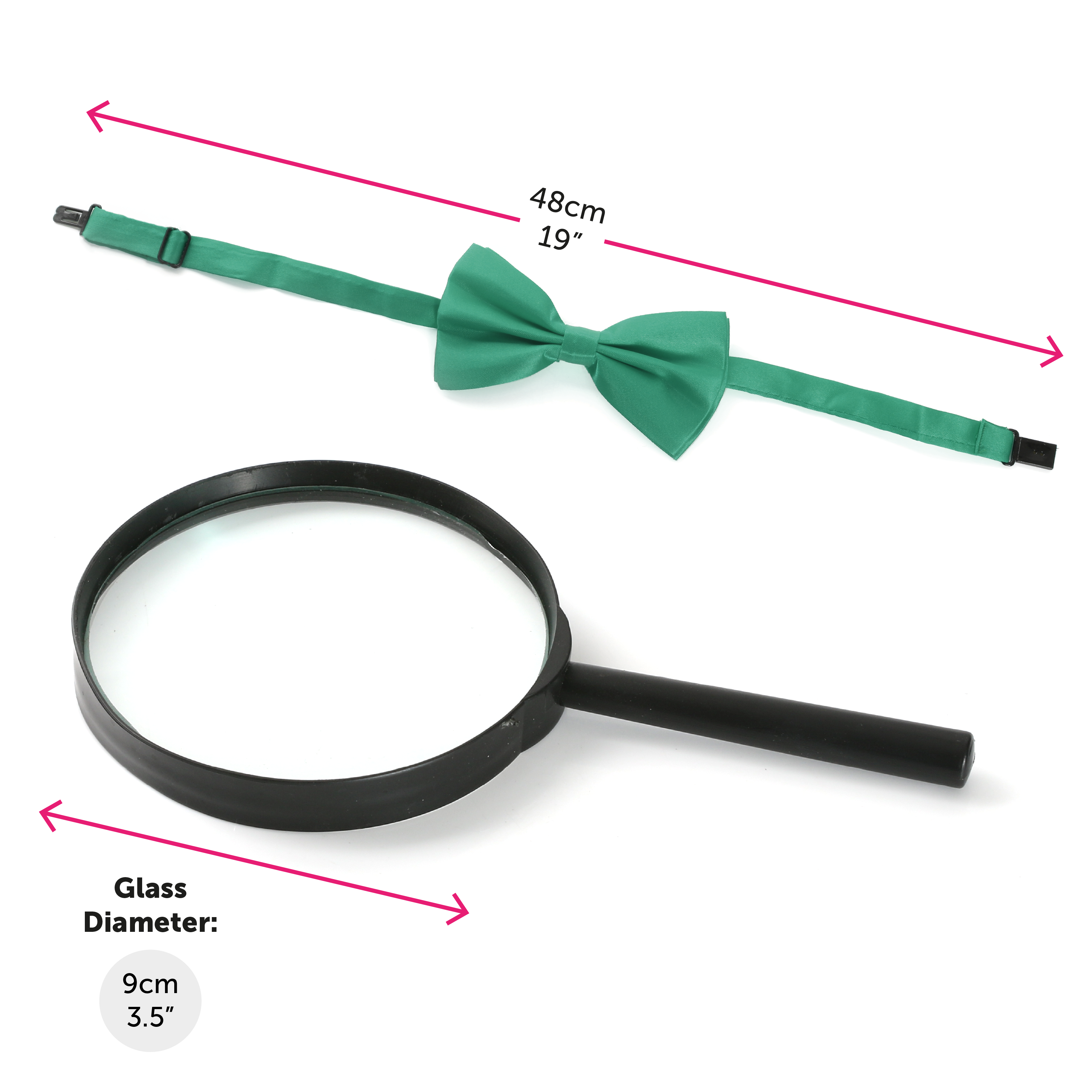 ACCESSORY SET INCLUDES: Your Old Scientist Explorer Accessory Set includes a sandy coloured elasticated Explorer's Hat, a Satin Green Bow Tie with clip up fastening, a fully functioning Magnifying Glass with clear Glass and a Black plastic frame, and an adhesive Black Moustache with grey hairs, the perfect accessories for your movie themed Costume!