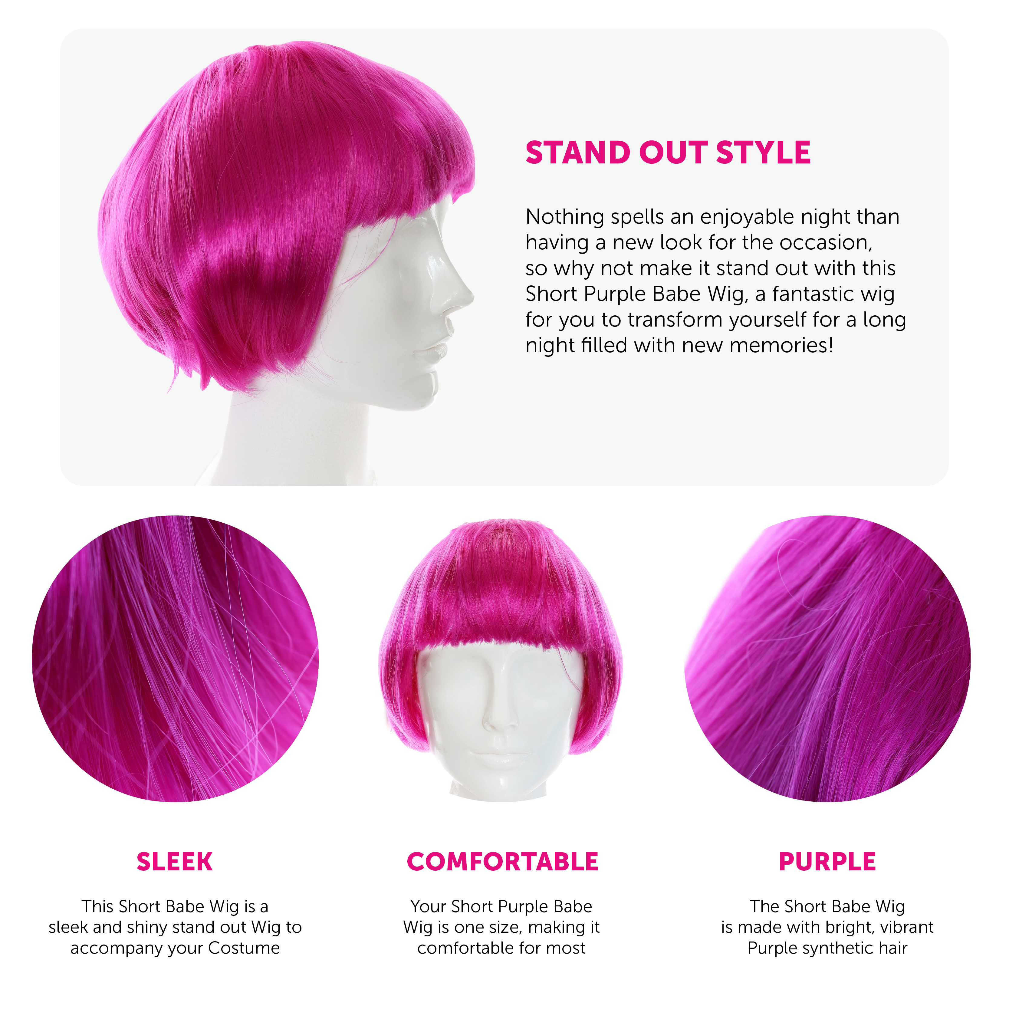 PERFECT FOR FANCY DRESS AND CASUAL EVENTS: Whether you are looking to finish off a regular Fancy Dress outfit, or to dress up for a big Hen-do night party or event, you can be sure to count on the Short Purple Babe Wig for making some great memories!