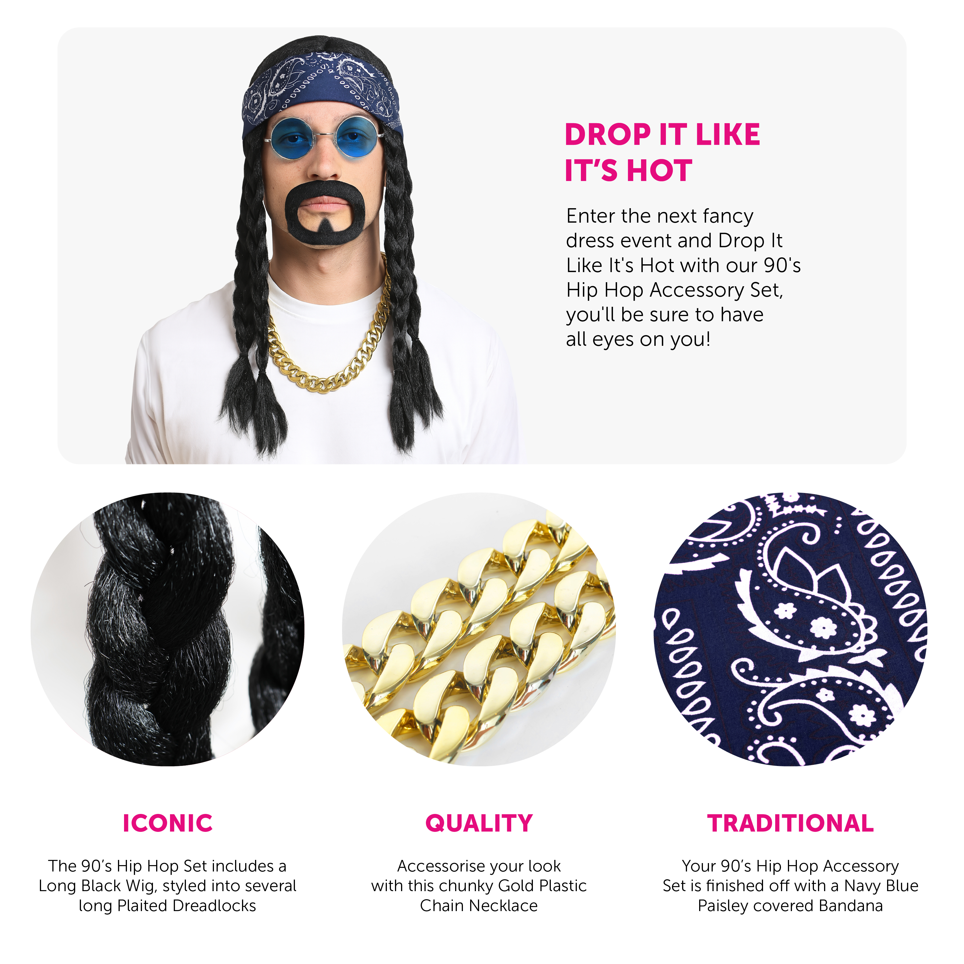 90'S HIP HOP ACCESSORY SET: Enter the next fancy dress event and Drop It Like It's Hot with our 90's Hip Hop Accessory Set, you'll be sure to have all eyes on you!