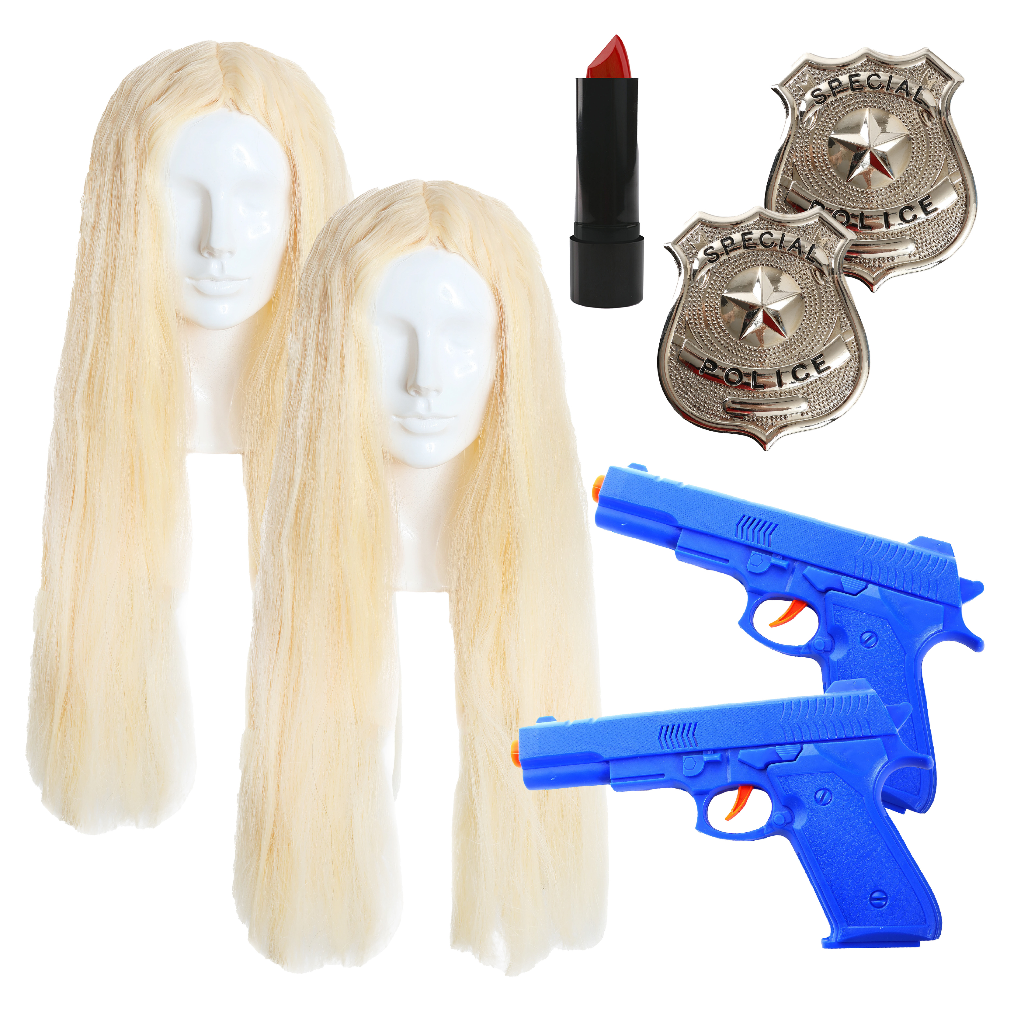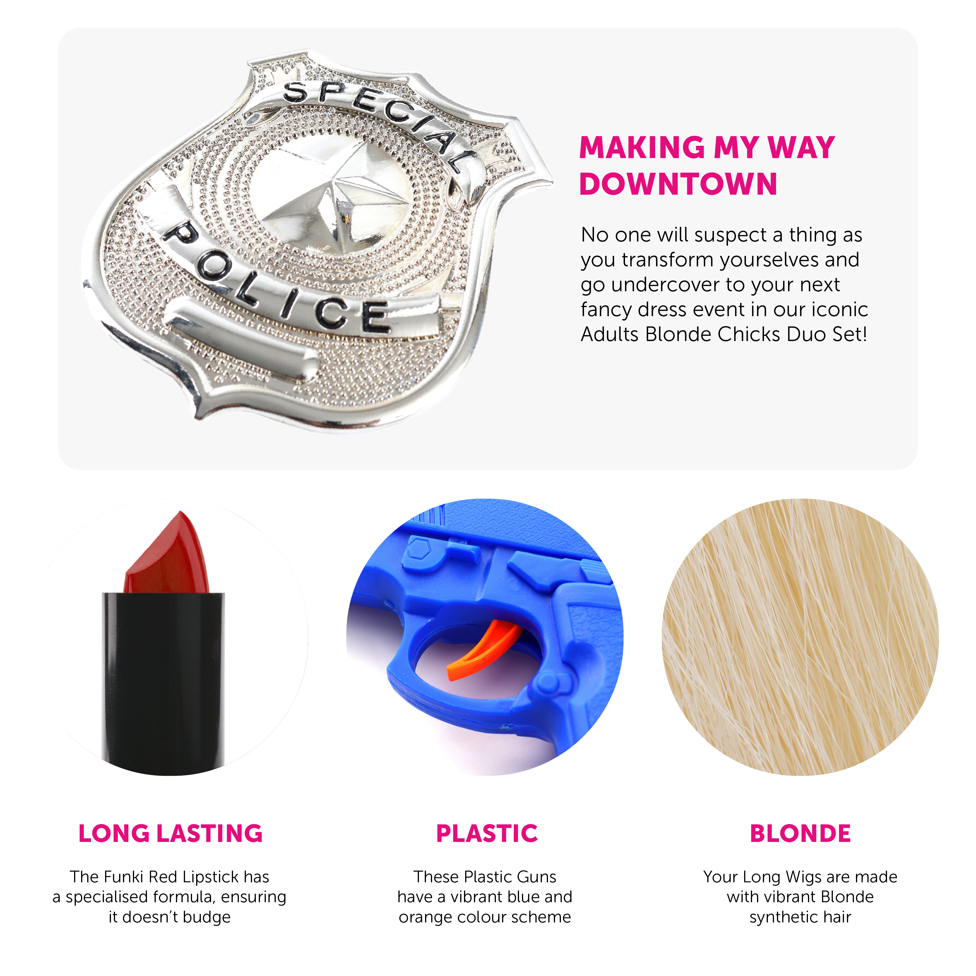 SET INCLUDES: This Blonde Chick Duo Set includes 2x Long Blonde Wigs, 2x Metal Police Badges, 1x Gun Holster Belt that includes 2 Plastic Blue Guns and 1x Red Lipstick, the perfect duo set to wear at any fancy dress event!