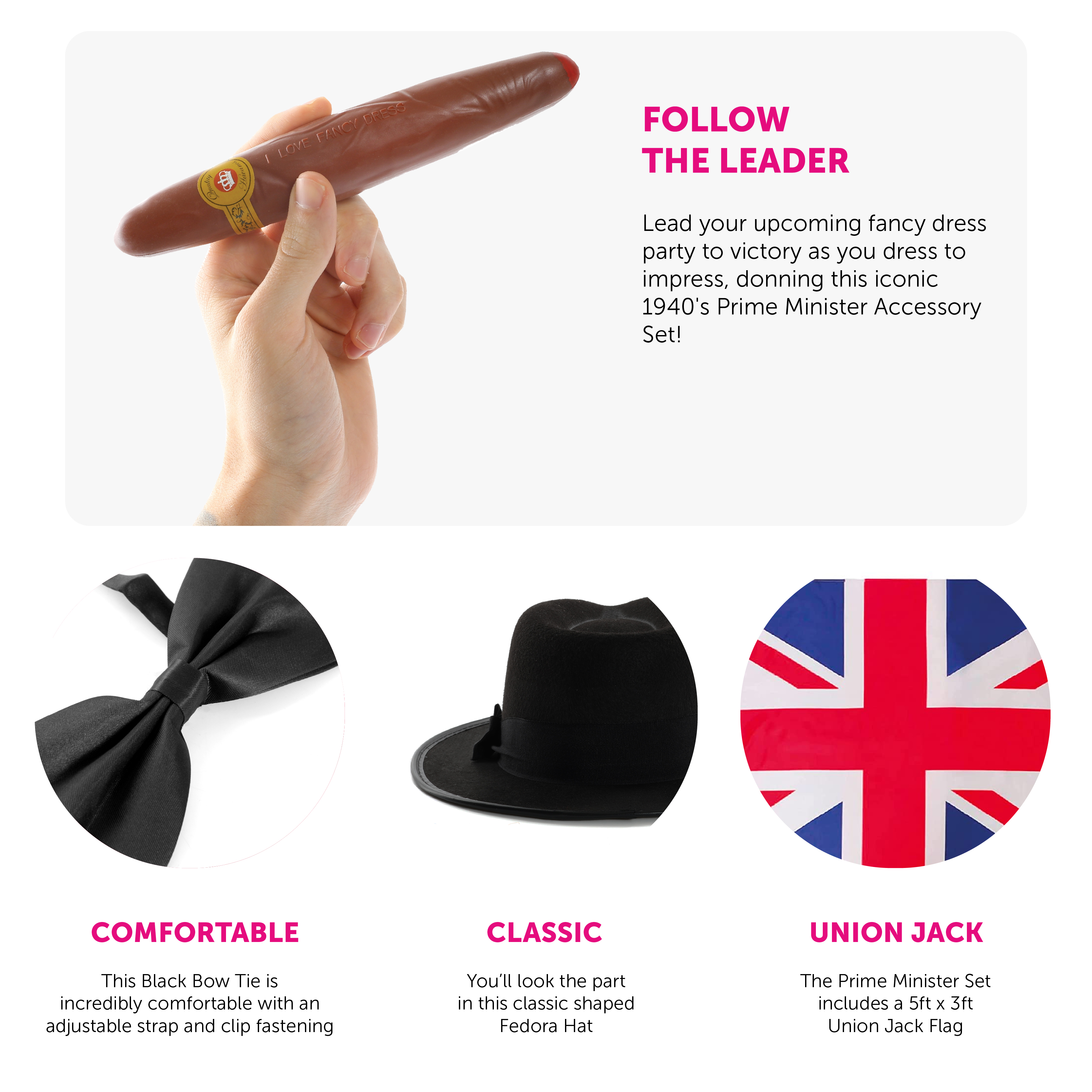 ACCESSORY SET DETAILS: This 1940's Prime Minister Accessory Set includes a Black Felt Fedora Hat with a matching Black band around the crown, a Jumbo Plastic Cigar, a Black Satin Bow Tie with easy clip fastening, and a 5ft x 3ft Union Jack Flag, the perfect accessories to pair with your outfit!