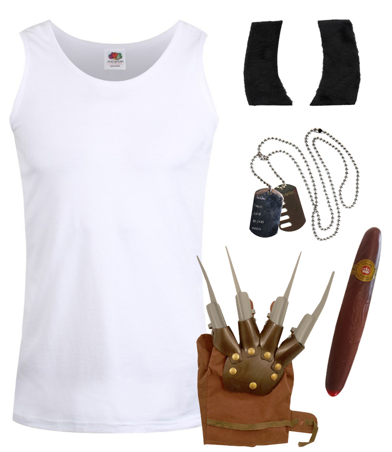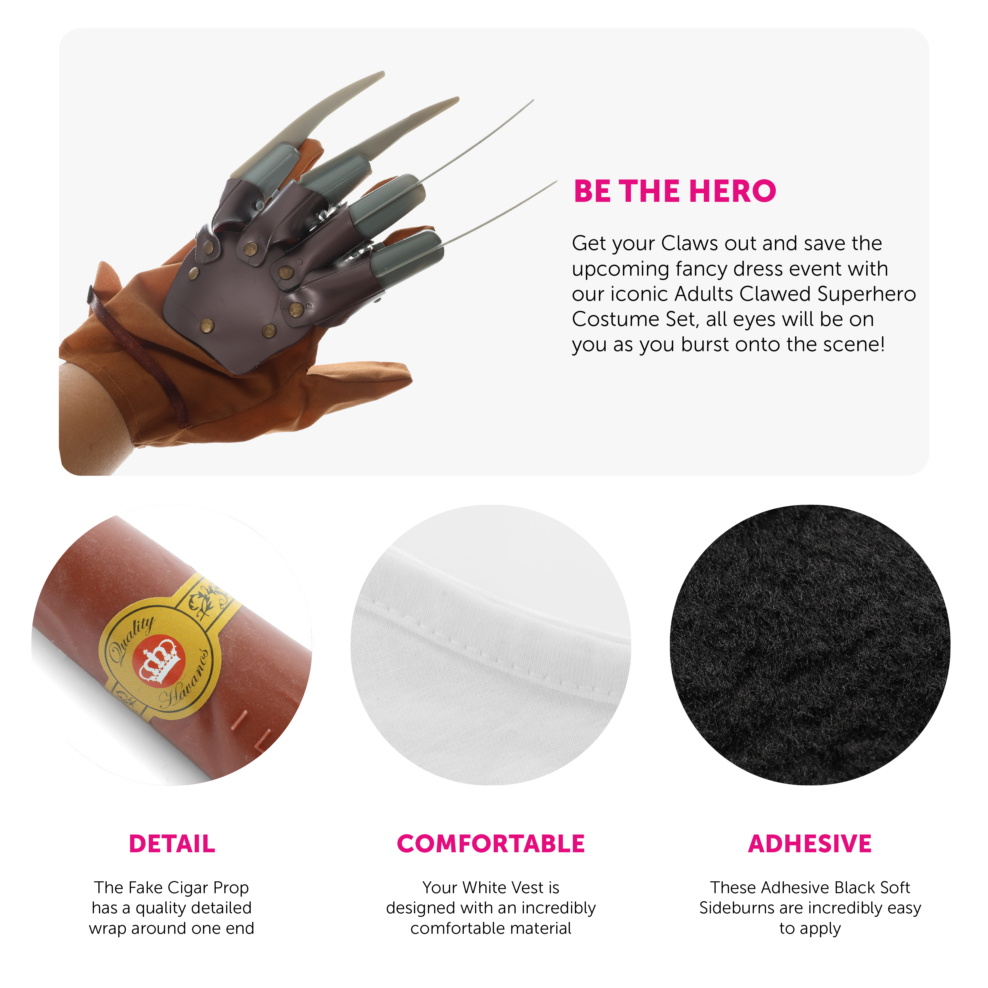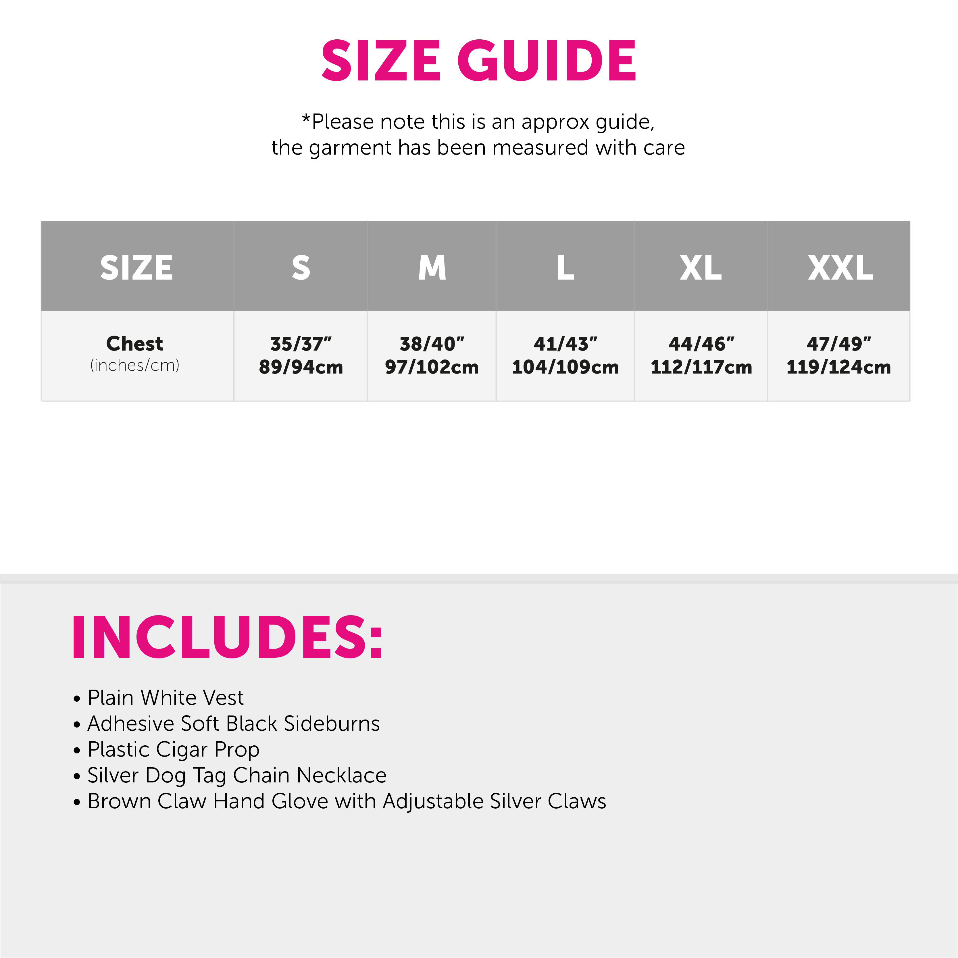 COSTUME INCLUDES: Your Adults Clawed Superhero Costume includes a Plain White Vest Top, Plastic Cigar, Adhesive Black Sideburns, a Silver Dog Tag Necklace and a Brown Claw Hand Glove with adjustable Claws, the perfect look for any event!