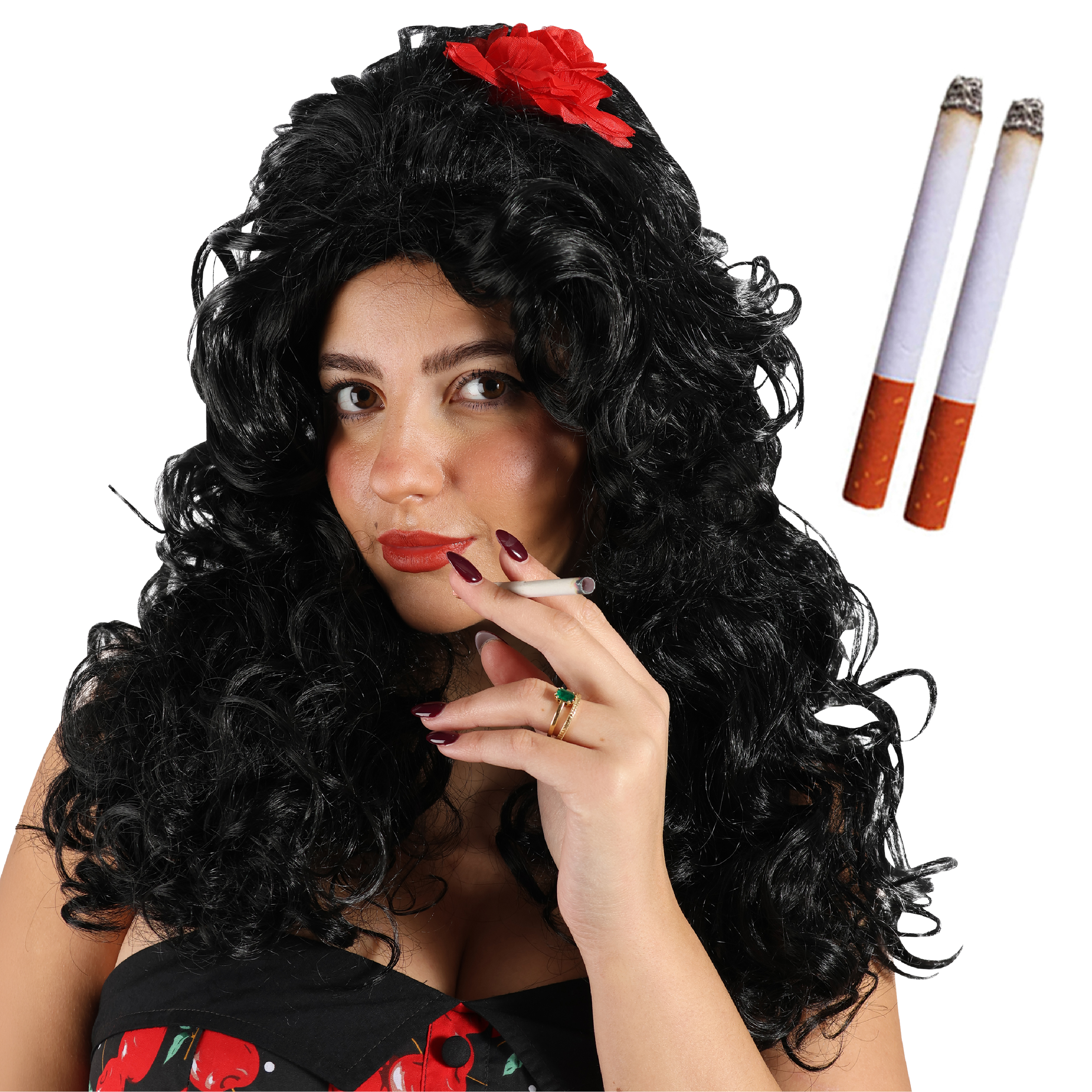 SET DETAILS: This Accessory Set includes a glamorous looking Long Curly Black Wig, styled into a stand out Beehive and detailed with a Red Flower, and Fake Cigarettes, the perfect addition to your music themed fancy dress costume!