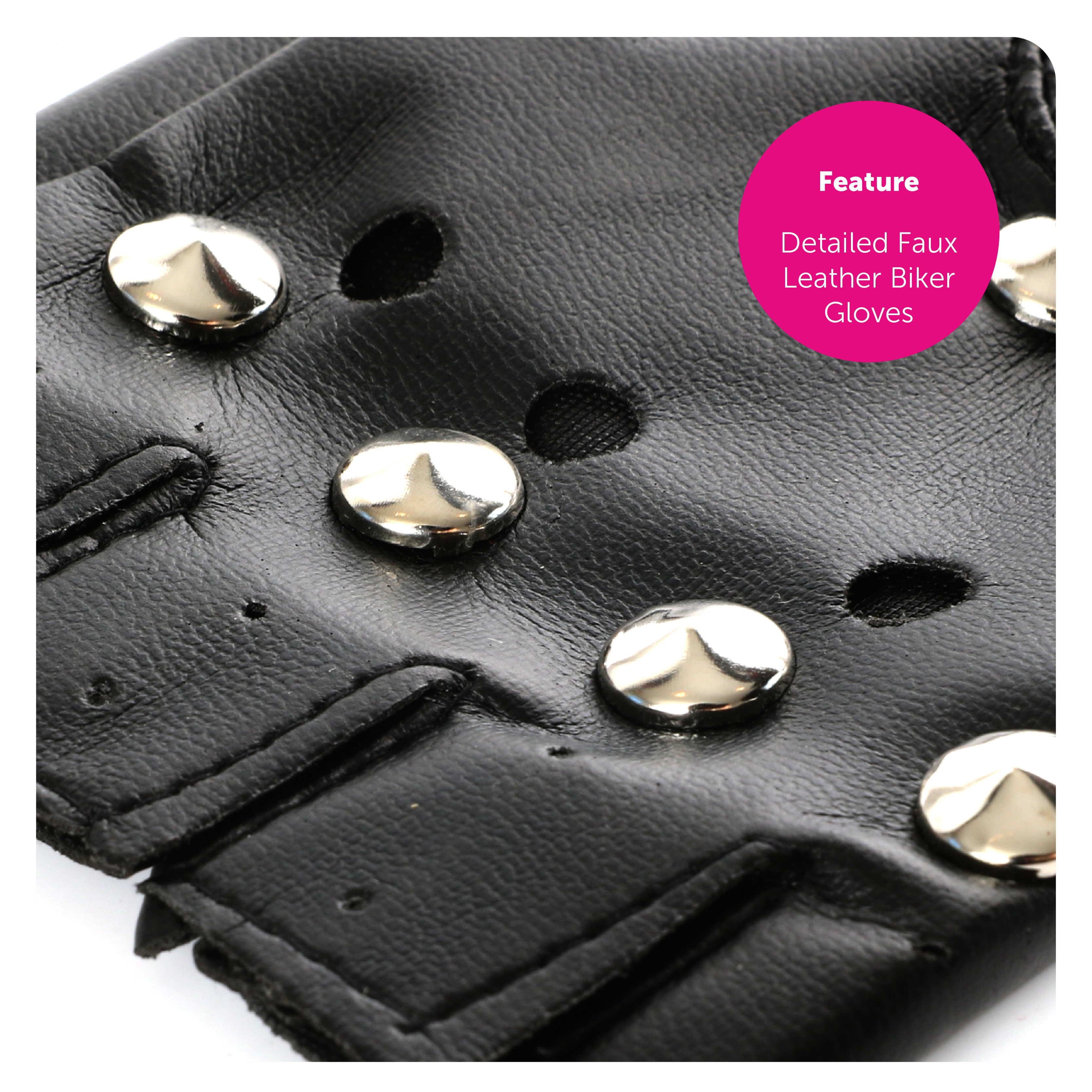 SET INCLUDES: This 80's Set includes a White, Short Sleeved, Cotton T-Shirt with an 80's slogan printed on the front, a Black Faux Leather Biker Hat with Silver Chains, Reflective Glasses, Black Faux Leather Fingerless Gloves with Silver Studs, and an Adhesive Black Moustache - the perfect outfit for any occasion!