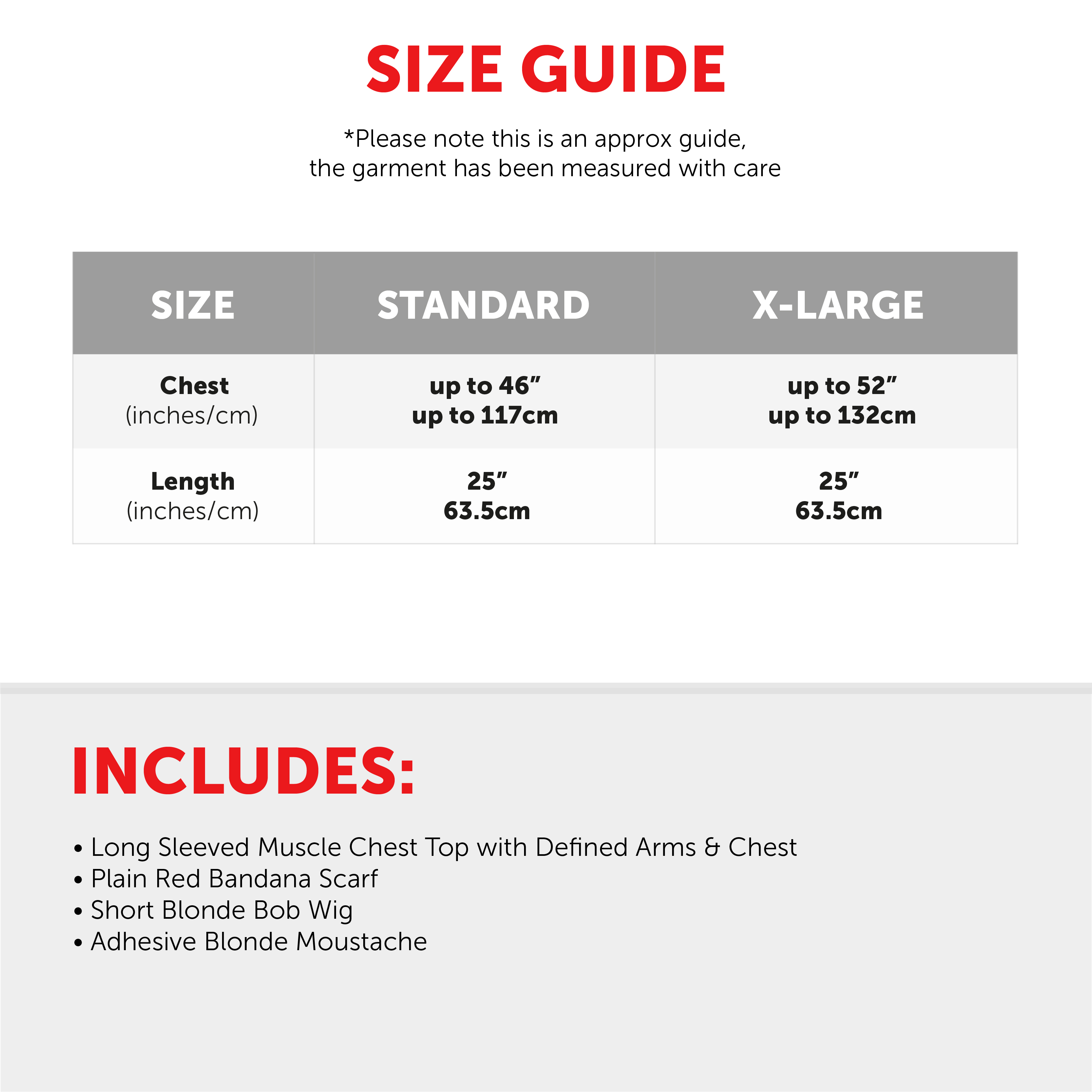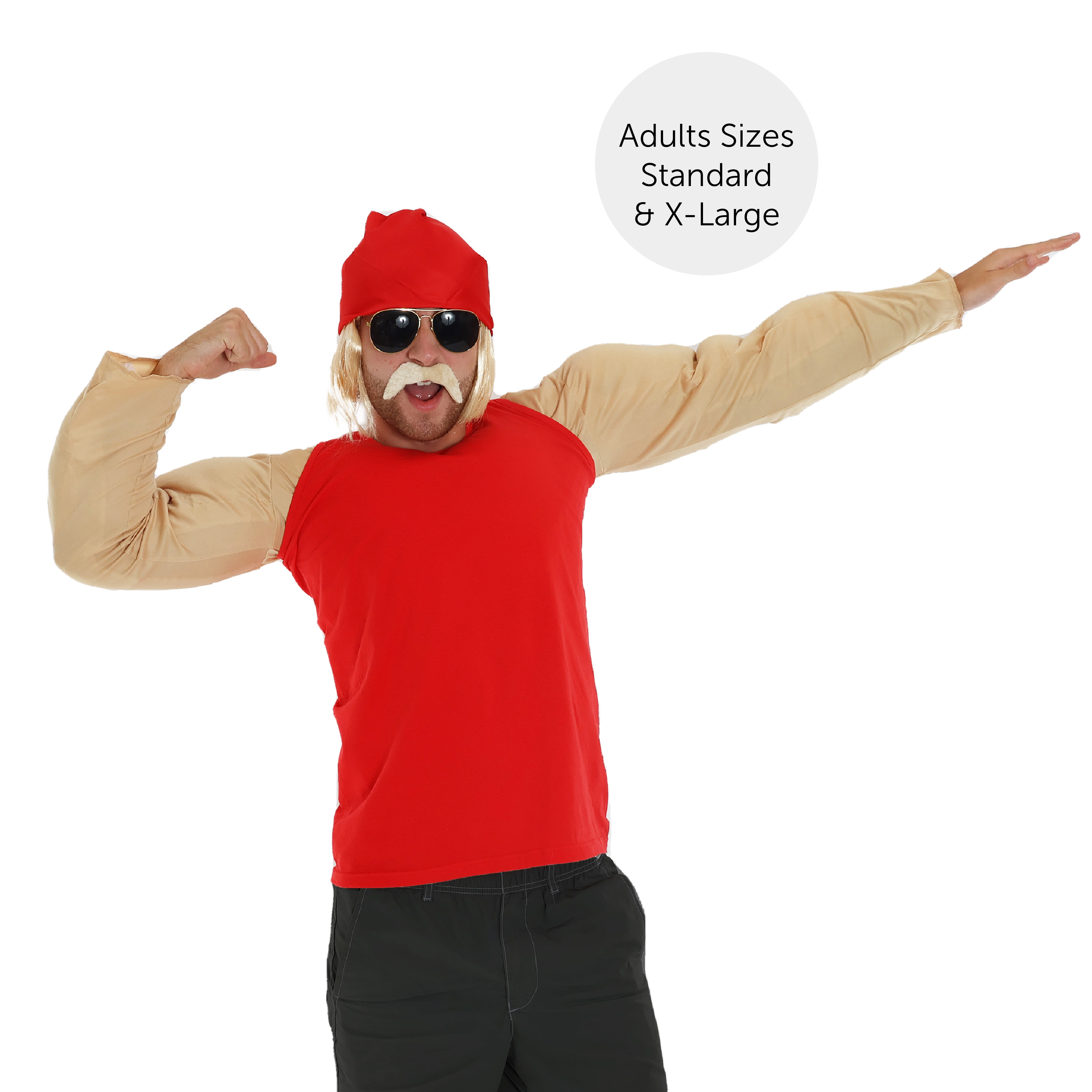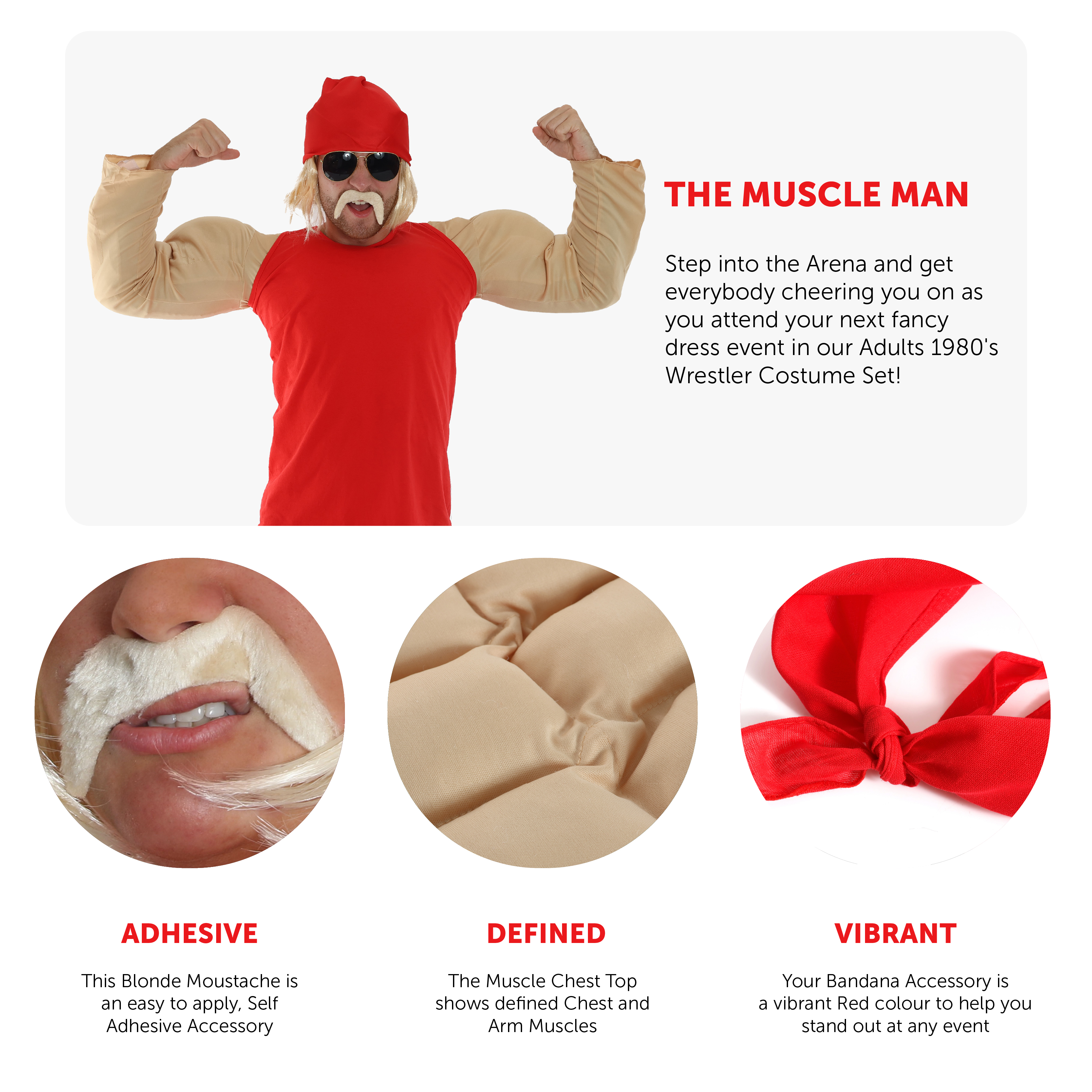 COSTUME DETAILS: This Adults 1980's Wrestler Costume Set includes a vibrant Red Bandana, which can be adjusted to fit any sized head, an easy to apply adhesive Blonde Moustache, a Muscle Chest Top with defined arms and torso and a Blonde Bob Wig, to help you finish off your desired look!