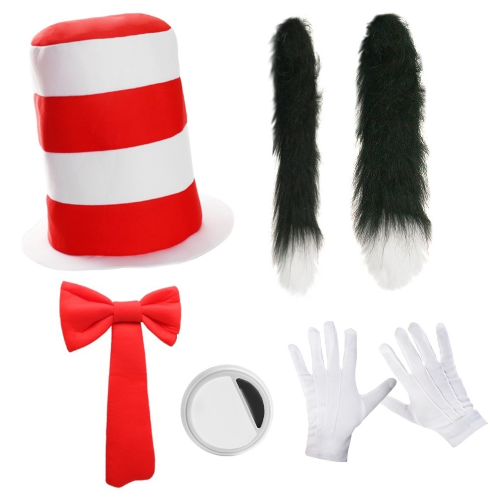 Adults Crazy Cat Accessory Set - Striped Hat, Red Tie, Fluffy Tail, White Gloves & Black/White Face Paint £13.99