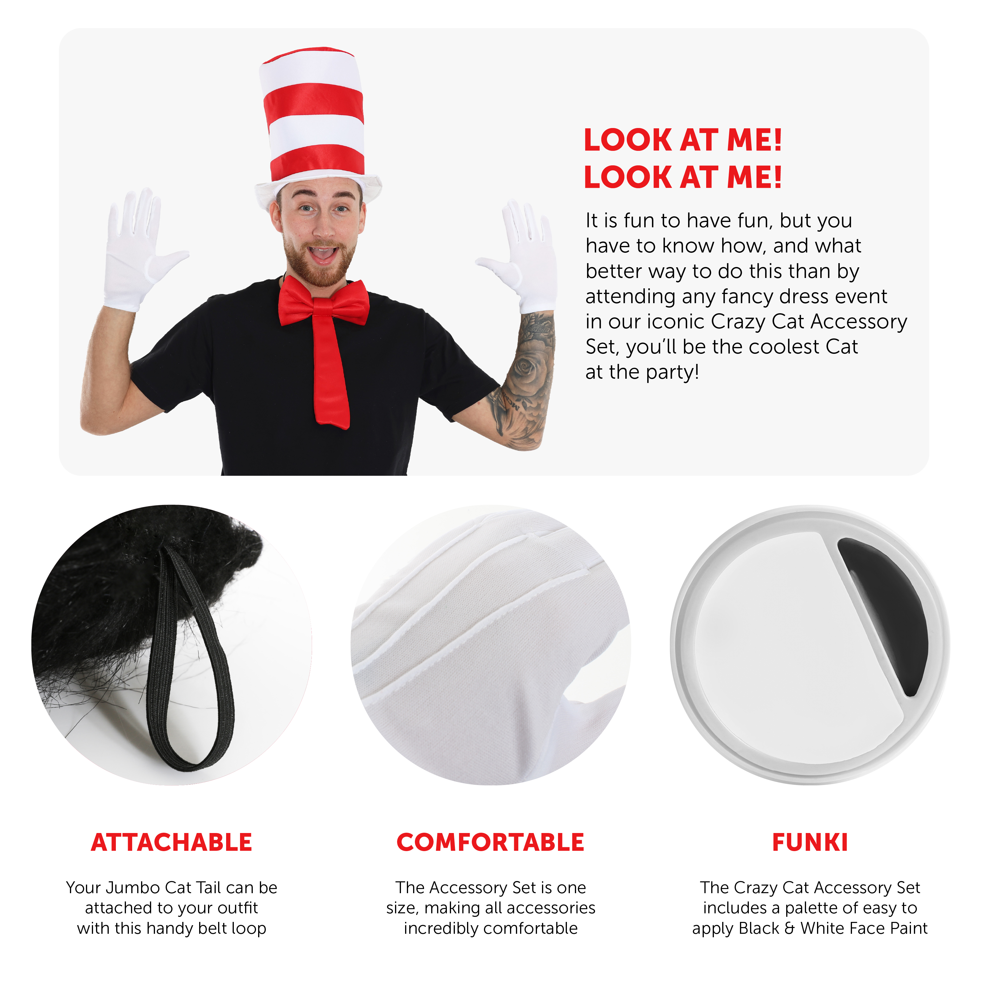 CRAZY CAT COSTUME DETAILS: Your Adults Crazy Cat Costume Set includes a tall, Red and White Striped Top Hat, a Black and White Faux Fur Tail, a pair of White Gloves, a large Red Bow Tie and a palette of Black and White Face Paint!