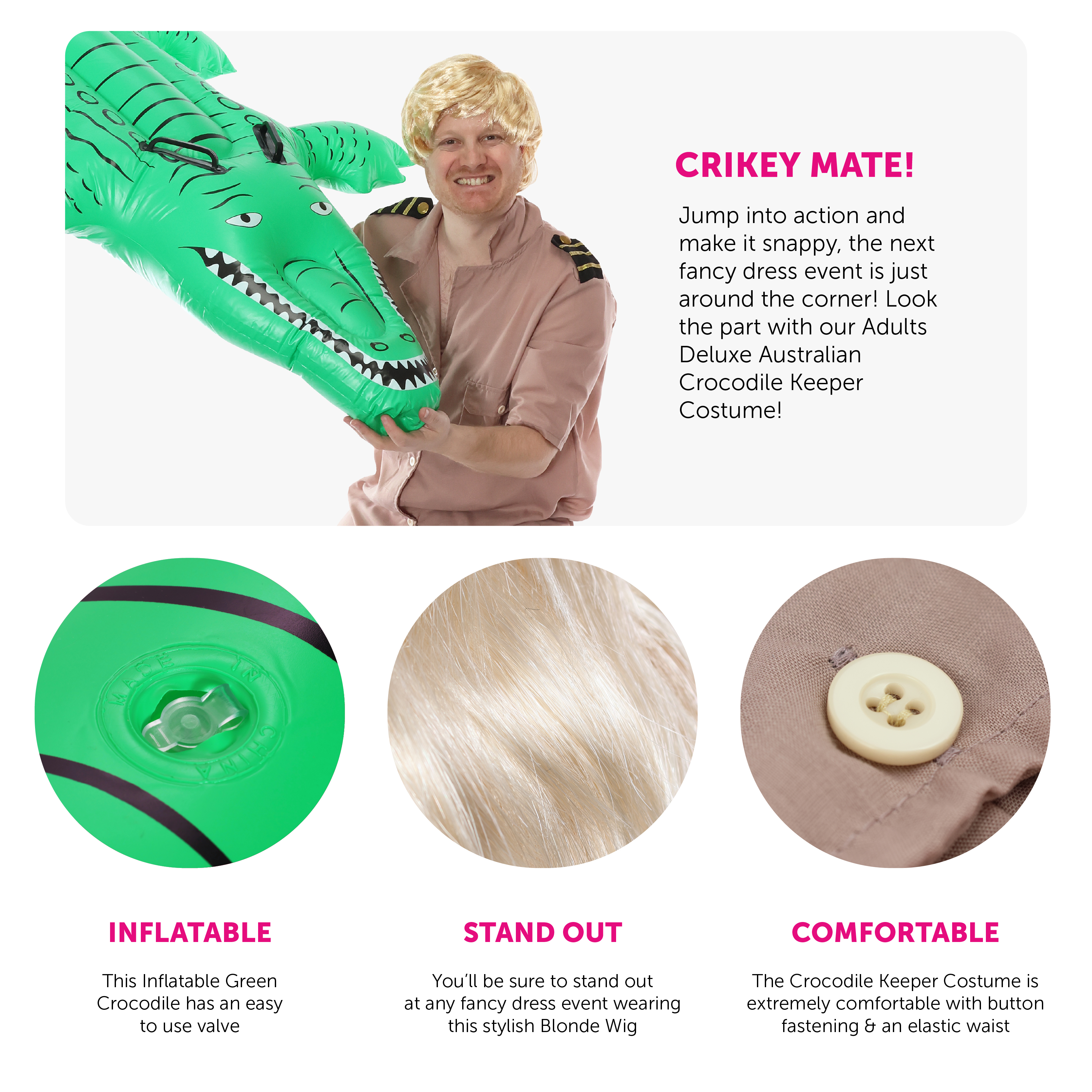 COSTUME DETAILS: Your Adults Deluxe Australian Crocodile Keeper Costume includes a Light Brown Shirt with button fastening and shoulder patches, a matching pair of 3/4 length Trousers with an elasticated waistband, a Short Blonde Wig, and vibrant Green Inflatable Crocodile!