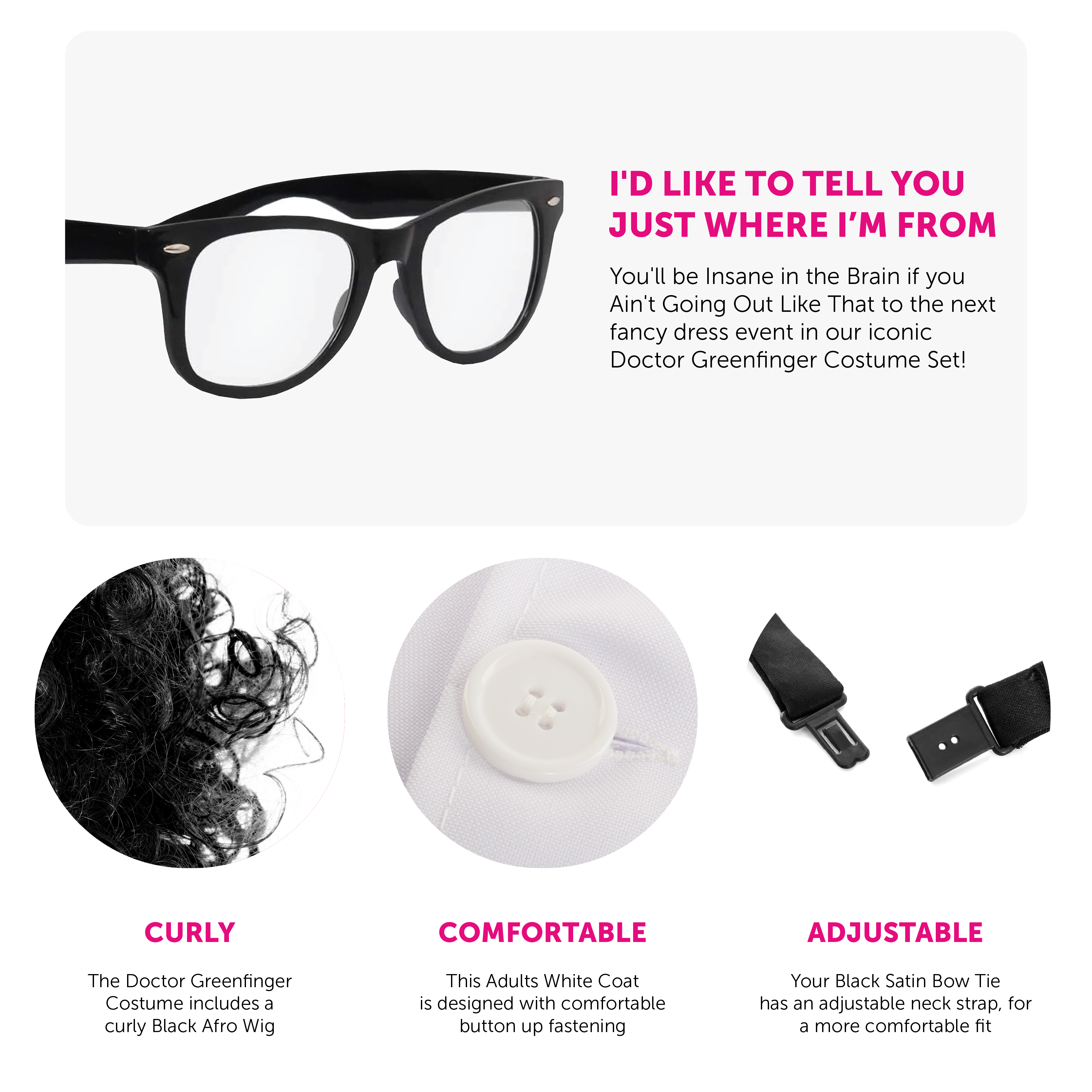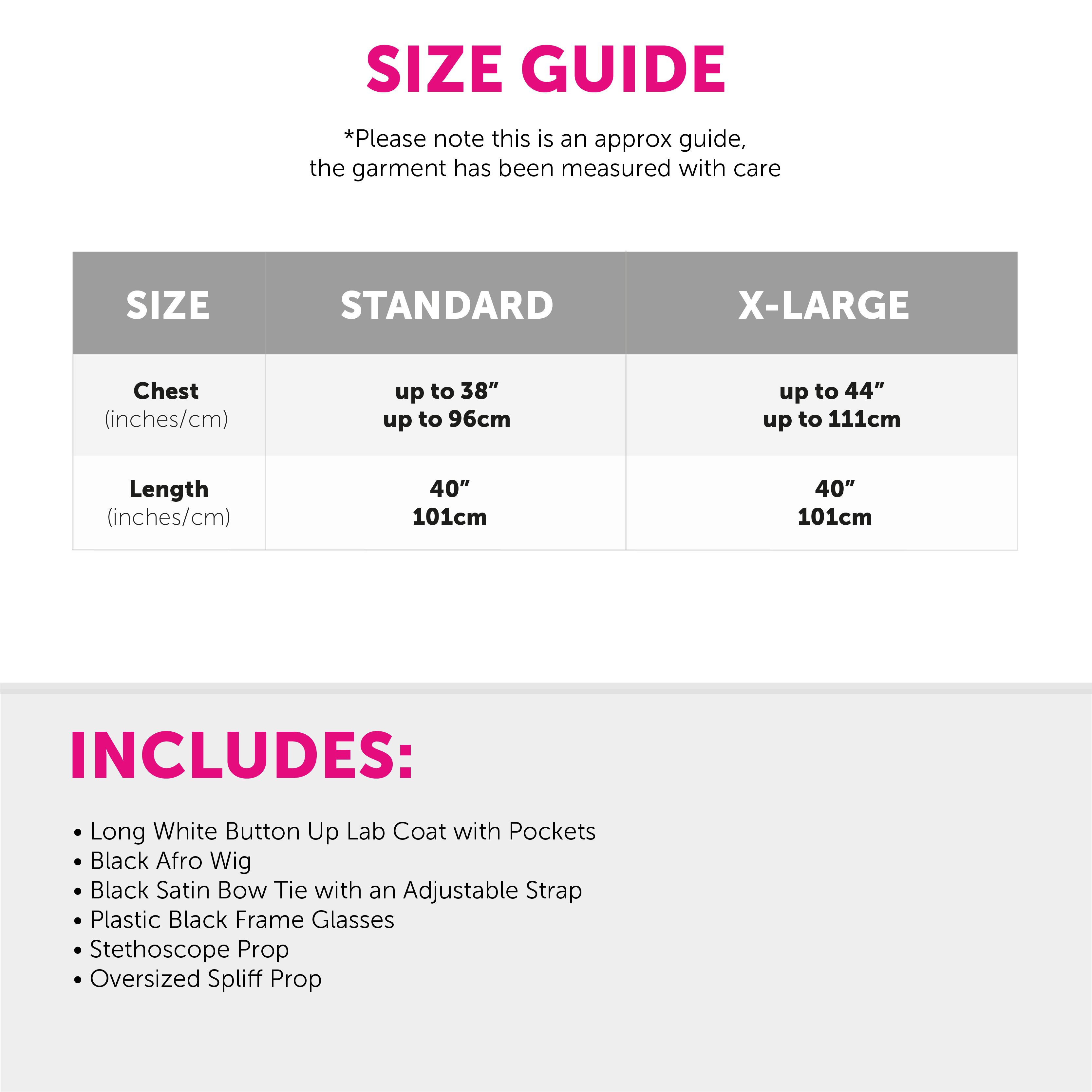 COSTUME INCLUDES: Your Adults Doctor Greenfinger Costume Set includes a Long White Lab Coat with pockets and button up fastening, a Black Afro Wig, plastic Black Frame Glasses, Black Satin Bow Tie, a Stethoscope, and an over sized Spliff Prop, the perfect look for any Hip Hop Fancy Dress event!