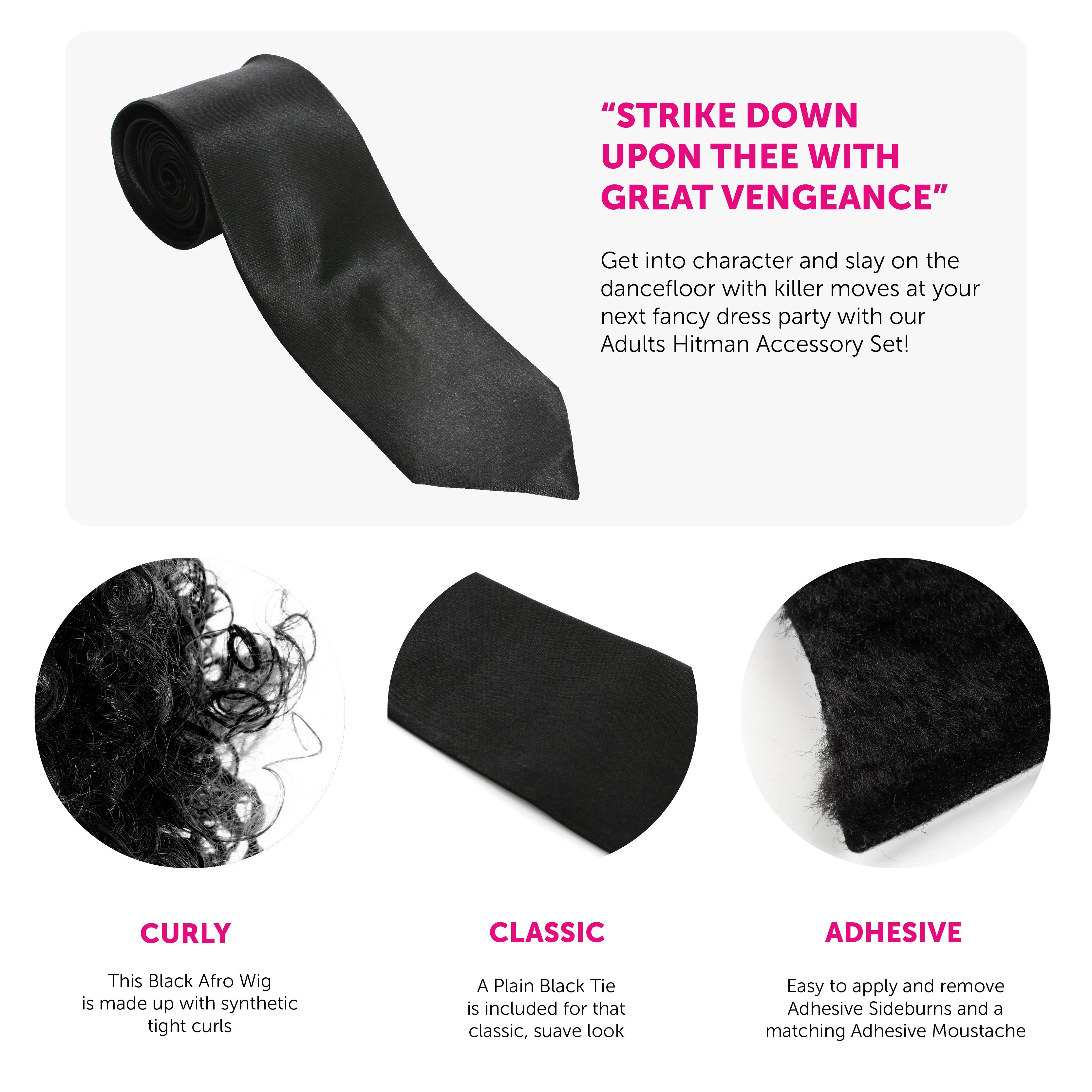 ACCESSORY SET INCLUDES: Your Adults Hitman Accessory Set includes a Black Afro Wig, a Black Satin Necktie, Adhesive Black Sideburns and an Adhesive Black 70's Style Moustache, the perfect accessories to your themed Costume!