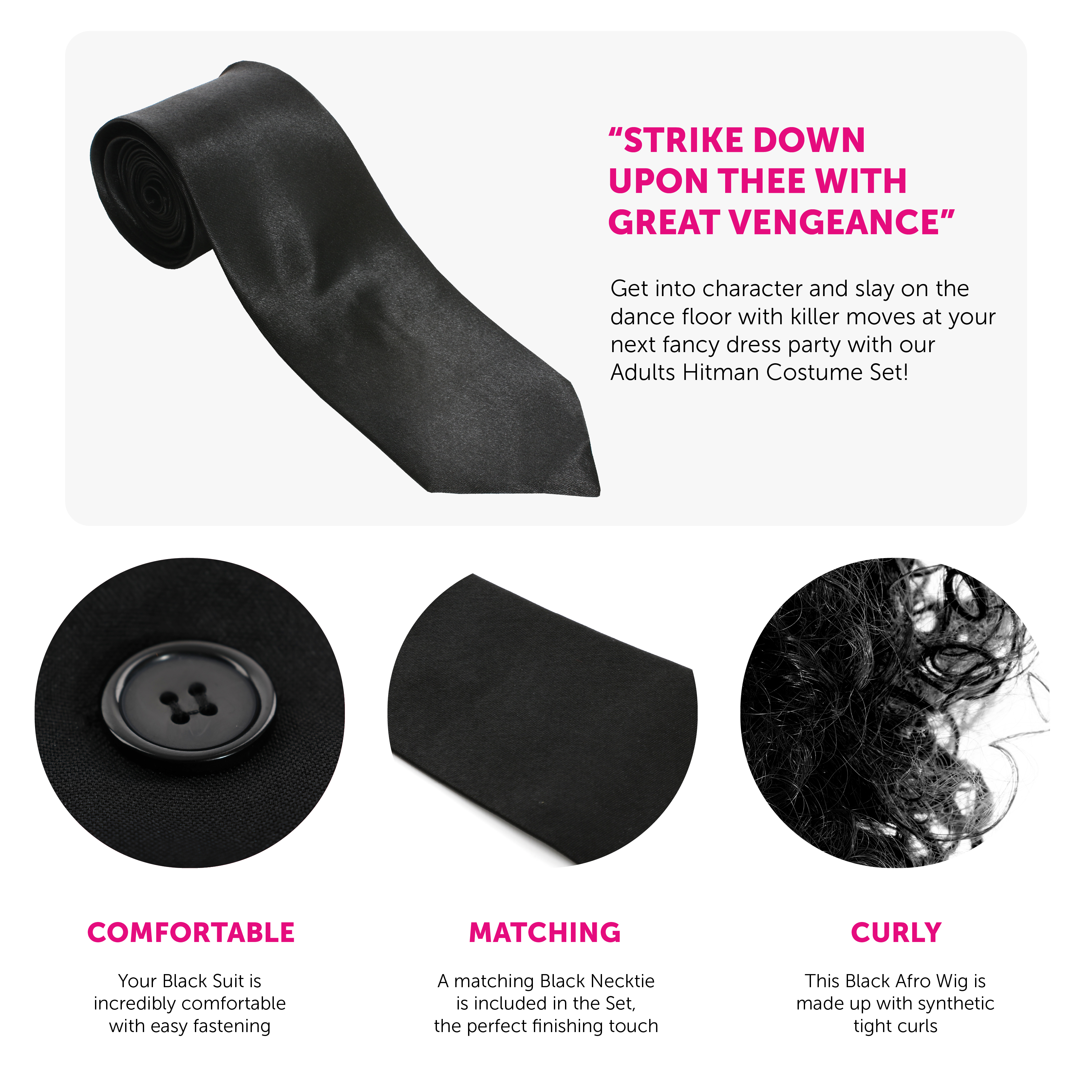 COSTUME SET INCLUDES: Your Adults Hitman Costume Set includes a Black Suit Jacket with matching Black Suit Trousers, a Black Afro Wig, a Black Satin Necktie, Adhesive Black Sideburns and an Adhesive Black 70's Style Moustache, the perfect accessories to your themed Costume!