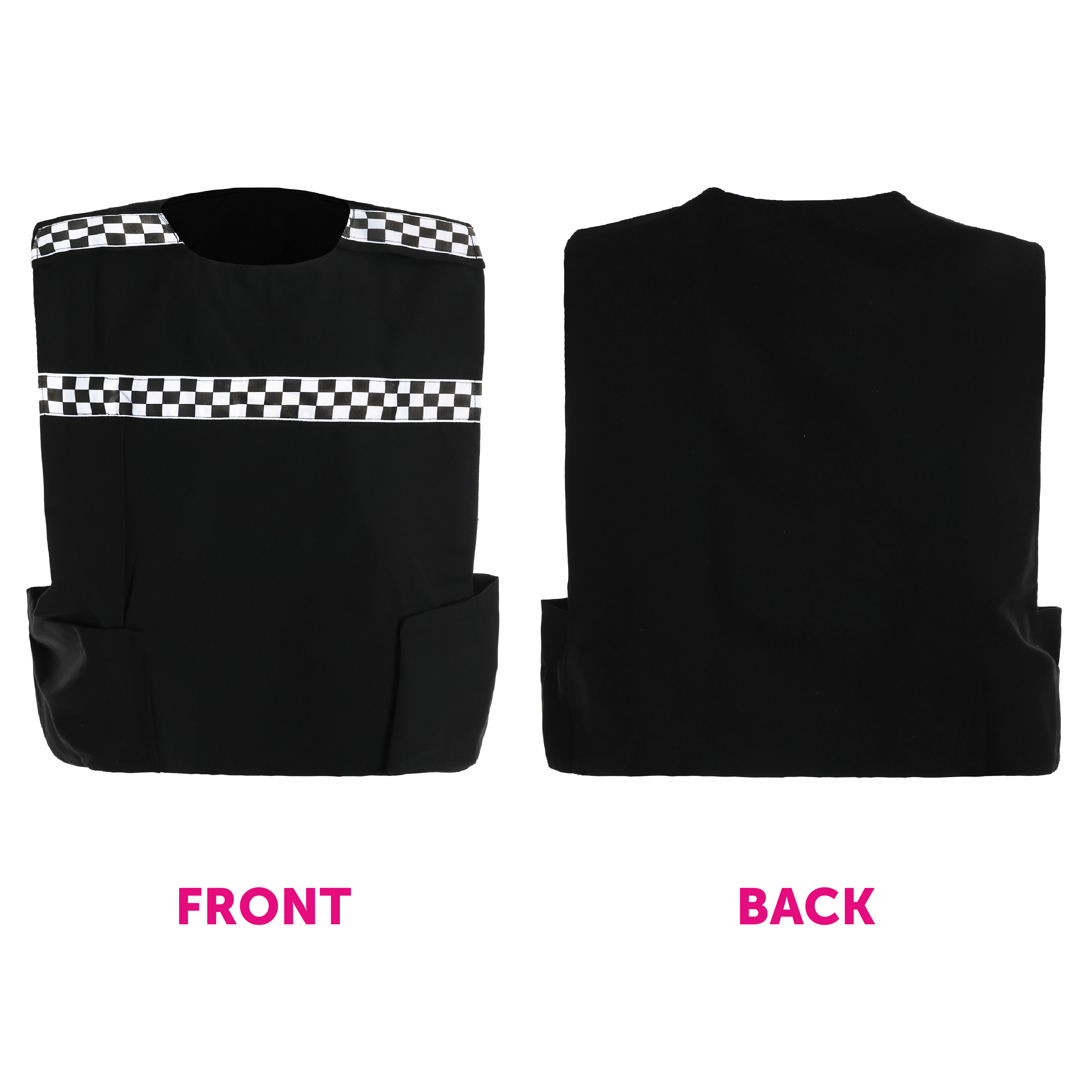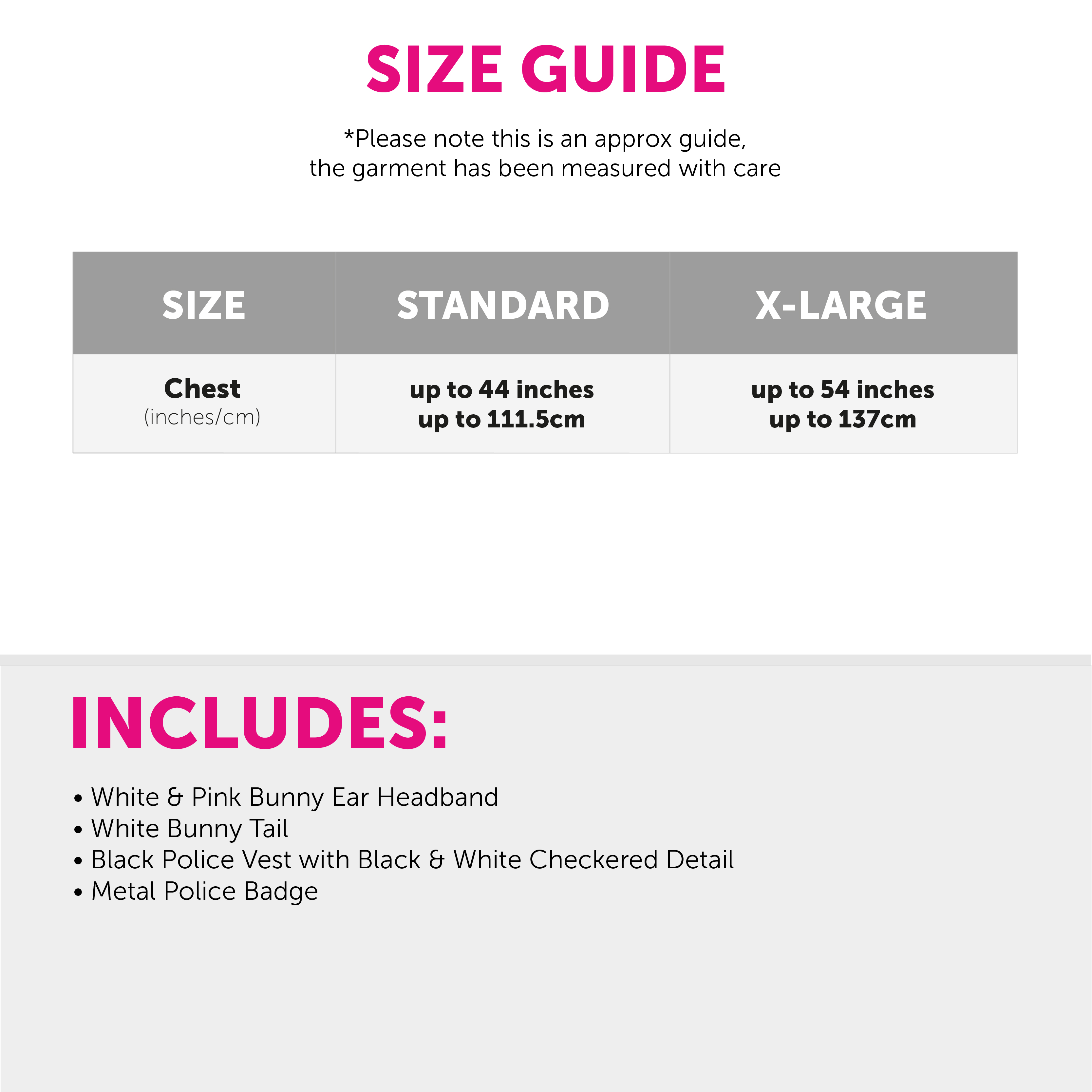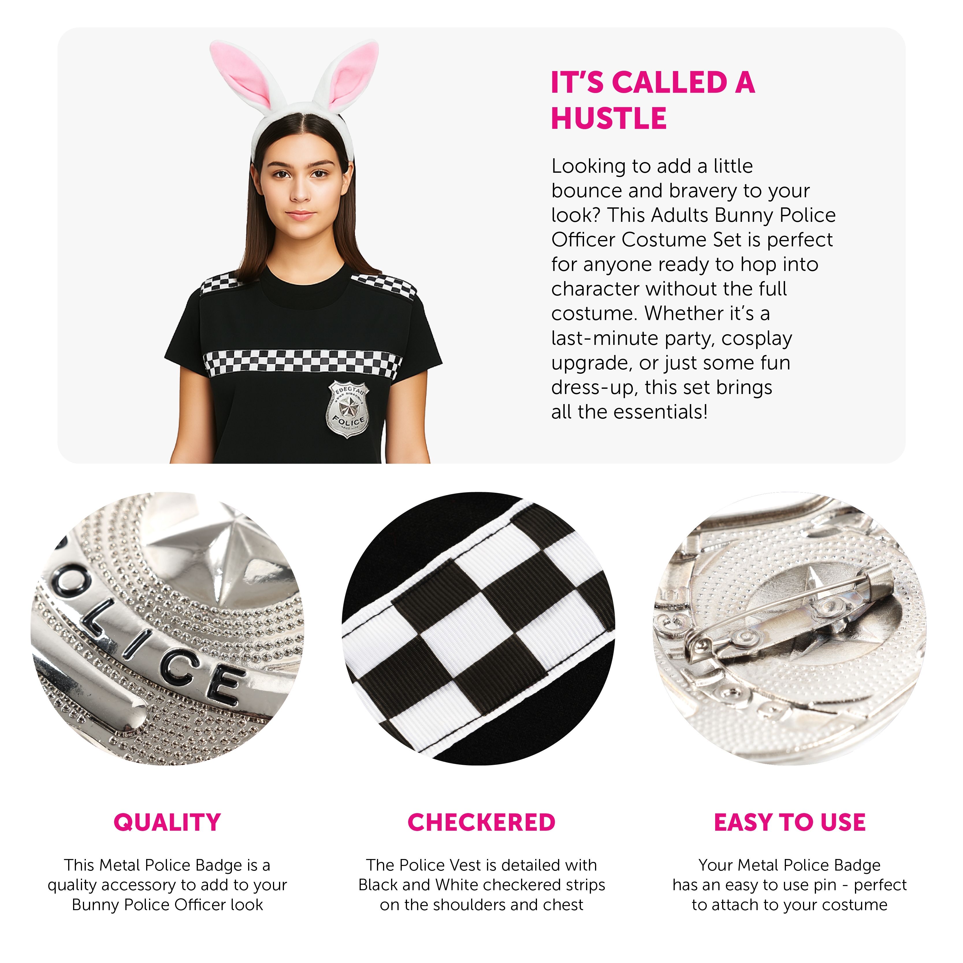 SET INCLUDES: This Adults Bunny Police Officer Accessory Set includes a White & Pink Bunny Ear Headband with a White Bunny Tail, a Black Police Vest with Checkered Black & White details, and a metal pin badge with a large star and 'Special Police' on the front,, the perfect way to finish off your outfit!