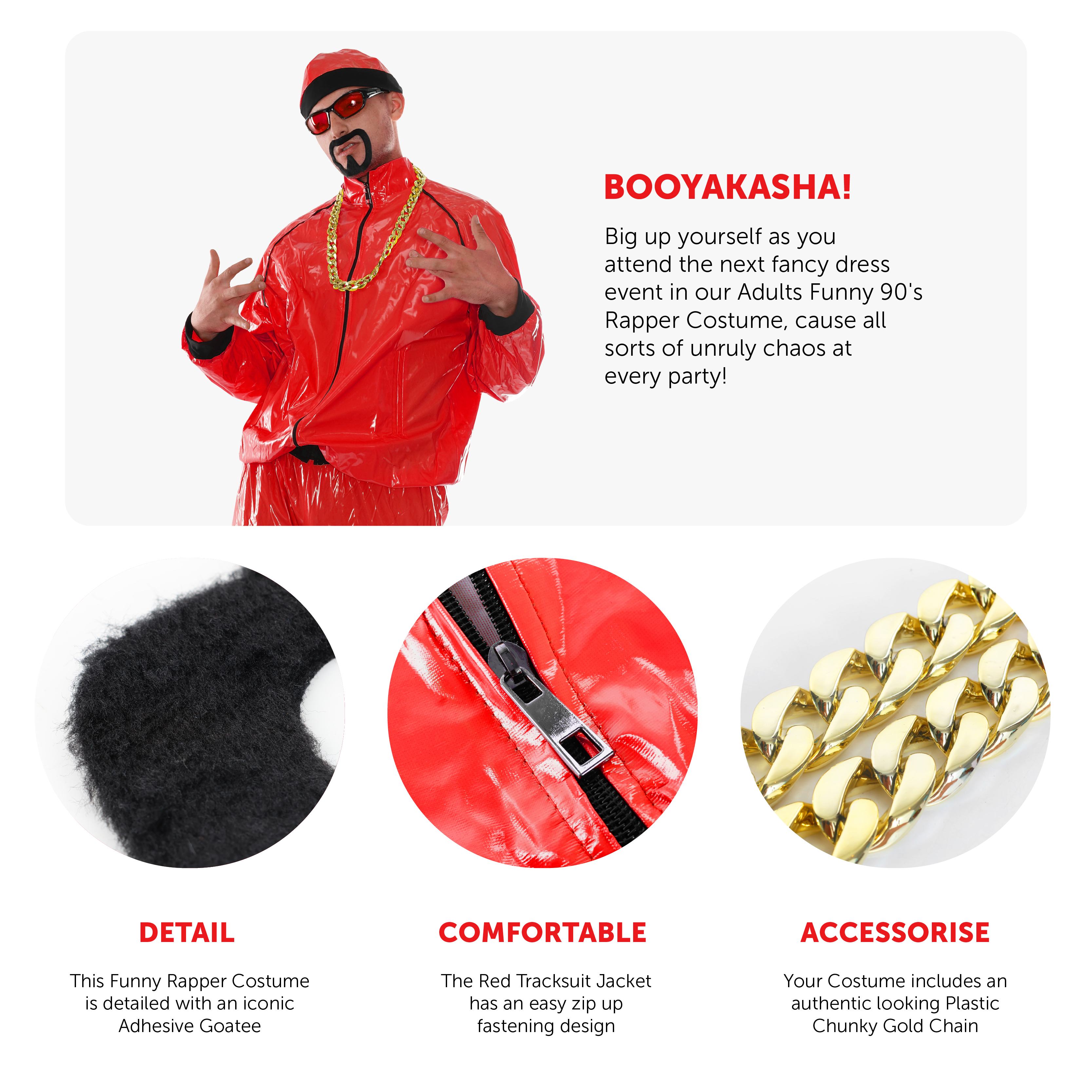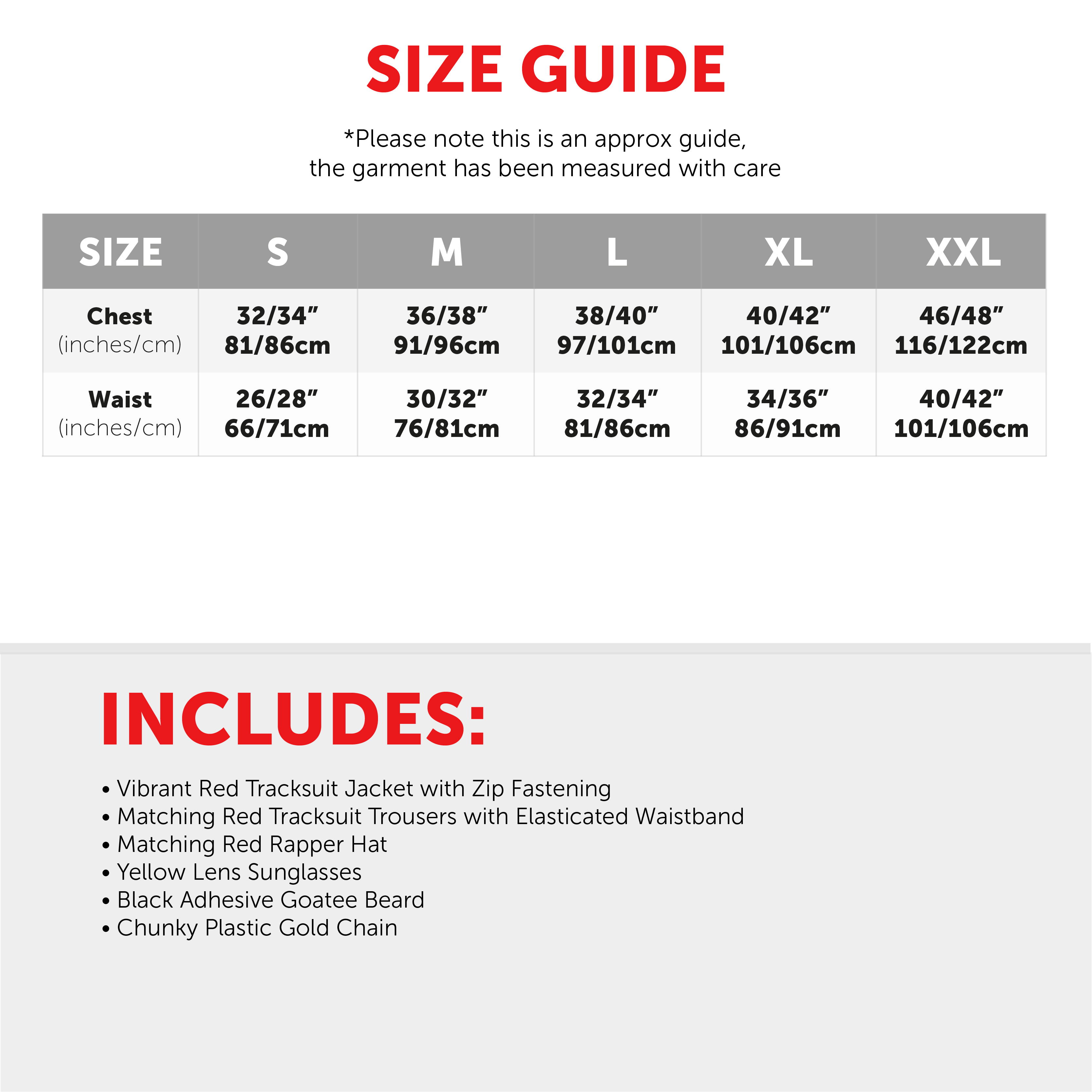 COSTUME DETAILS: Your Funny Rapper Costume includes a vibrant Red Tracksuit Jacket with matching Trousers and Hat, Sunglasses, a Black Adhesive Goatee Beard, and a Chunky Plastic Gold Chain Necklace, the perfect Costume set for any fancy dress event!