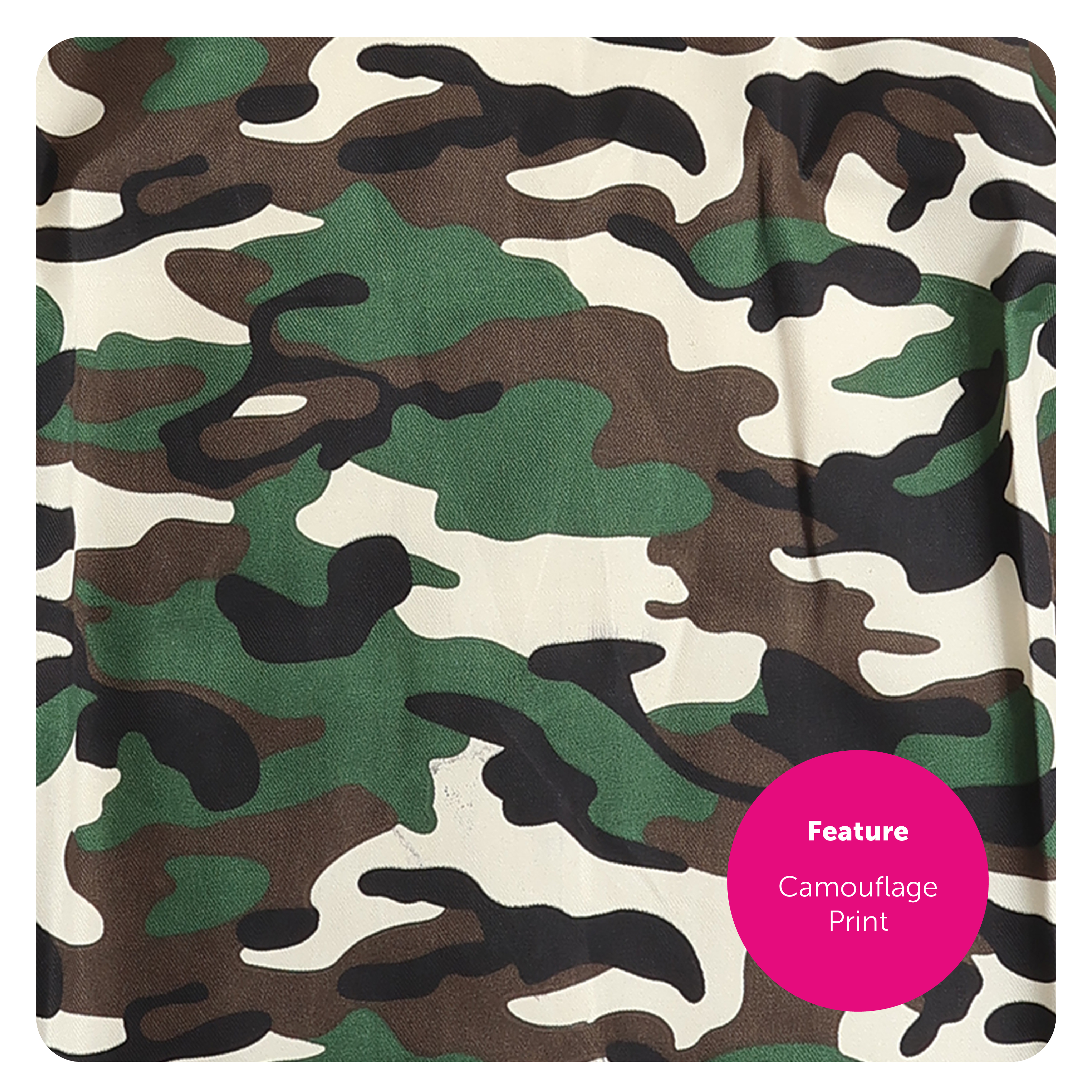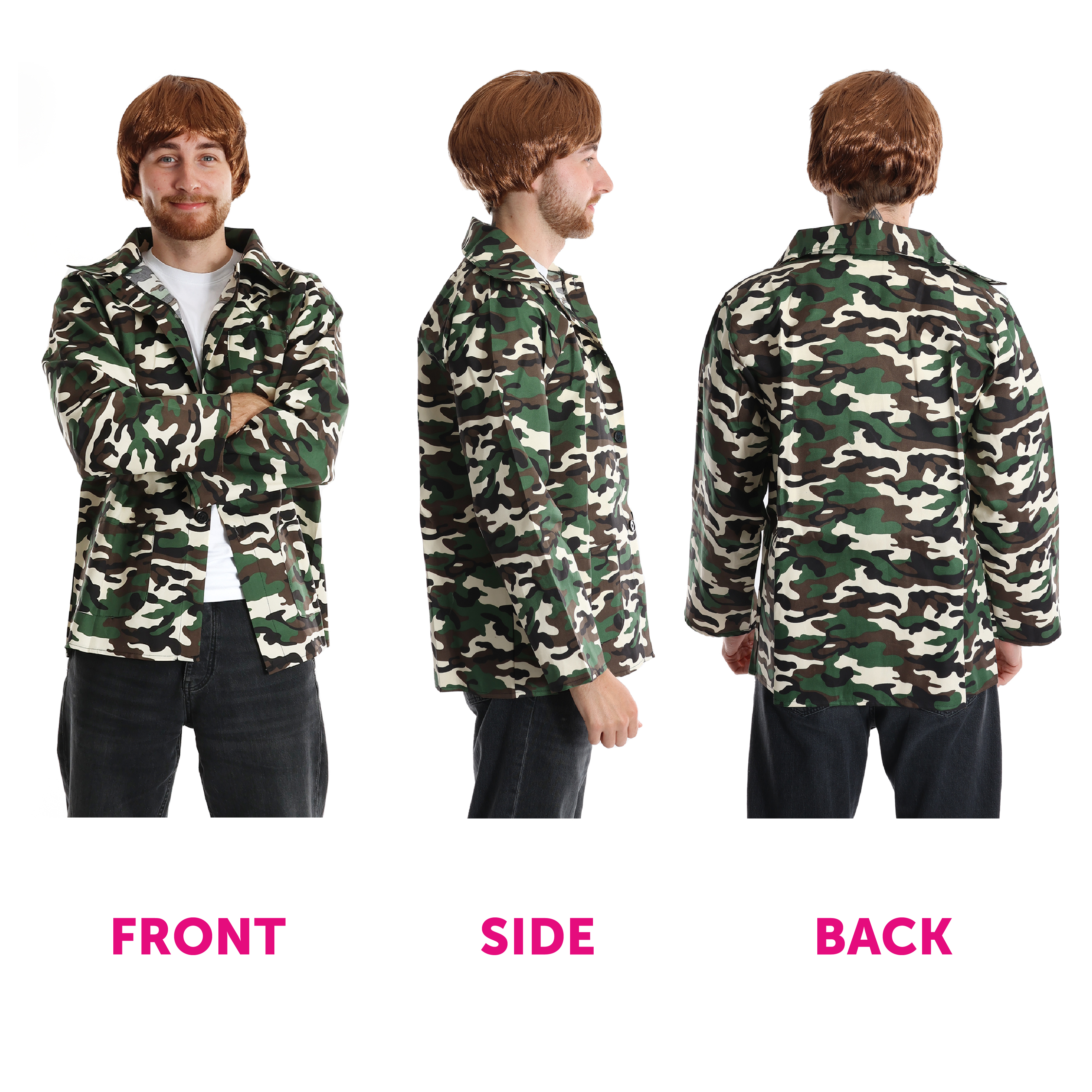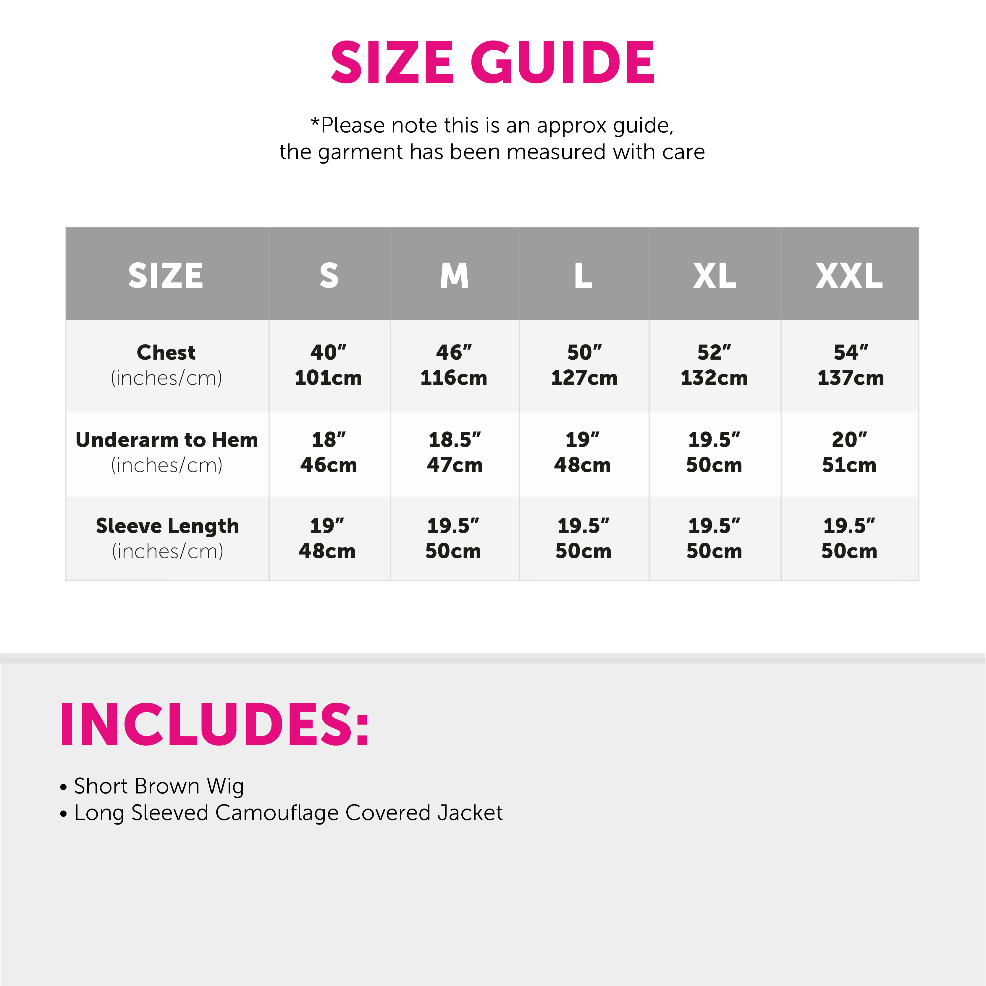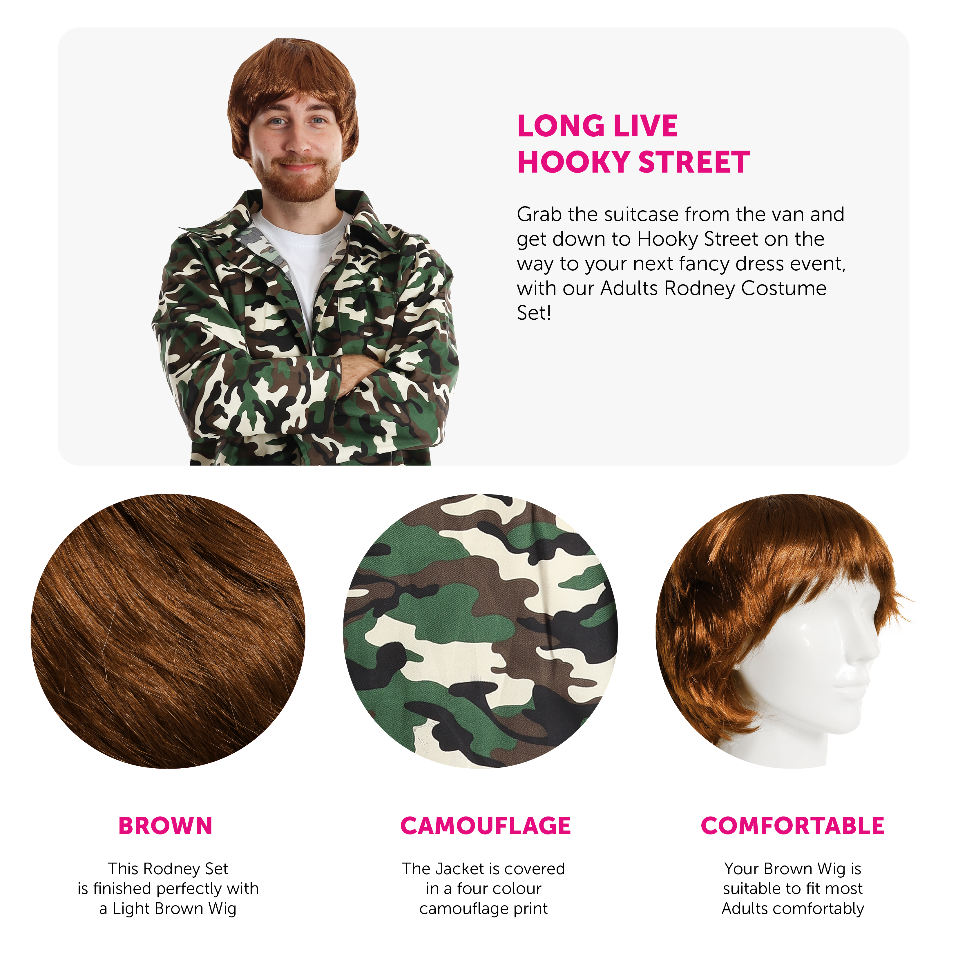 COSTUME SET INCLUDES: This Adults Rodney Costume Set includes a Short Brown Wig and a Long Sleeved, Camouflage covered Army Style Jacket, perfect for your next fancy dress party!