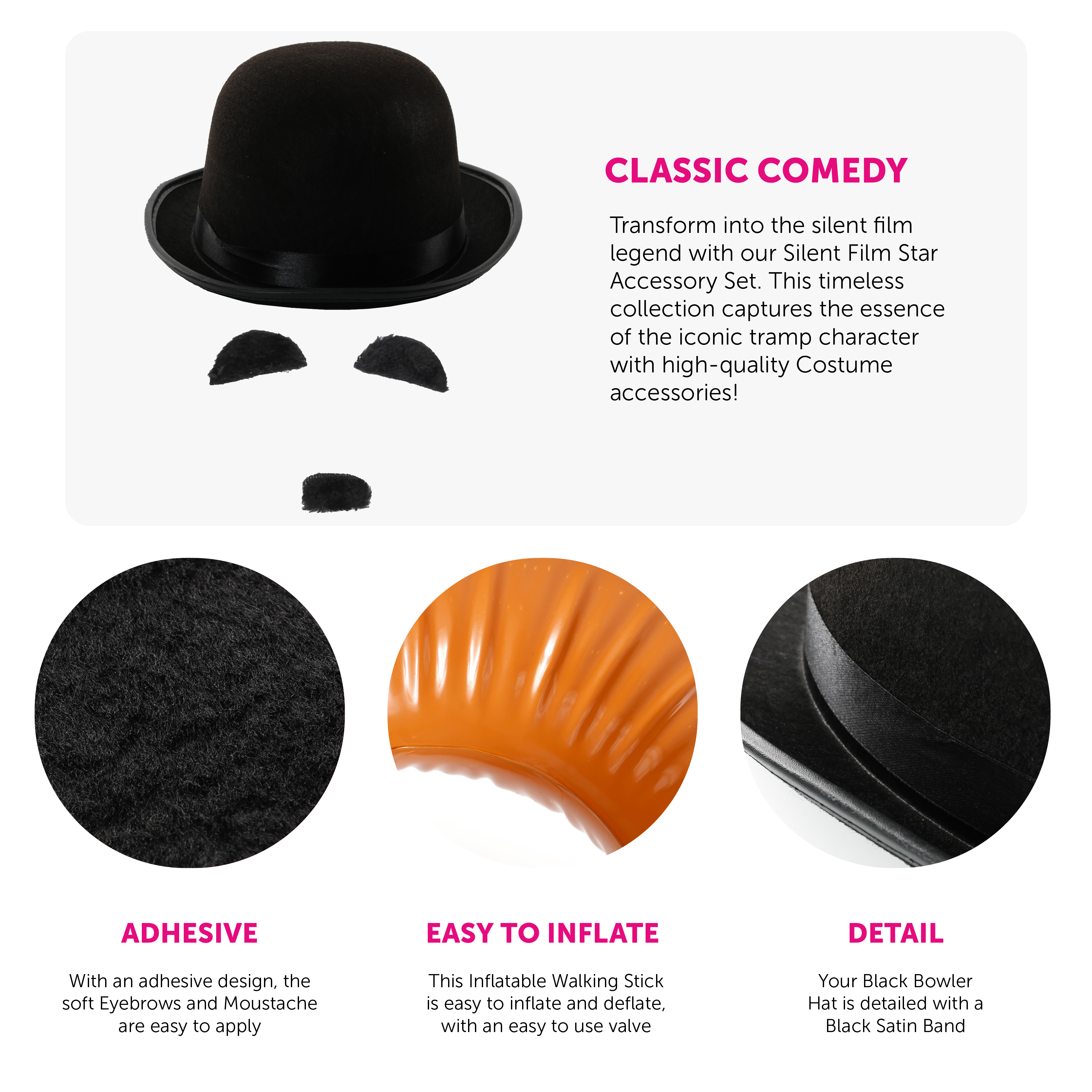 SET INCLUDES: Your Silent Film Star Set includes a durable Black Felt Bowler Hat, an unmistakably, iconic Adhesive Black Moustache, matching Eyebrows, and an Inflatable Walking Stick, a great replica of an iconic character, and the perfect outfit for fans of classic Cinema!