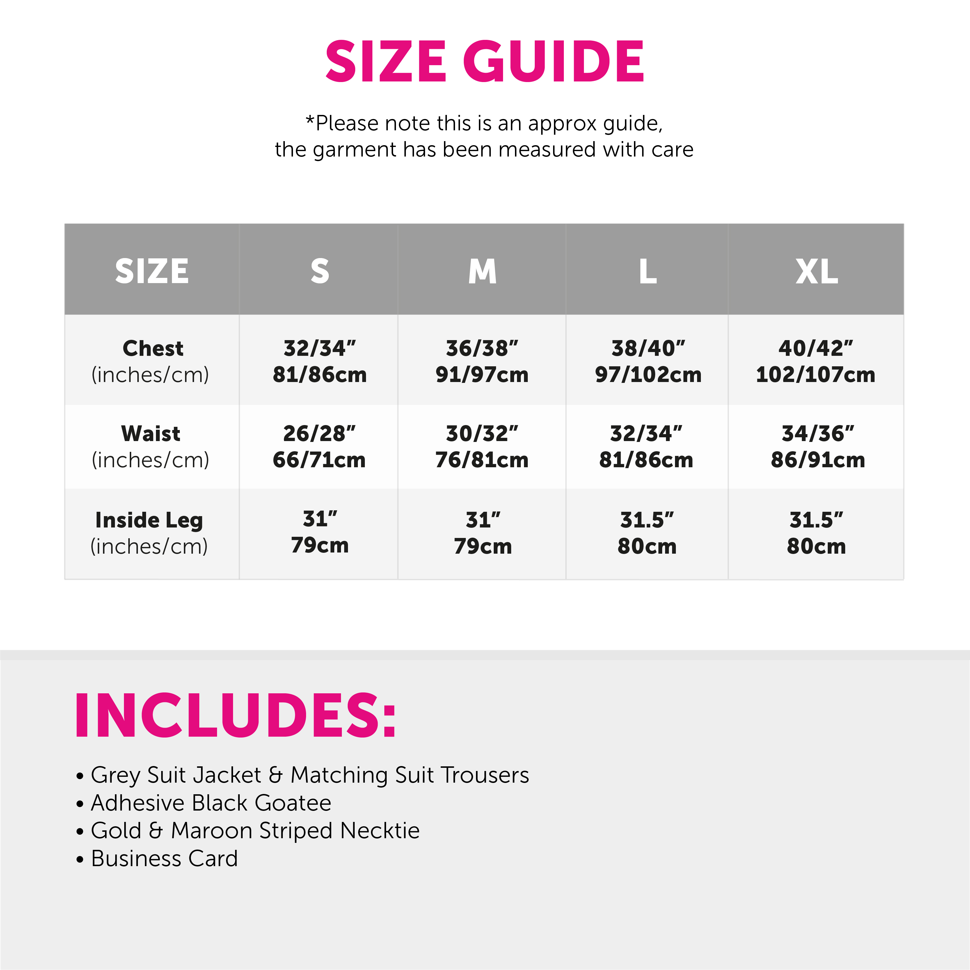 COSTUME DETAILS: Your Slough Office Manager Costume includes a Grey Suit Jacket and matching Suit Trousers, an Adhesive Black Goatee Beard, a Gold and Maroon Striped Necktie, and a Business Card, the perfect Costume set for any fancy dress event!