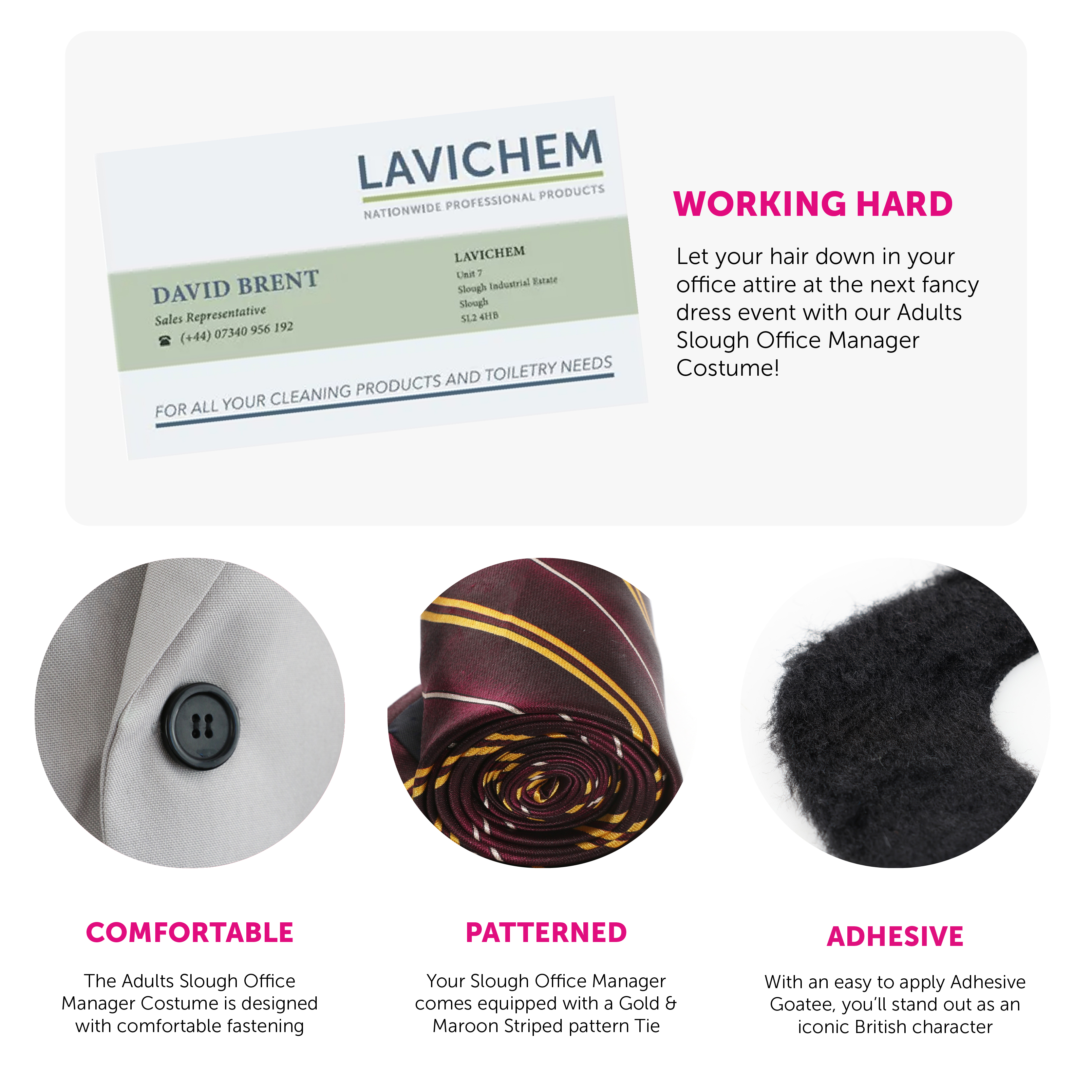PERFECT FOR THEMED FANCY DRESS & OTHER EVENTS: Whether you're attending a British Icon, Comedy or TV Character themed fancy dress event, or a general fancy dress party our Adults Slough Office Manager Costume is the perfect choice for you!