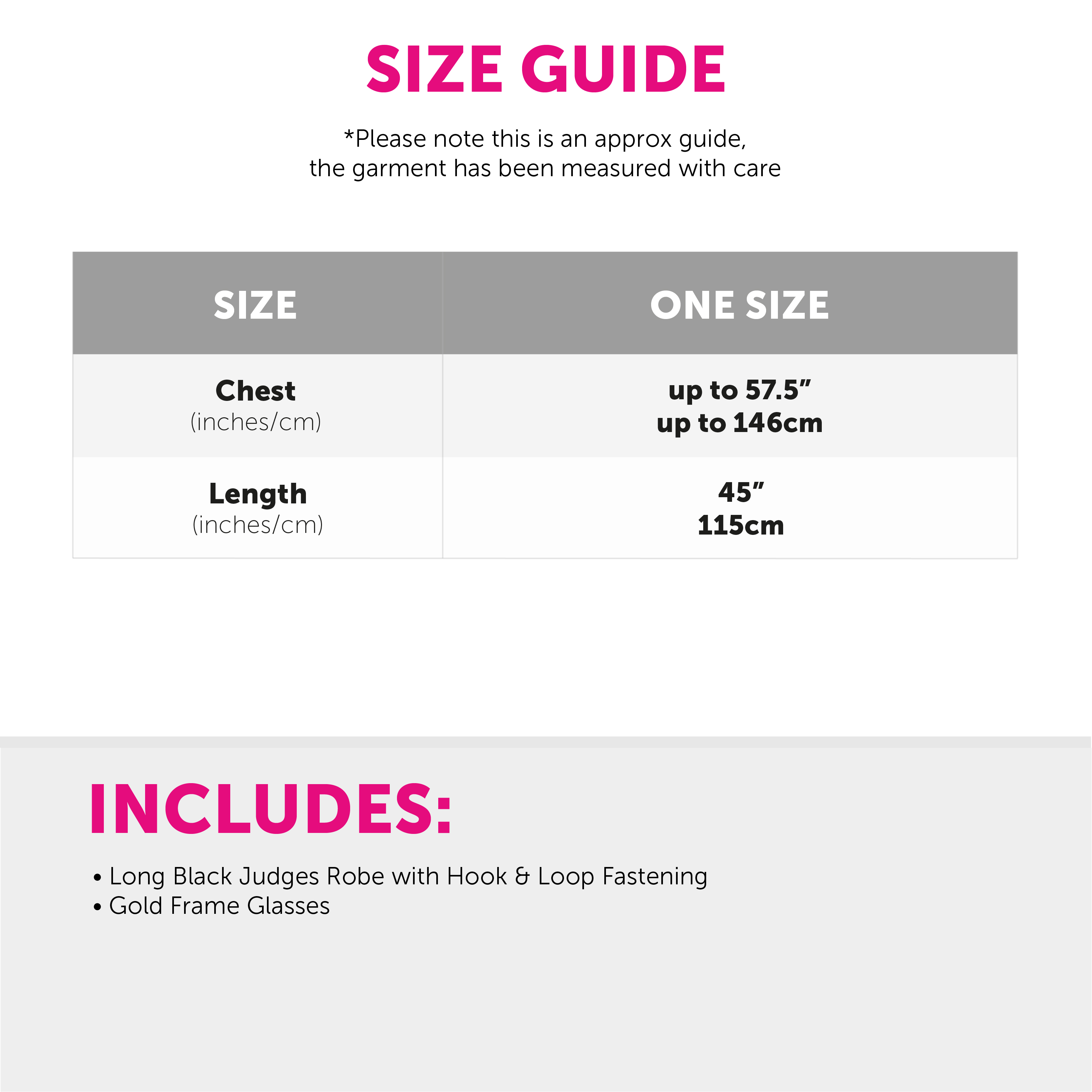 AVAILABLE IN ONE SIZE: The Adults Judge's Robe is available in just one size; Chest: up to 47" (120cm), Length: 45" (115cm), the perfect sized Costume for most Adults to wear comfortably!