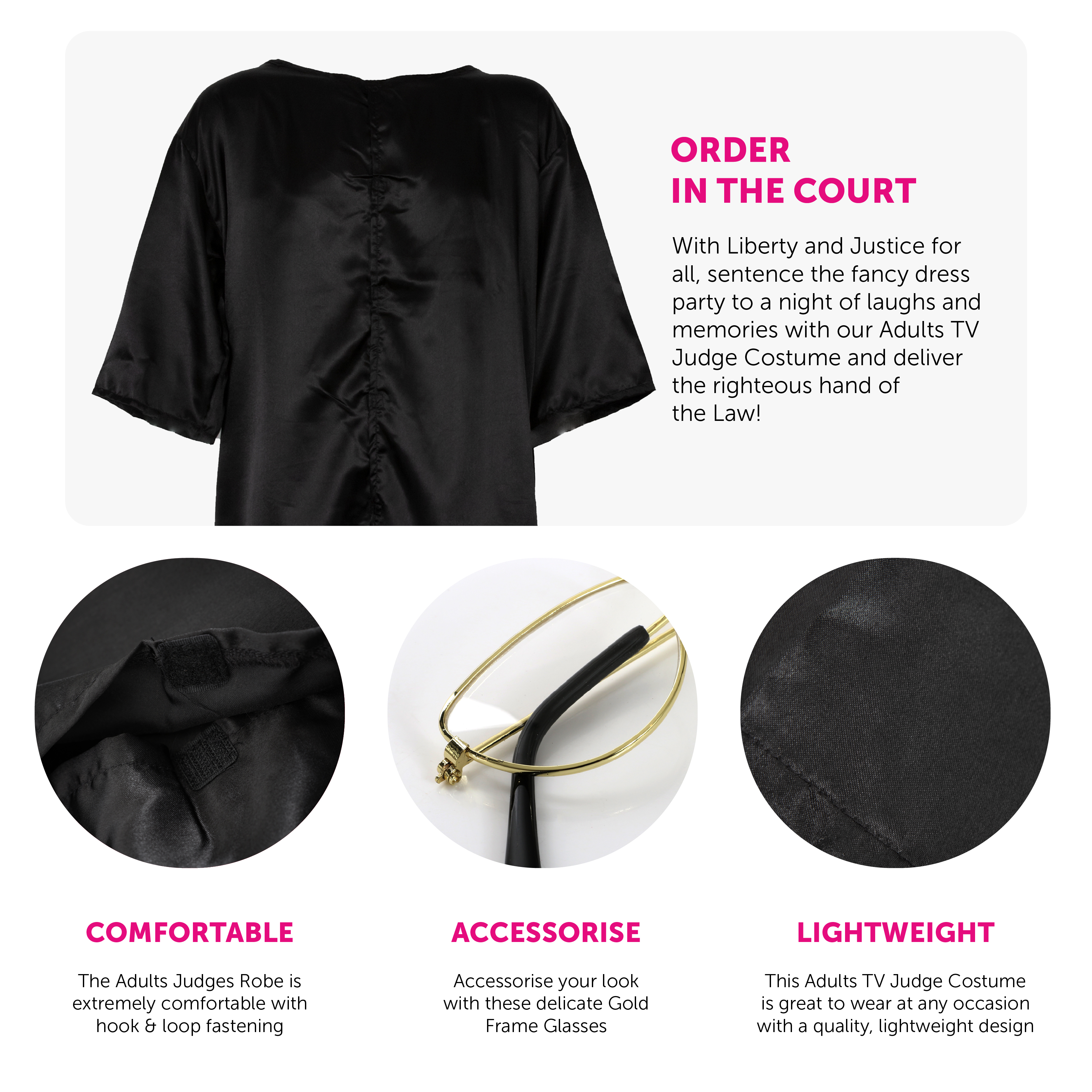 COSTUME INCLUDES: Your Adults TV Judge Costume includes Gold Framed Glasses, and a long Black Judges Robe with hook and loop fastening, great for any fancy dress occasion!
