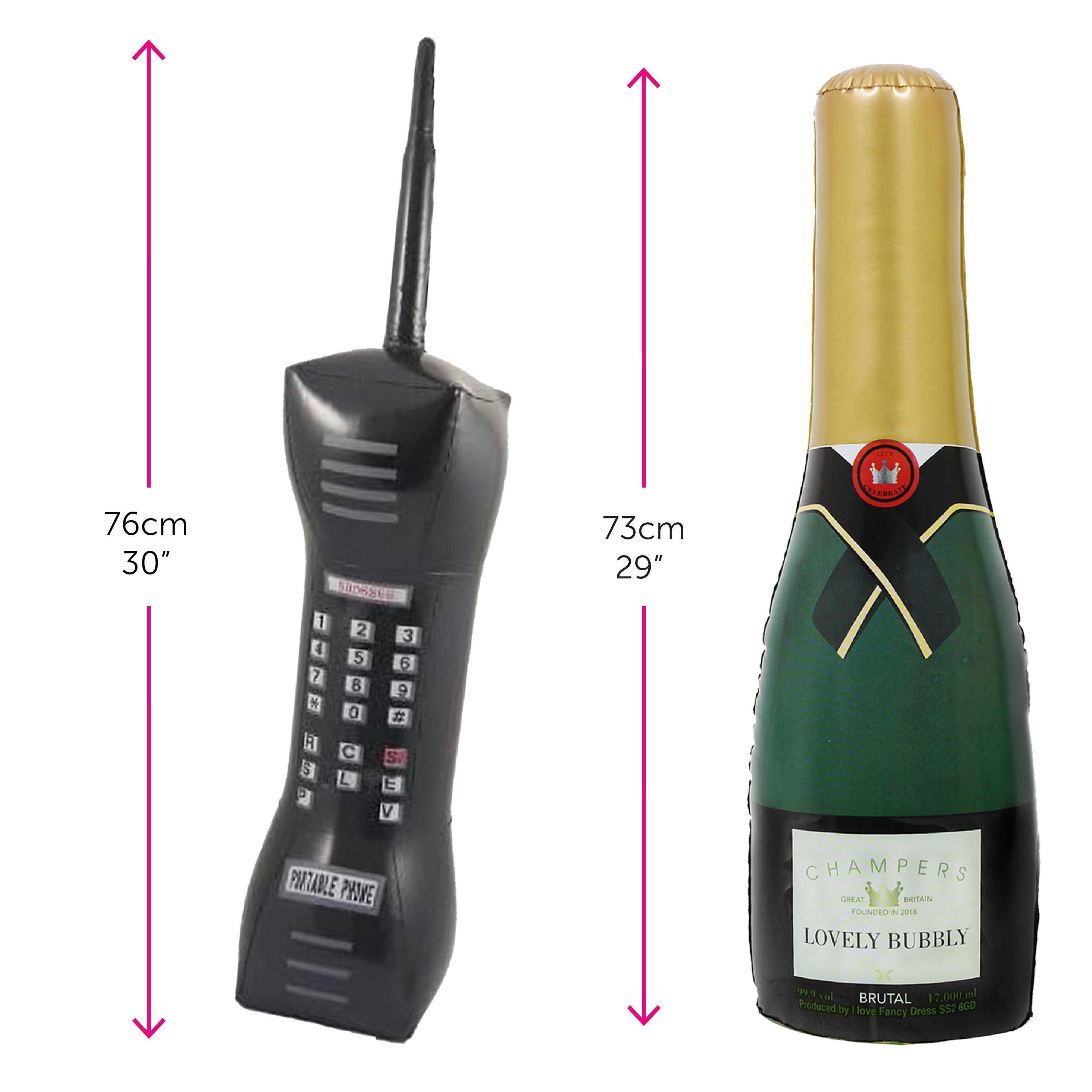 GREAT SIZED PROPS: The accessories in this Wall Street Wolf Costume set are the perfect size, with the Plastic Cigar measuring a length of 17cm (7"), the Inflatable Phone measuring a full length of 76cm (30") and the Inflatable Champagne Bottle measuring 73cm (29")!