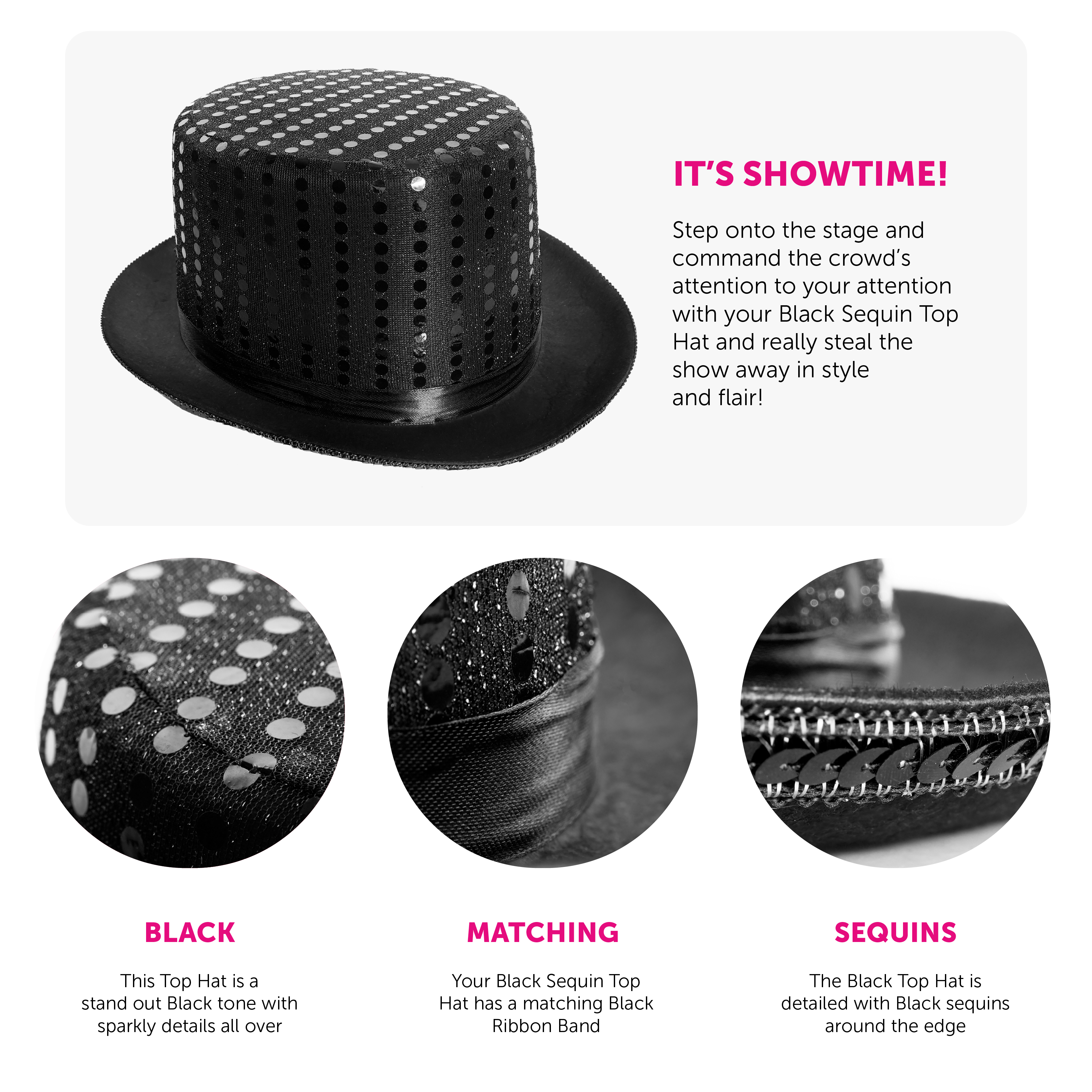 BLACK SEQUIN TOP HAT: Step onto the stage and command the crowd’s attention with your Black Sequin Top Hat and really steal the show away in style and flair!