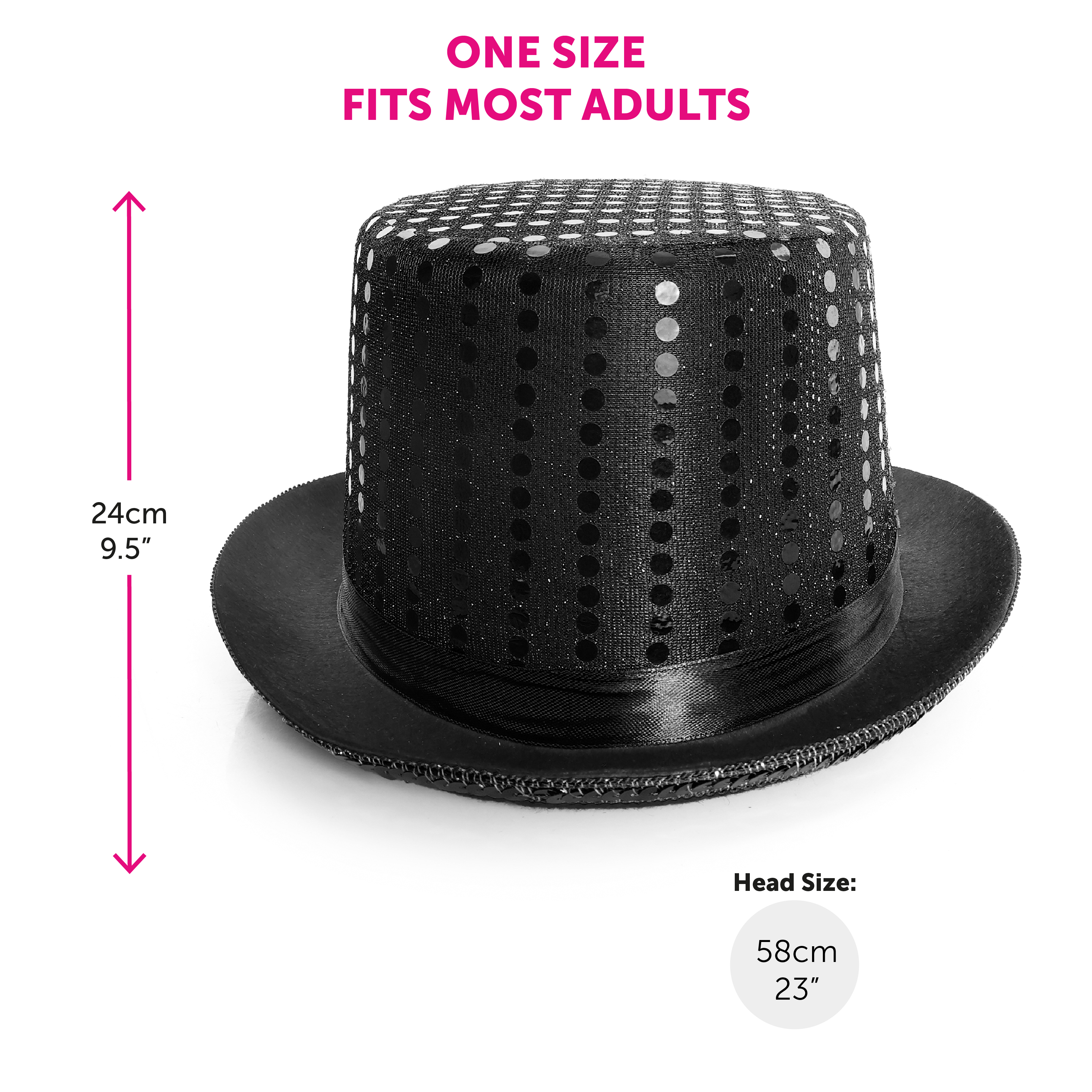 ONE SIZE FITS MOST: Your Black Sequin Hat stands at a height of 24cm (9.5") and has a head size of 58cm (23"), being one size makes it suitable for most Adults to wear comfortably!