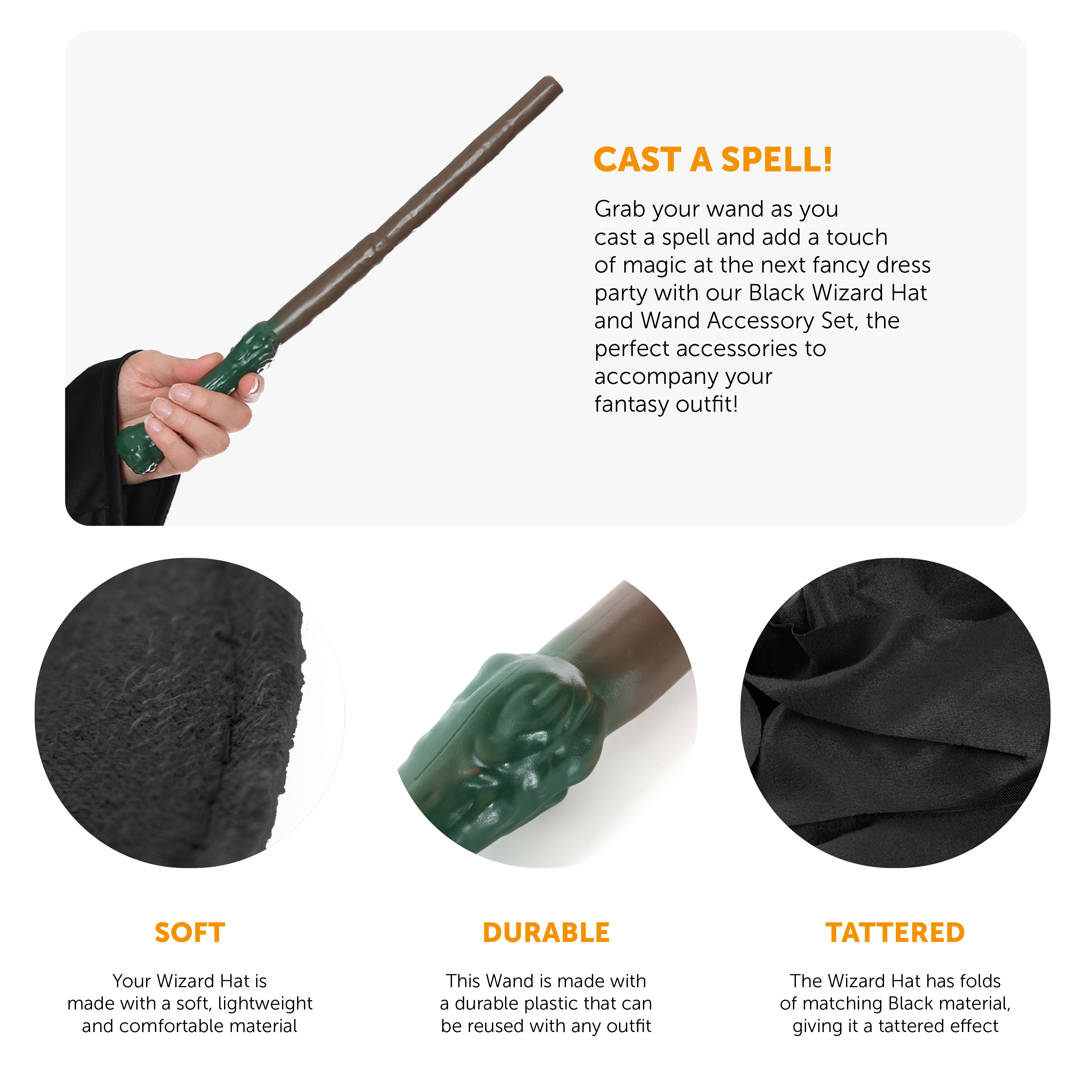 PERFECT FOR HALLOWEEN FANCY DRESS: Whether you're brewing a potion for Halloween or want that magical look at any other fancy dress event, there is no better accessory set than our Black Wizard Hat and Wand!