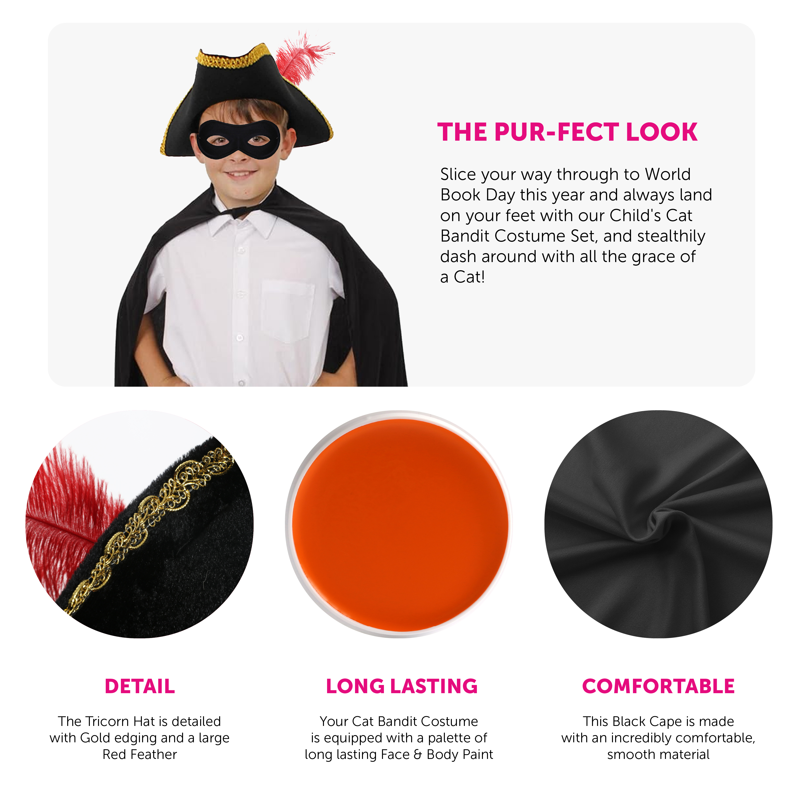 Your Child's Cat Bandit Costume Set includes a 3 Point Tricorn Hat with Gold detailing and a large Red Feather, an Inflatable Sword, a Black Eye Mask, a Black Cape, a palette of Orange Face Paint, and a Paper Ginger Cat Face Mask – the perfect finishing touch to bring your little feline bandit to life!