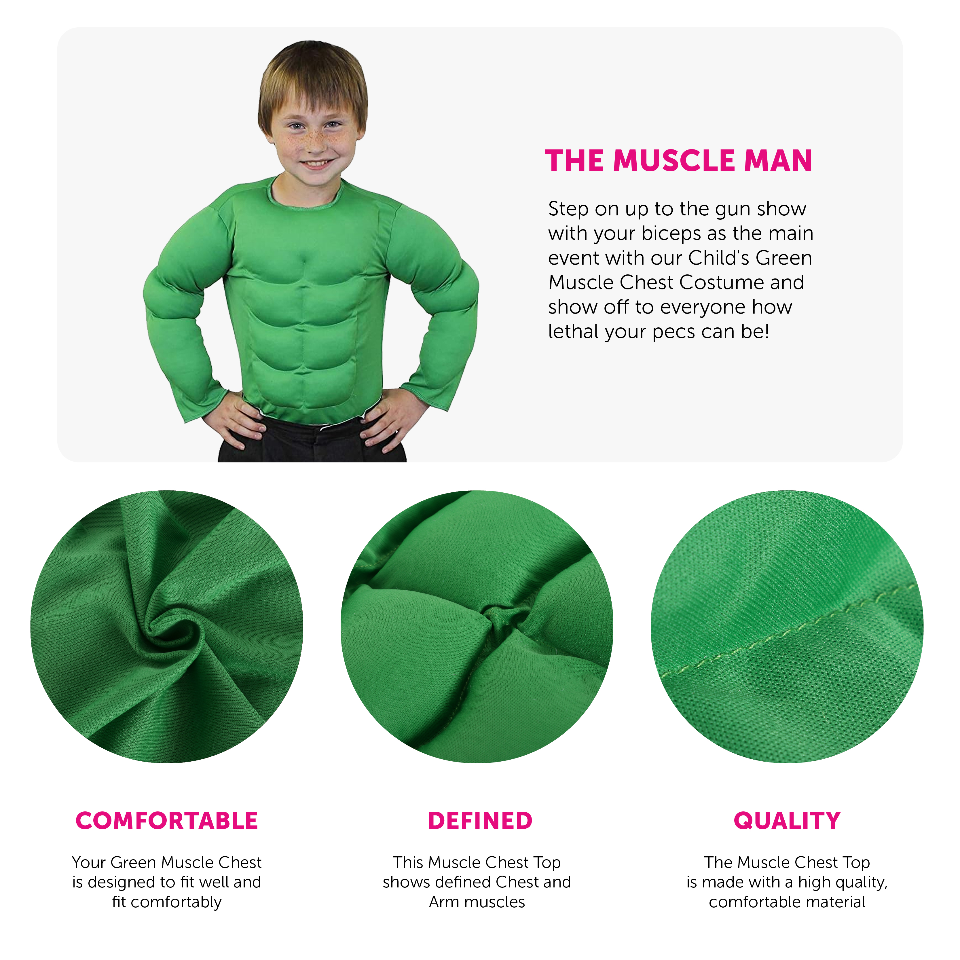 PERFECT FOR TV, FILM, AND NOVELTY EVENTS: Whether you’re playing the role of your own lovable action hero, or for a novelty costume to dress up as, you’ll be the main event regardless, with our Child's Green Muscle Chest Costume!