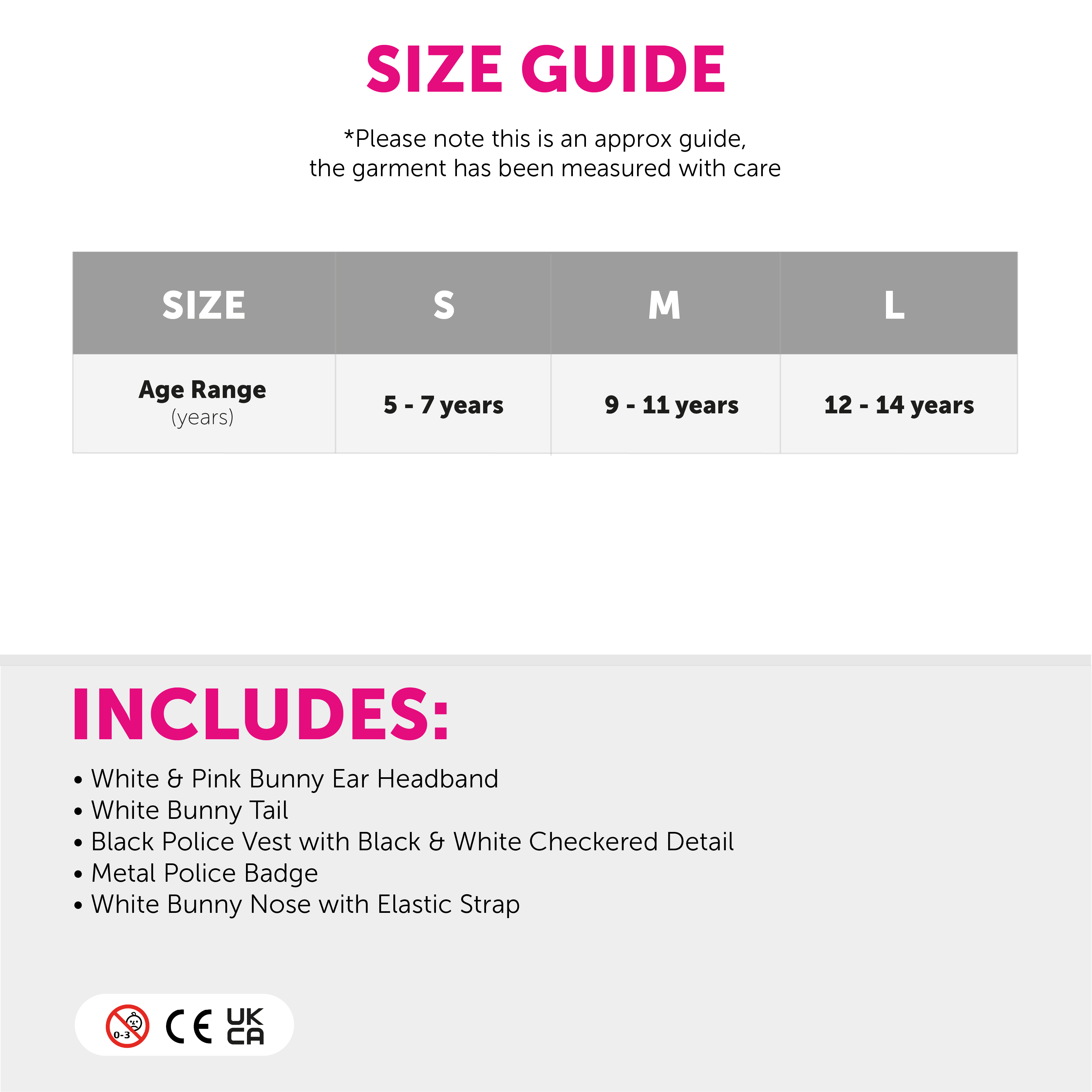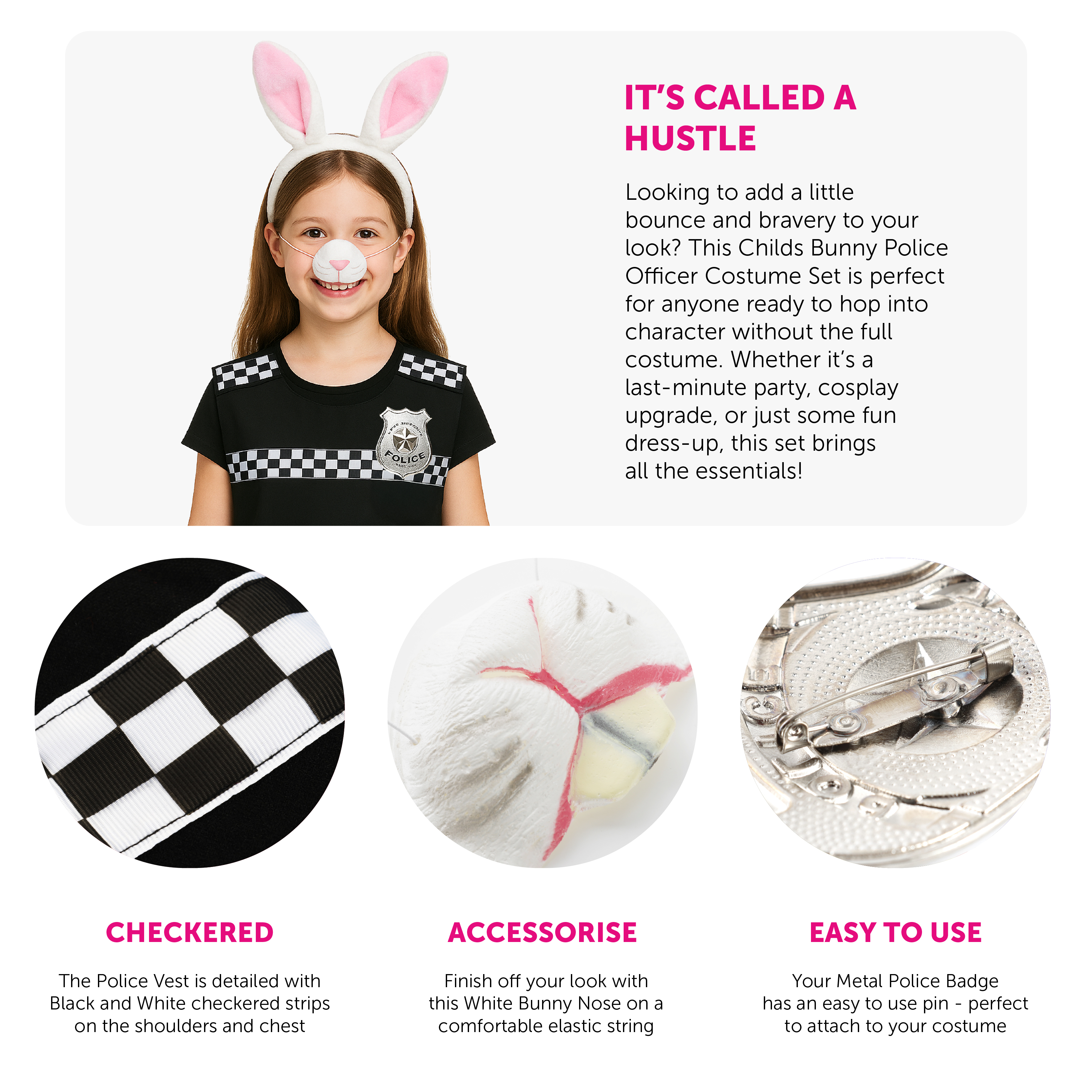 SET INCLUDES: This Childs Bunny Police Officer Accessory Set includes a White & Pink Bunny Ear Headband with a White Bunny Tail, a Black Police Vest with Checkered Black & White details, a metal pin badge with a large star and 'Special Police' on the front, and a White Bunny Nose, the perfect way to finish off your outfit!