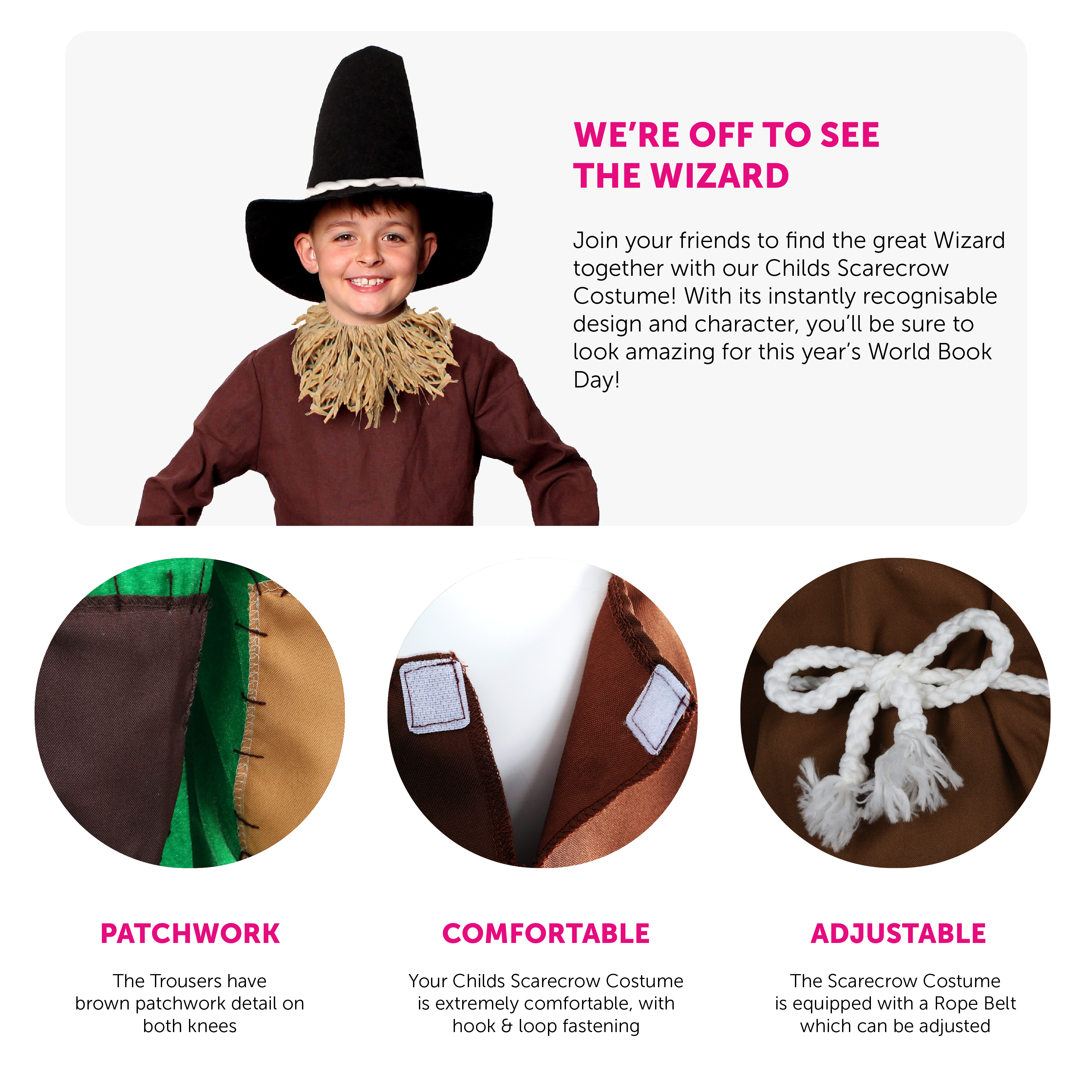 CHILDS SCARECROW COSTUME: Join your friends to find the great Wizard together with our Childs Scarecrow Costume! With its instantly recognisable design and character, you’ll be sure to look amazing for this year’s World Book Day!