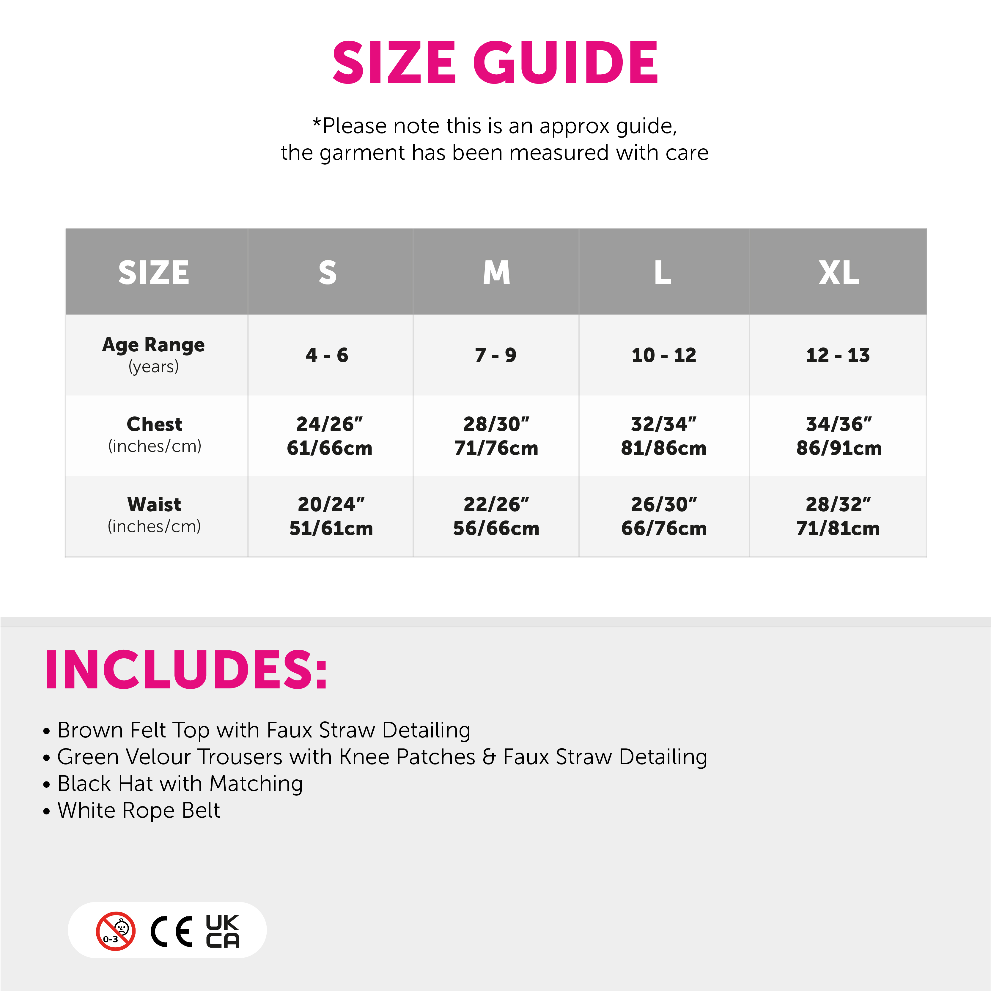 AVAILABLE IN MULTIPLE SIZES: This Childs Scarecrow Costume is available in multiple sizes from Small – X-Large: Small - 4-6 Years: Chest: 24-26"/61-66cm, Waist: 20-24"/51-61cm | Medium - 7-9 Years: Chest: 28-30"/71-76cm, Waist: 22-26"/56-66cm | Large - 10-12 Years: Chest: 32-34"/81-86cm, Waist: 26-30"/66-76cm | X-Large - 12-13 Years: Chest: 34-36"/86-91cm, Waist: 28-32"/71-81cm