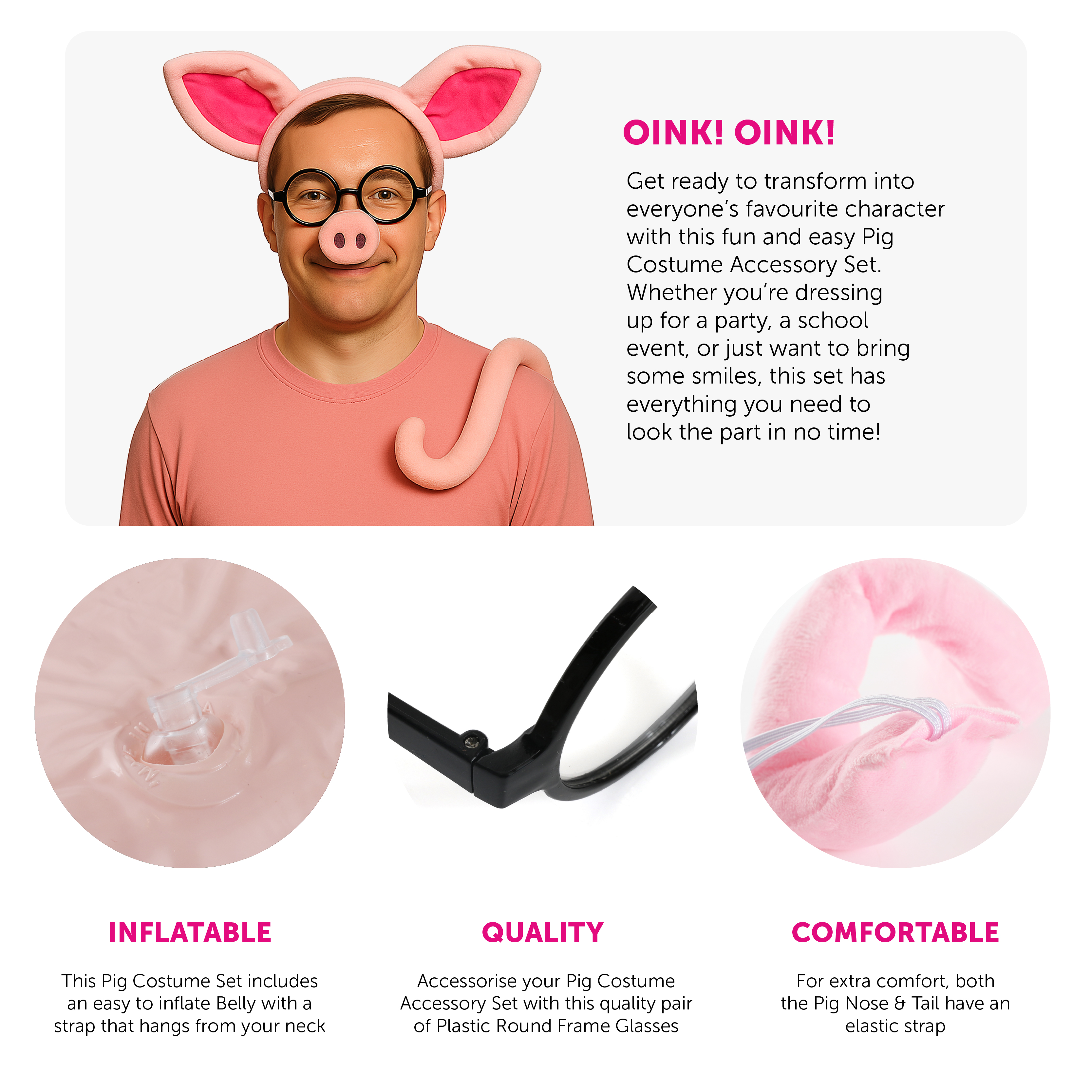 SET INCLUDES: Your Pig Accessory Set includes a Pink Pig Ear Headband, an elasticated Pink Pig Nose, an elasticated curly Pink Pig Tail, a pair of Plastic Round Frame Glasses, and an Inflatable Belly with an attached strap!