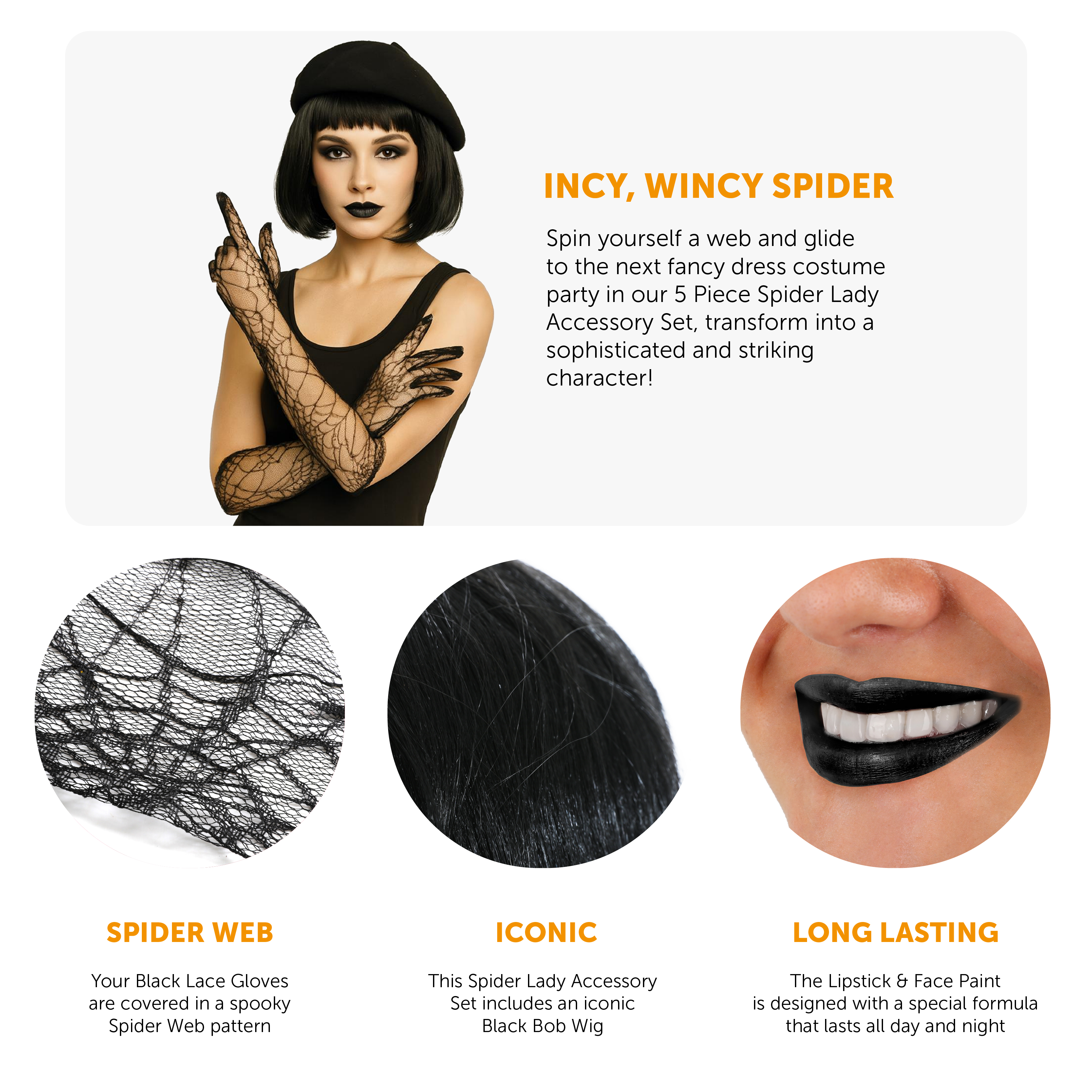 SET INCLUDES: This 5 Piece Peach Spider Lady Accessory Set includes a pair of elegant, long Black Gloves with a lace design, styled into a Spider Web pattern all over, a Plain Black Beret, a Short Black Bob Wig, a palette of White Face & Body Paint, and Black Lipstick, the perfect addition to any fancy dress Costume this year!