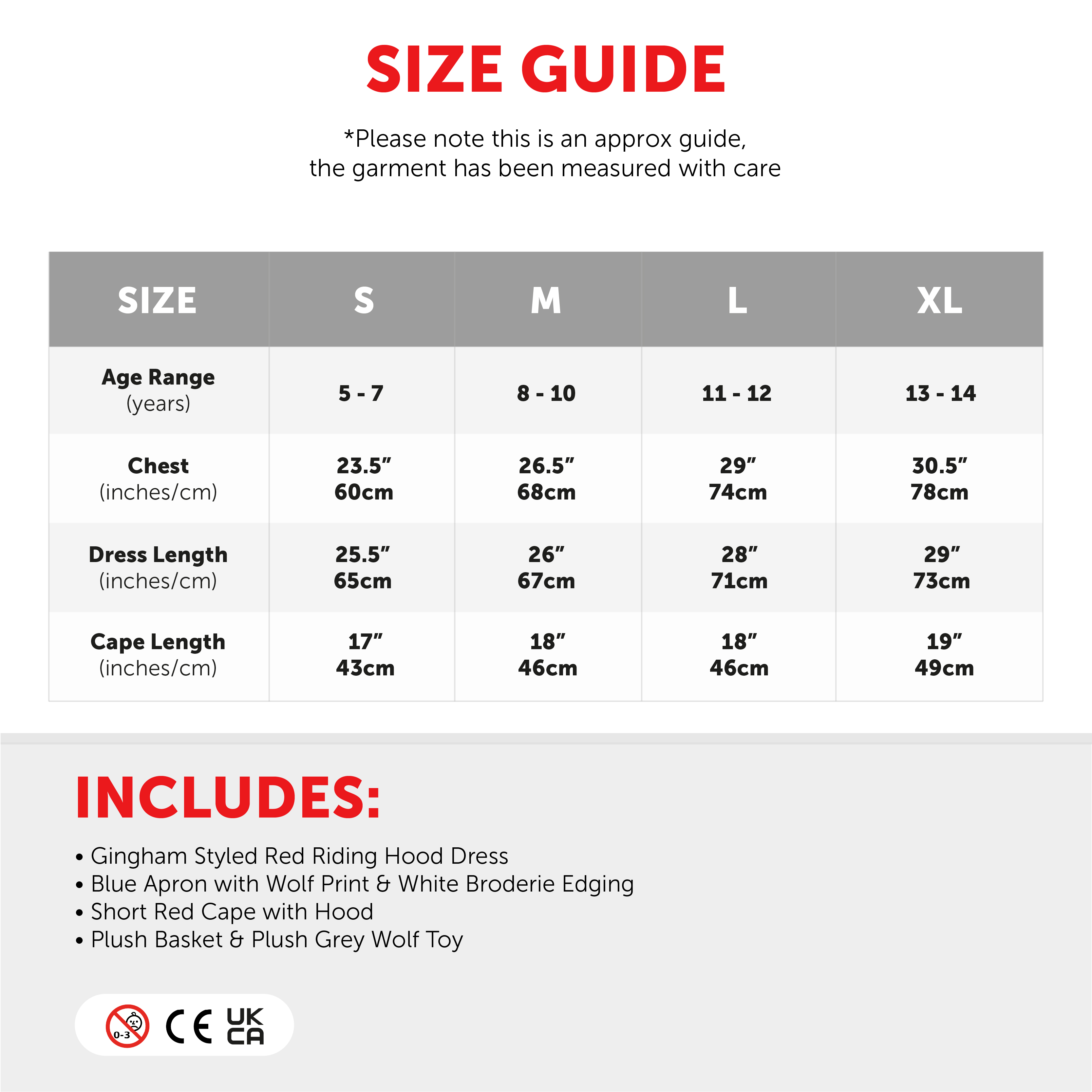 AVAILABLE IN MULTIPLE SIZES: Your Child’s Red Riding Costume is available in multiple sizes from Small to X-Large: Small (5 - 7 years) Chest 23.5" (60cm), Dress Length 25.5" (65cm), Cape Length 17" (43cm) | Medium (8 - 10 years) Chest 26.5" (68cm), Dress Length 26" (67cm), Cape Length 18" (46cm) | Large (11 - 12 years) Chest 29" (74cm), Dress Length 28" (71cm), Cape Length 18" (46cm) | X Large (13 - 14 years) Chest 30.5" (78cm), Dress Length 29" (73cm), Cape Length 19" (49cm)