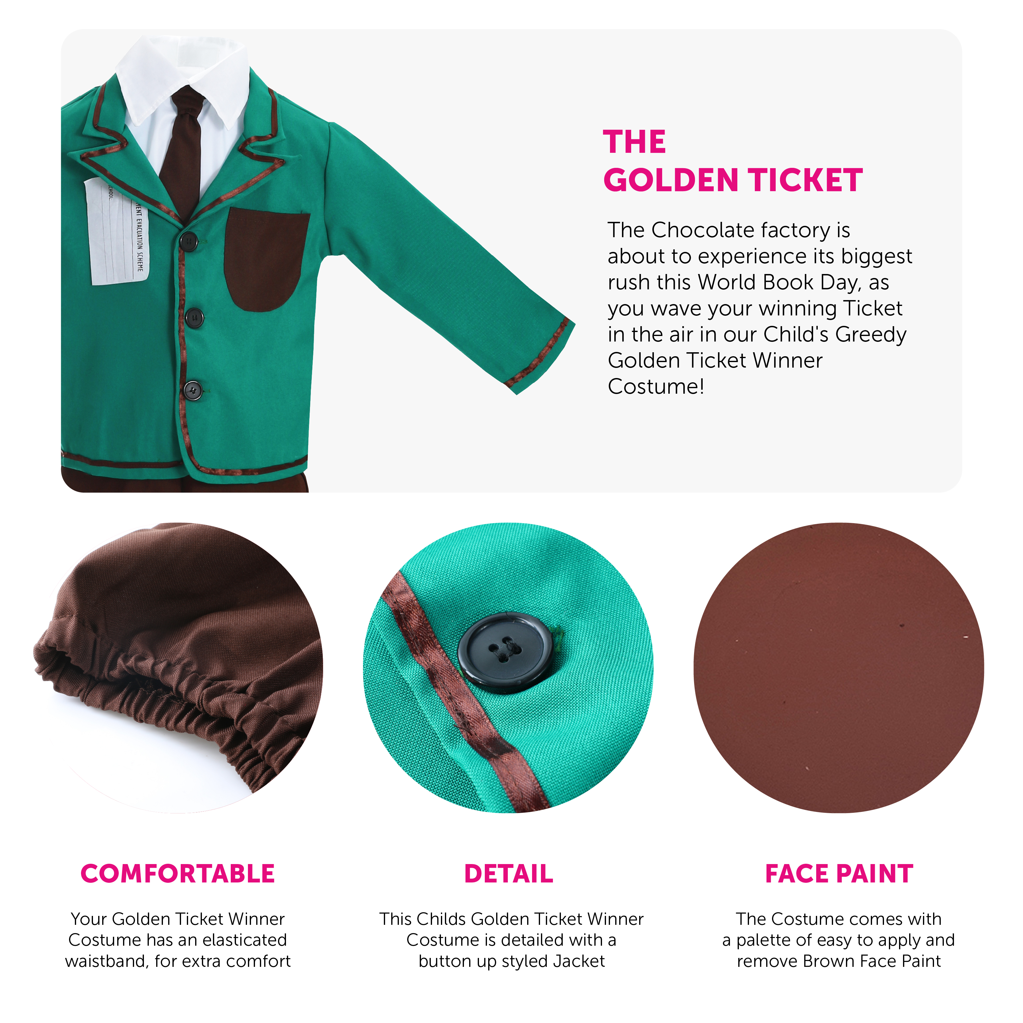 CHILD'S GREEDY GOLDEN TICKET WINNER COSTUME: The Chocolate factory is about to experience its biggest rush this World Book Day, as you wave your winning Ticket in the air in our Child's Greedy Golden Ticket Winner Costume!