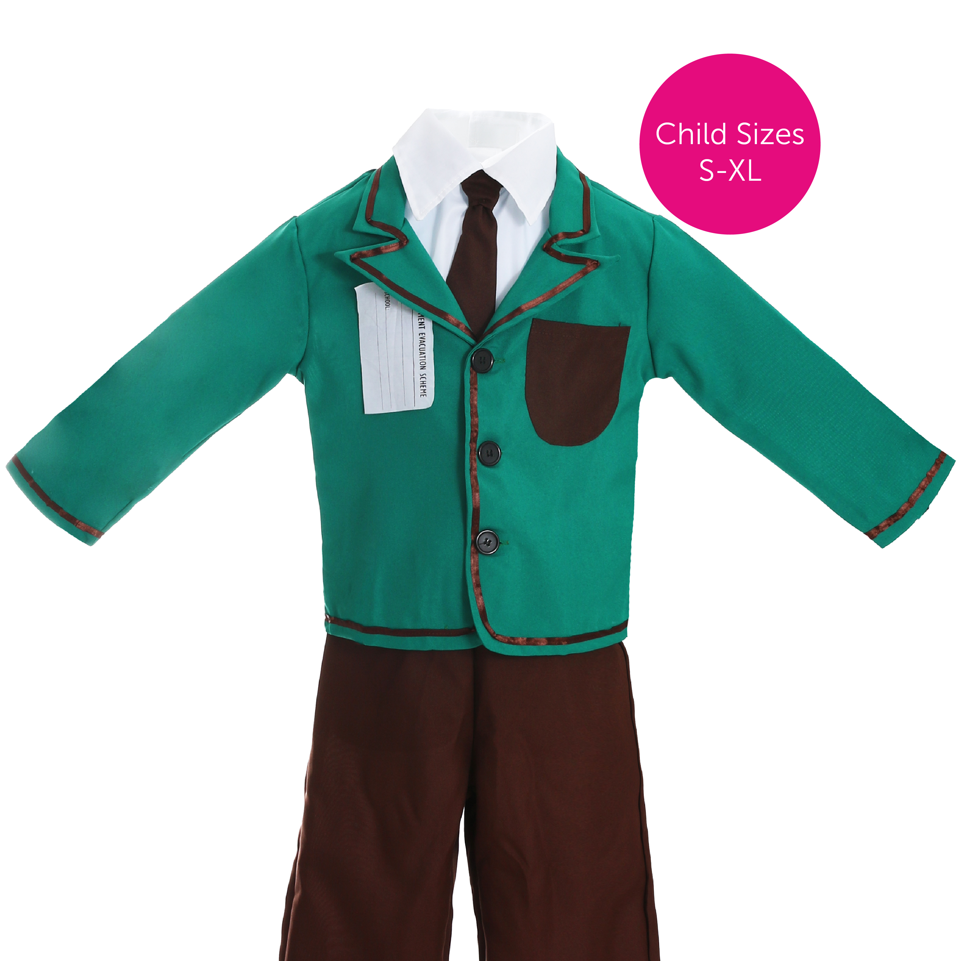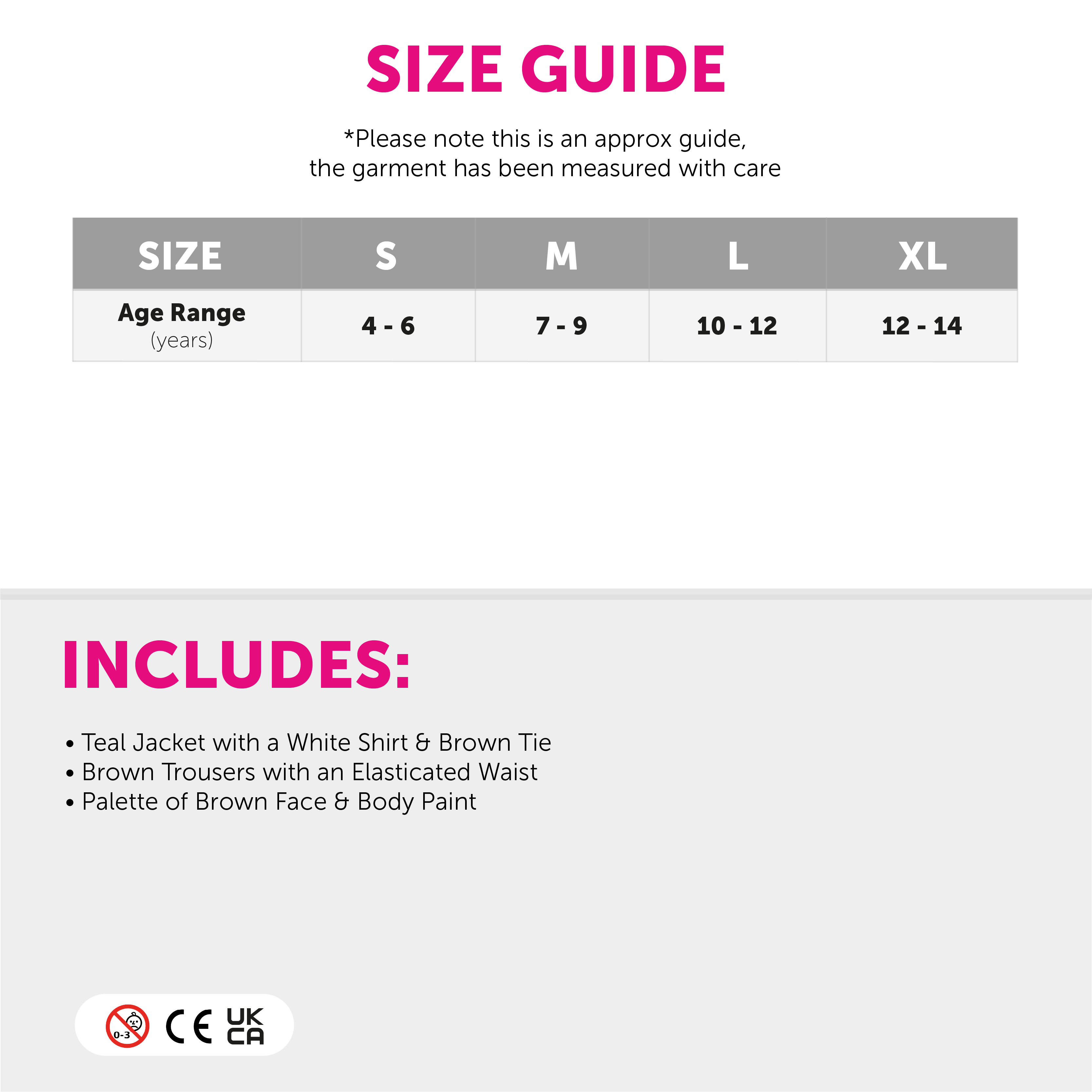 GREEDY GOLDEN TICKET WINNER COSTUME INCLUDES: Your Child's Greedy Golden Ticket Winner Costume includes a Teal and Brown Jacket with an attached White Shirt Front & Brown Tie, a pair of Brown Trousers and a palette of Brown Face Paint, to finish off your outfit!