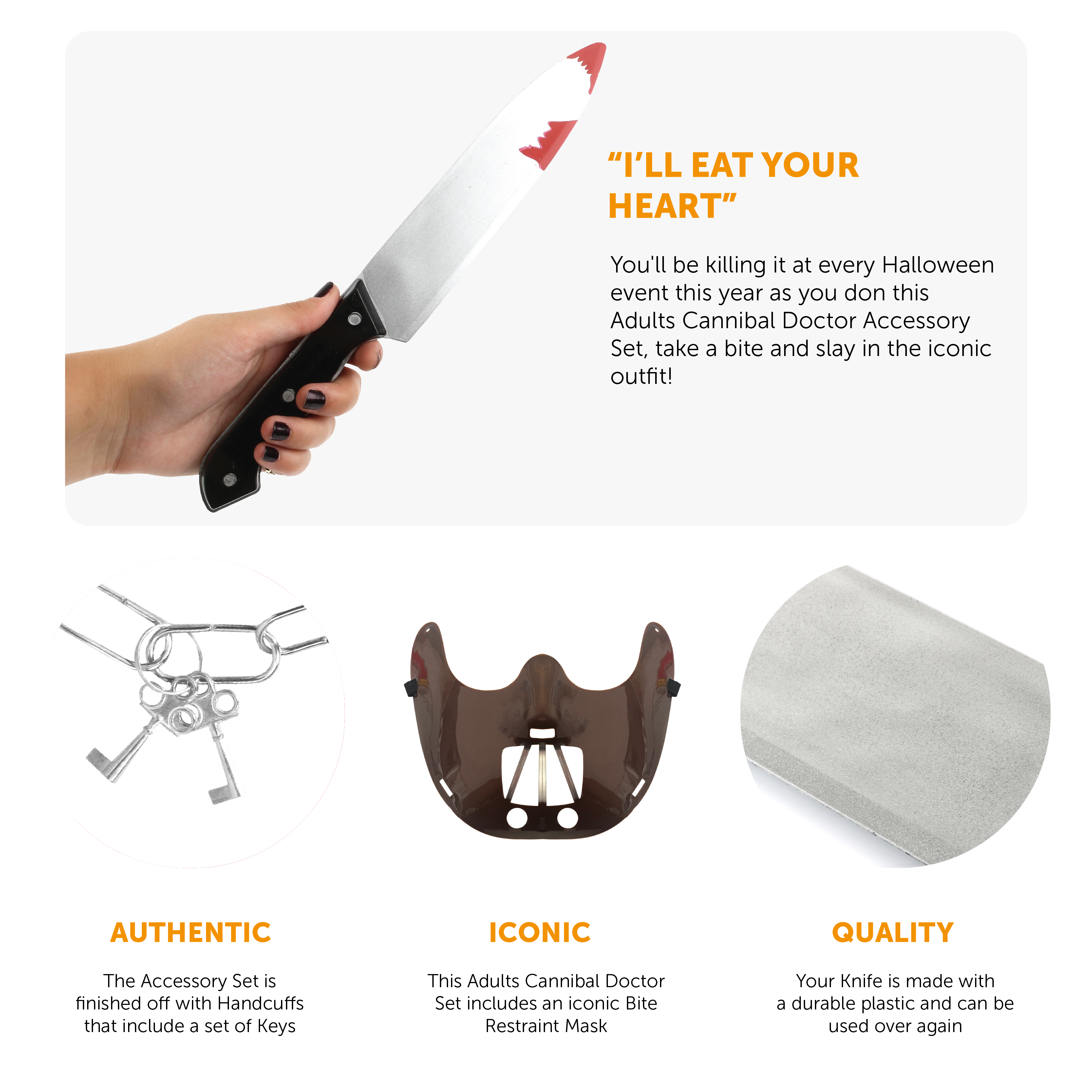 SET INCLUDES: This Adults Cannibal Doctor Accessory Set includes Silver Metal Handcuffs with a Key, an iconic Brown Bite Restraint Mask and a Plastic Knife with Blood Stains on the Silver Blade, the perfect Costume this Halloween!